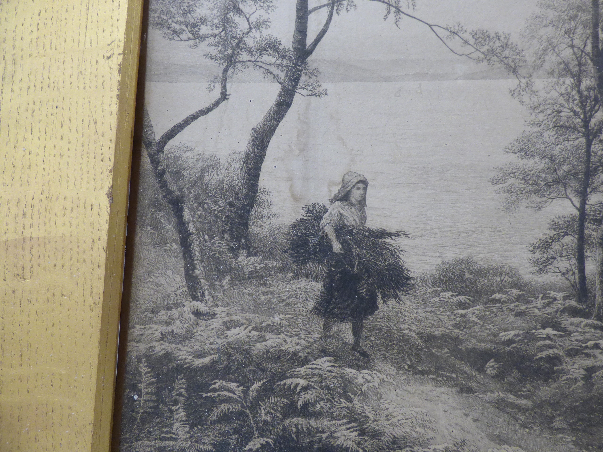 A framed monochrome print depicting a landscape with a figure carrying bundles through trees by a lake, Silver Seas – Silver Bushes, featuring a gold-coloured frame and signed ‘MacWhir’ in the lower left corner. 49.5x67cm