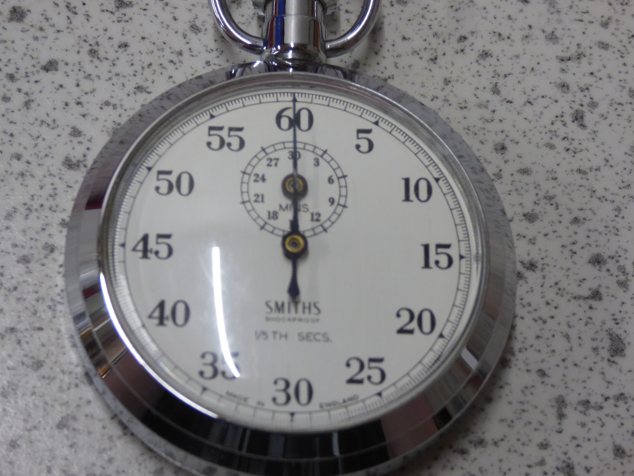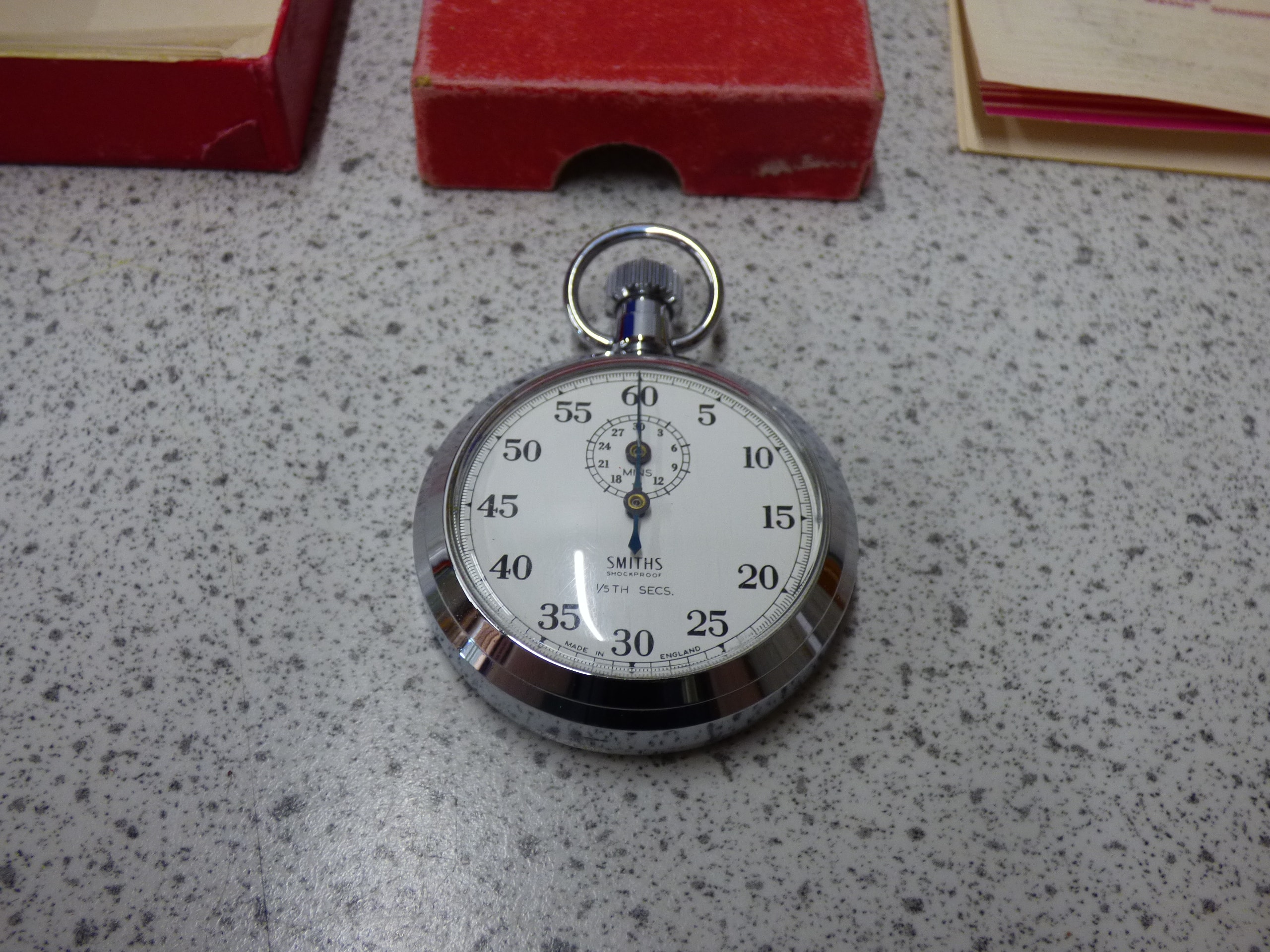 A silver-toned Smiths Shockproof 1/5th Secs. stopwatch features a white dial marked “SMITHS”, “SHOCKPROOF”, and “MADE IN ENGLAND”, accompanied by its red “SMITHS” box and a beige Smiths Clock & Watch Division guarantee leaflet.