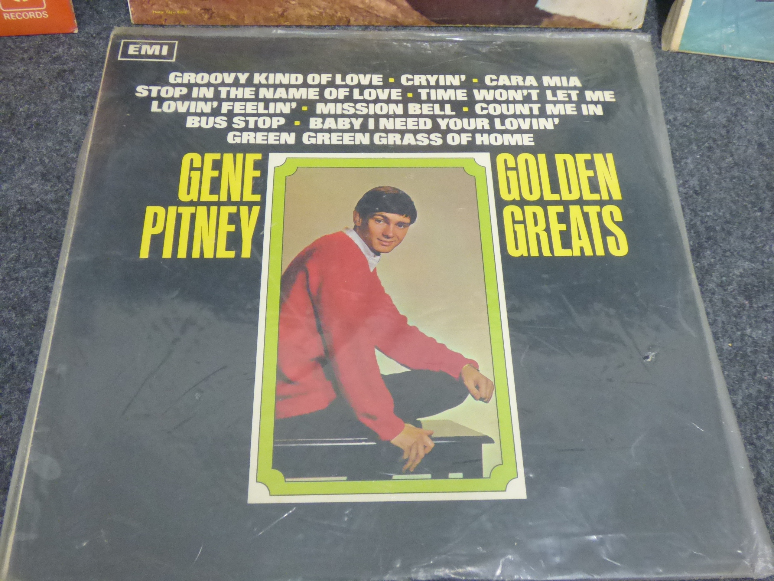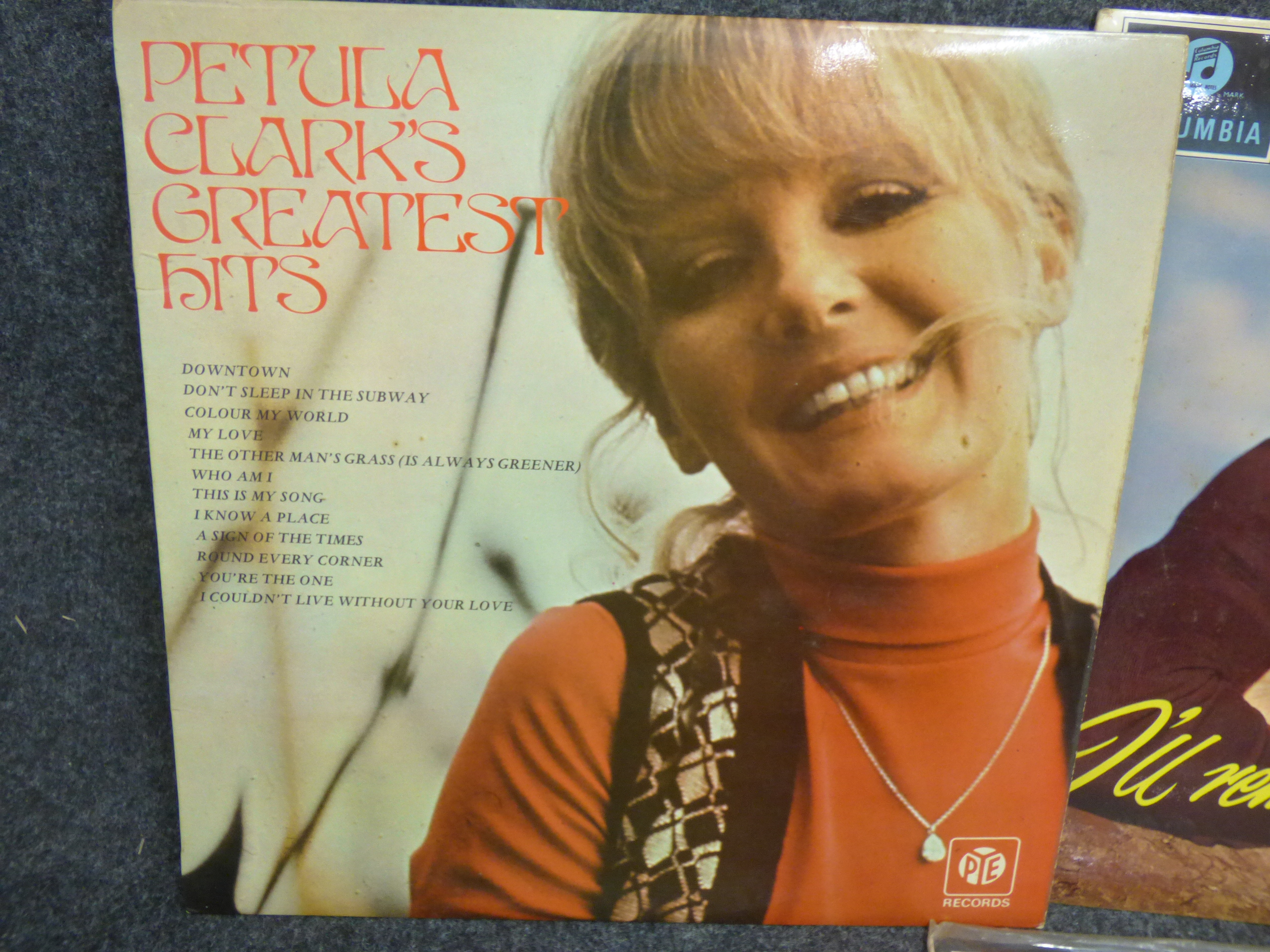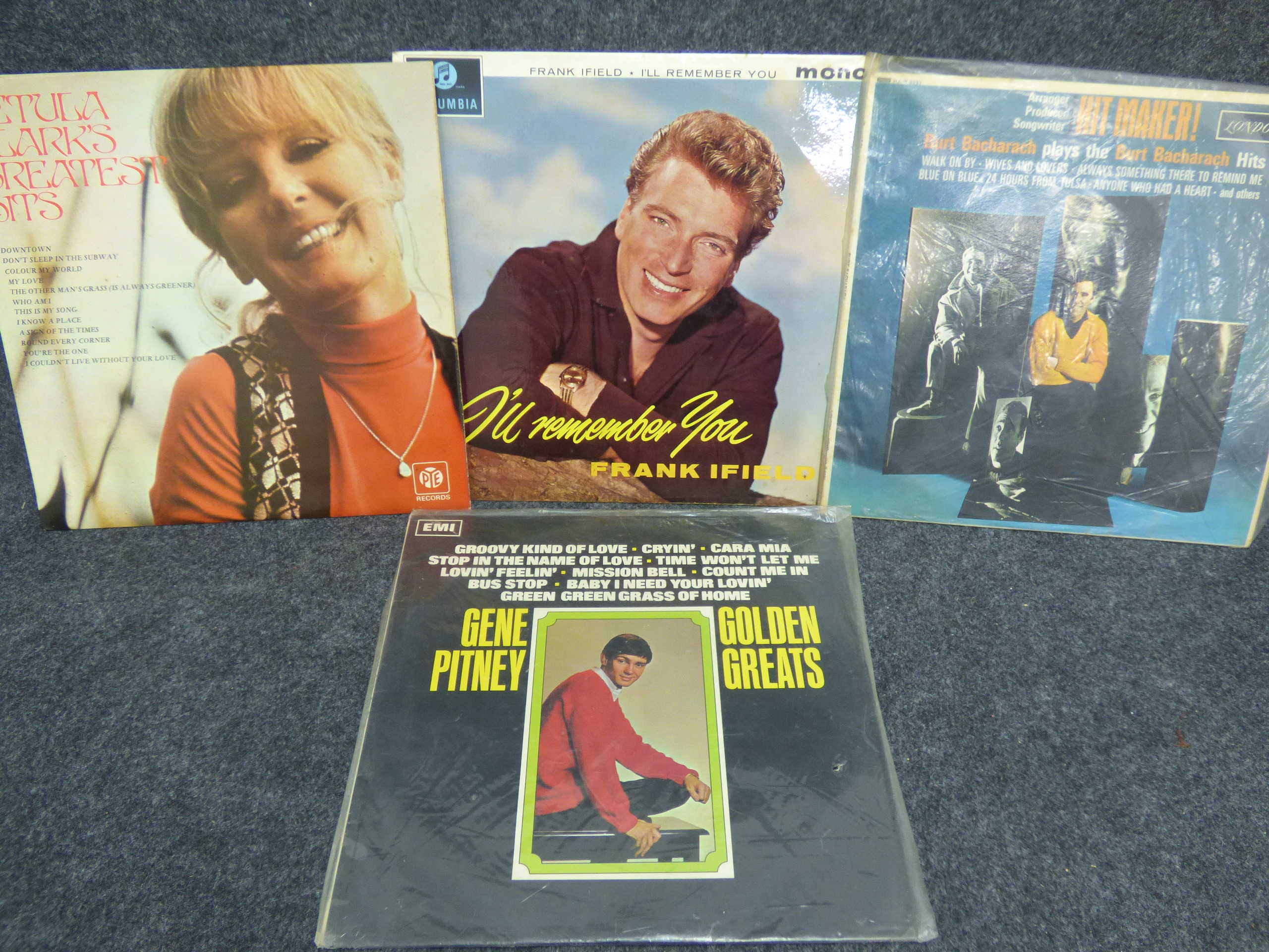 A collection of multi-colored vinyl record albums featuring Petula Clark’s Greatest Hits, Frank Ifield’s I’ll Remember You, Burt Bacharach’s Hit Maker!, and Gene Pitney’s Golden Greats.