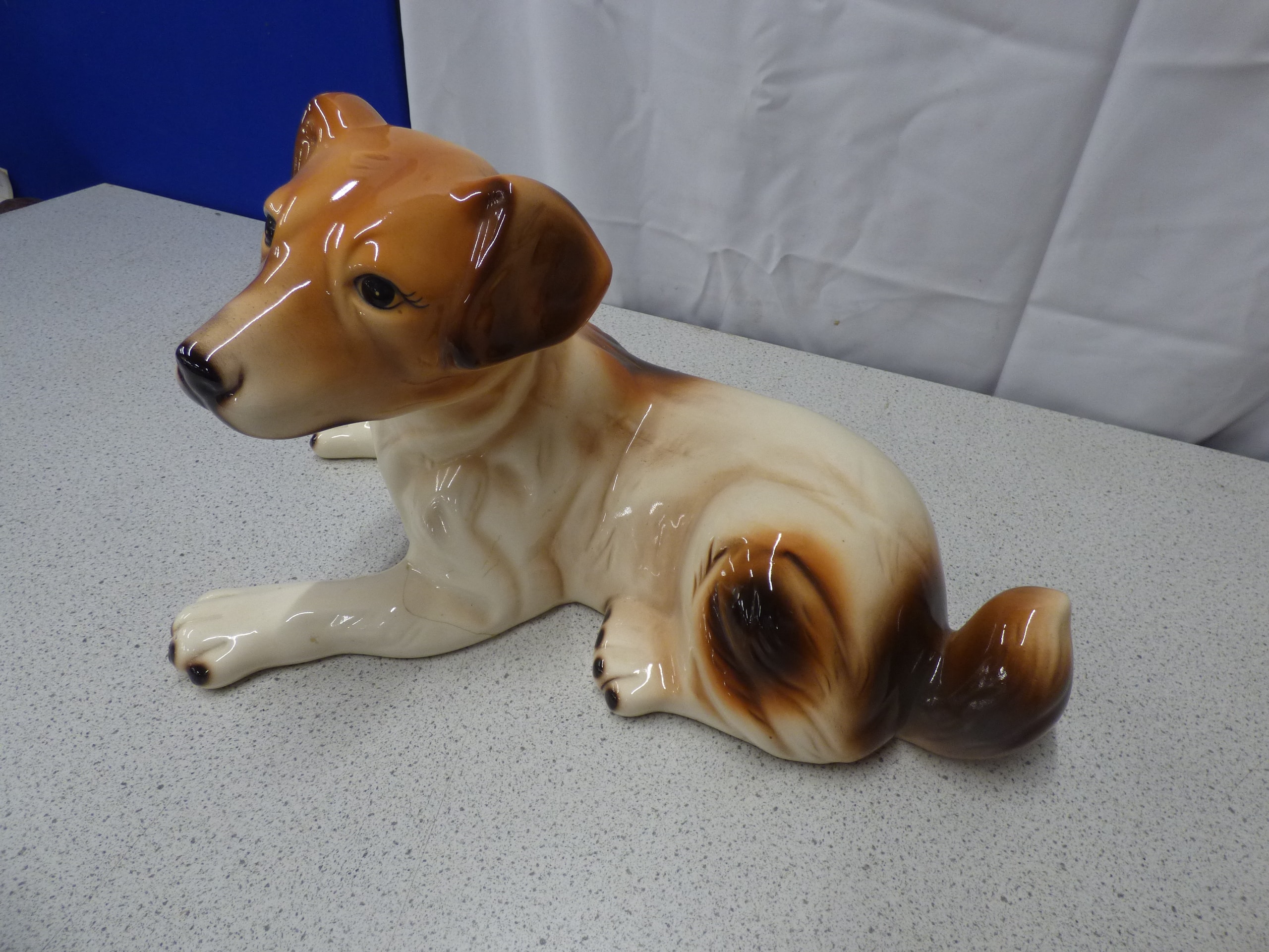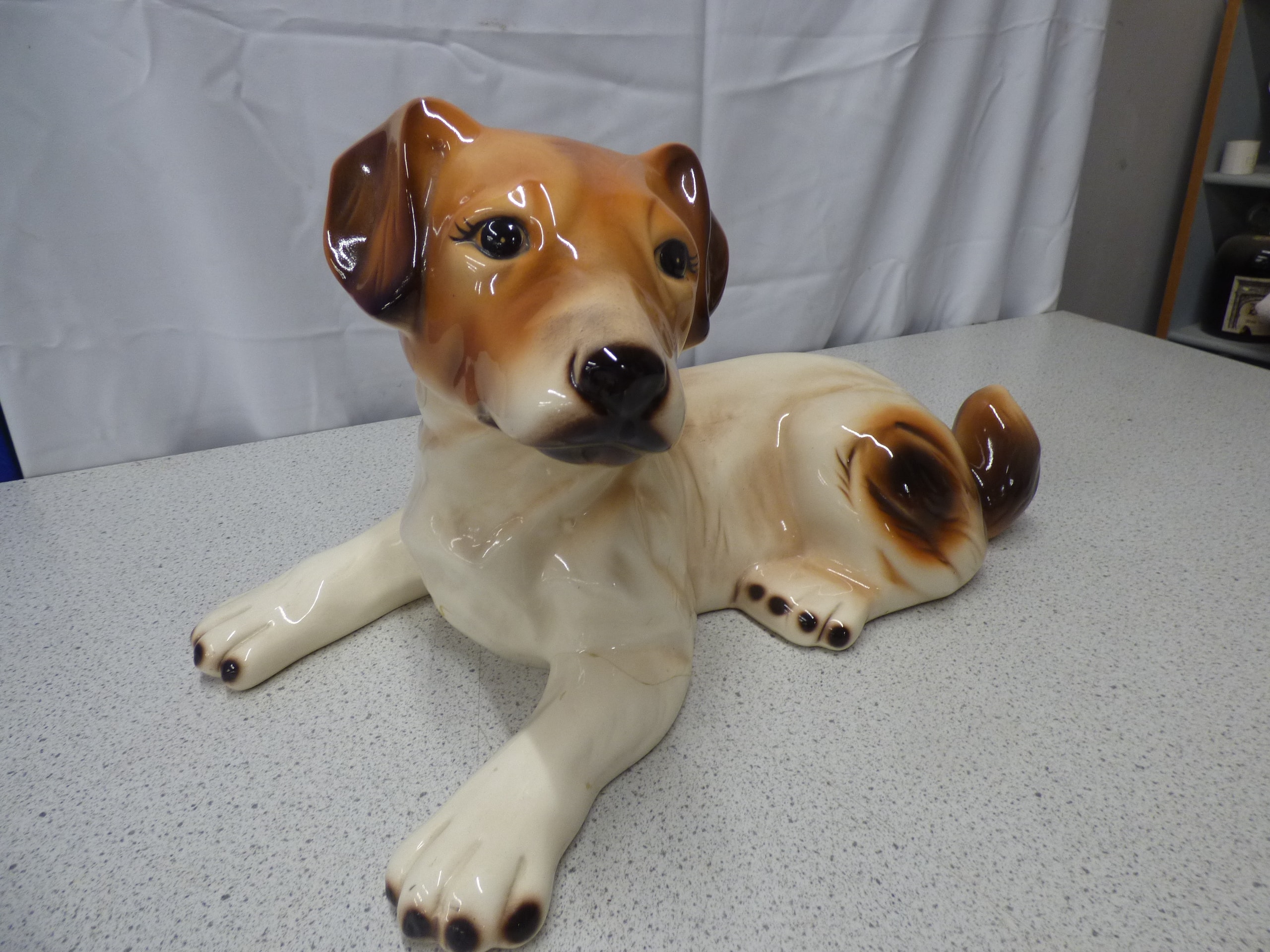 A white, brown, and tan glossy ceramic figurine of a Jack Russell Terrier dog, inscribed “Jack Russell Terrier” and “MADE IN JAPAN” on its underside. 19.5cm wide, 12cm Tall. Paw has repair