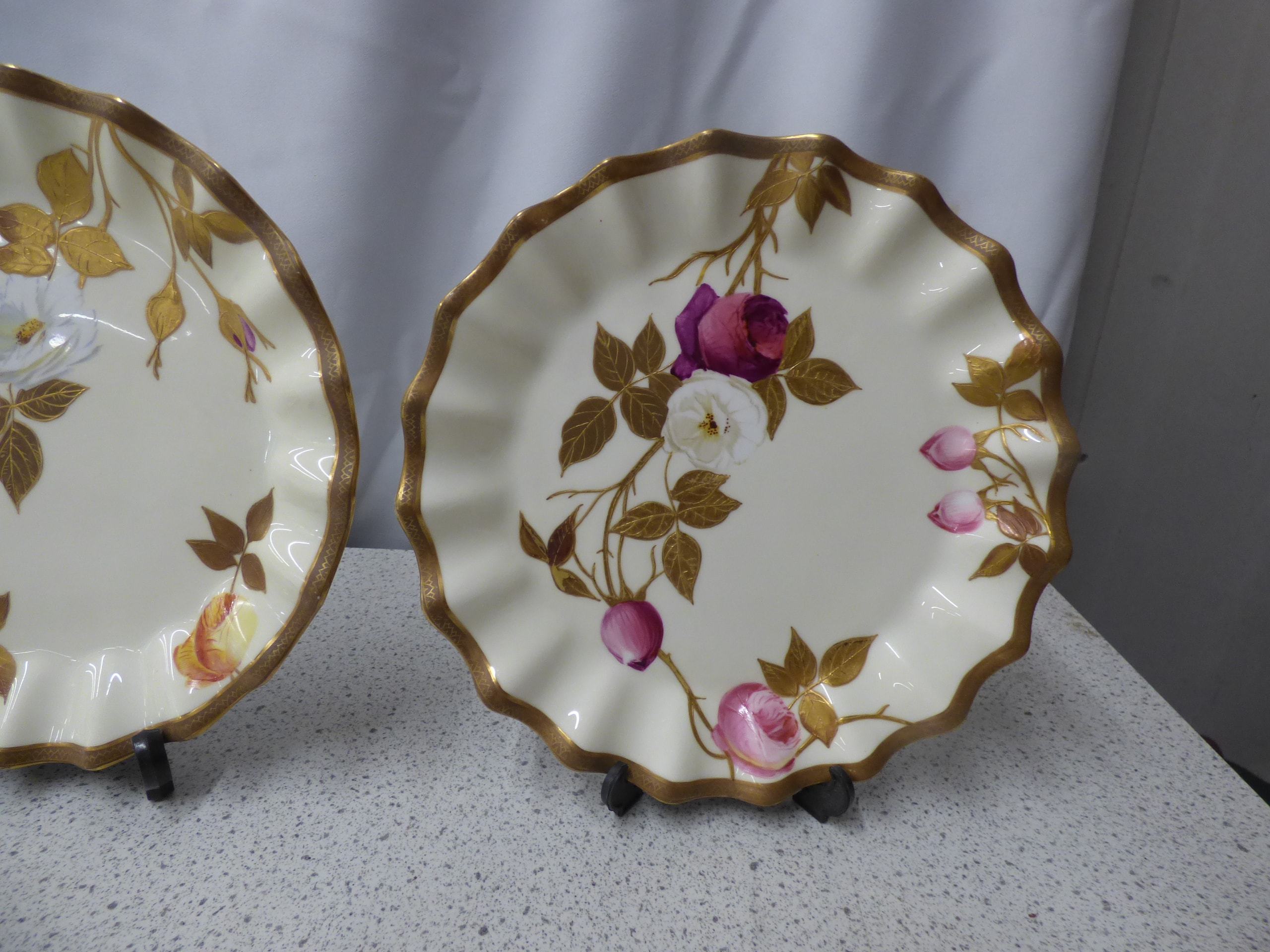 Five Bodley decorative scalloped plates, off-white/cream with gold leaf trim and painted pink, purple, and yellow roses. 8.5cm Dia