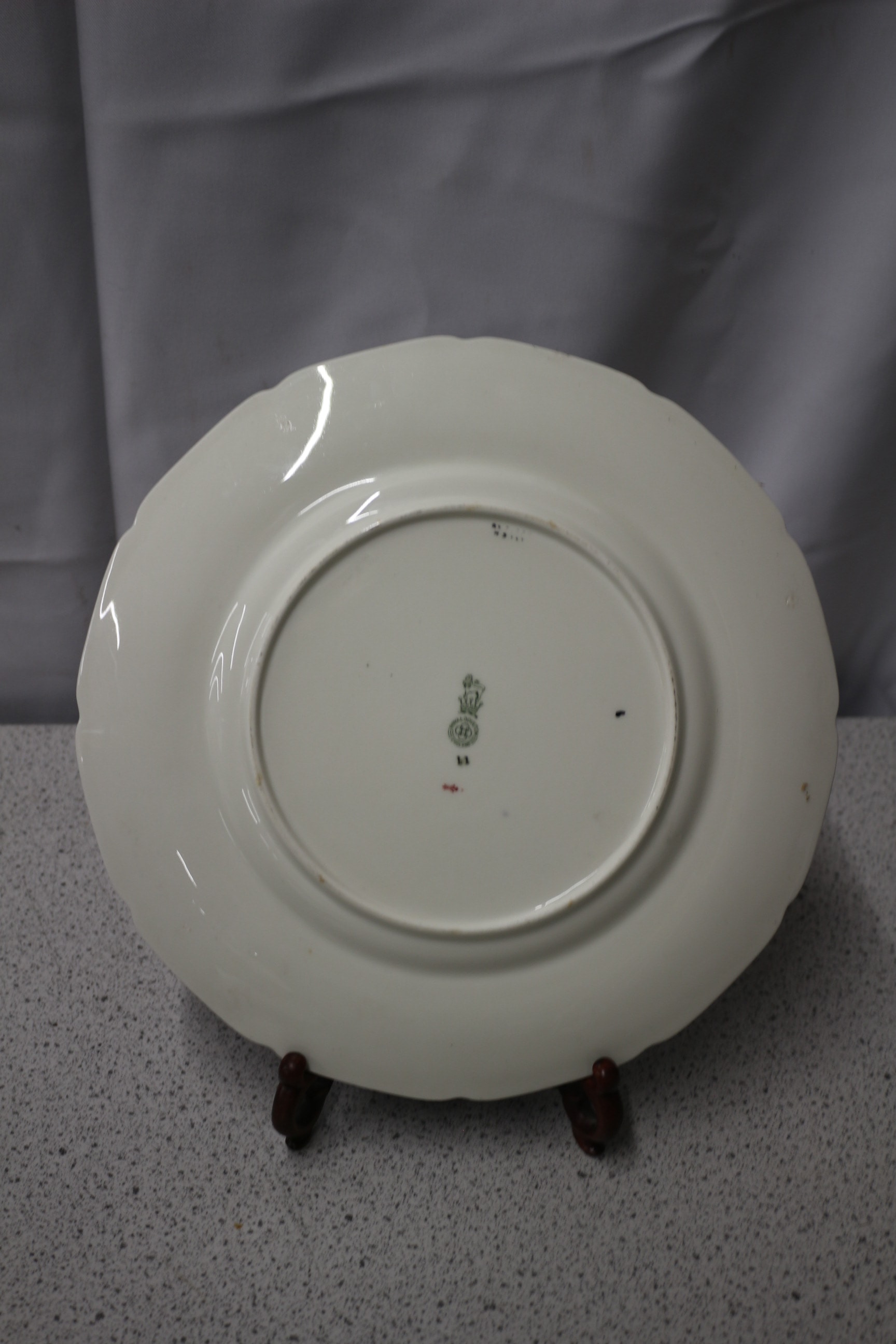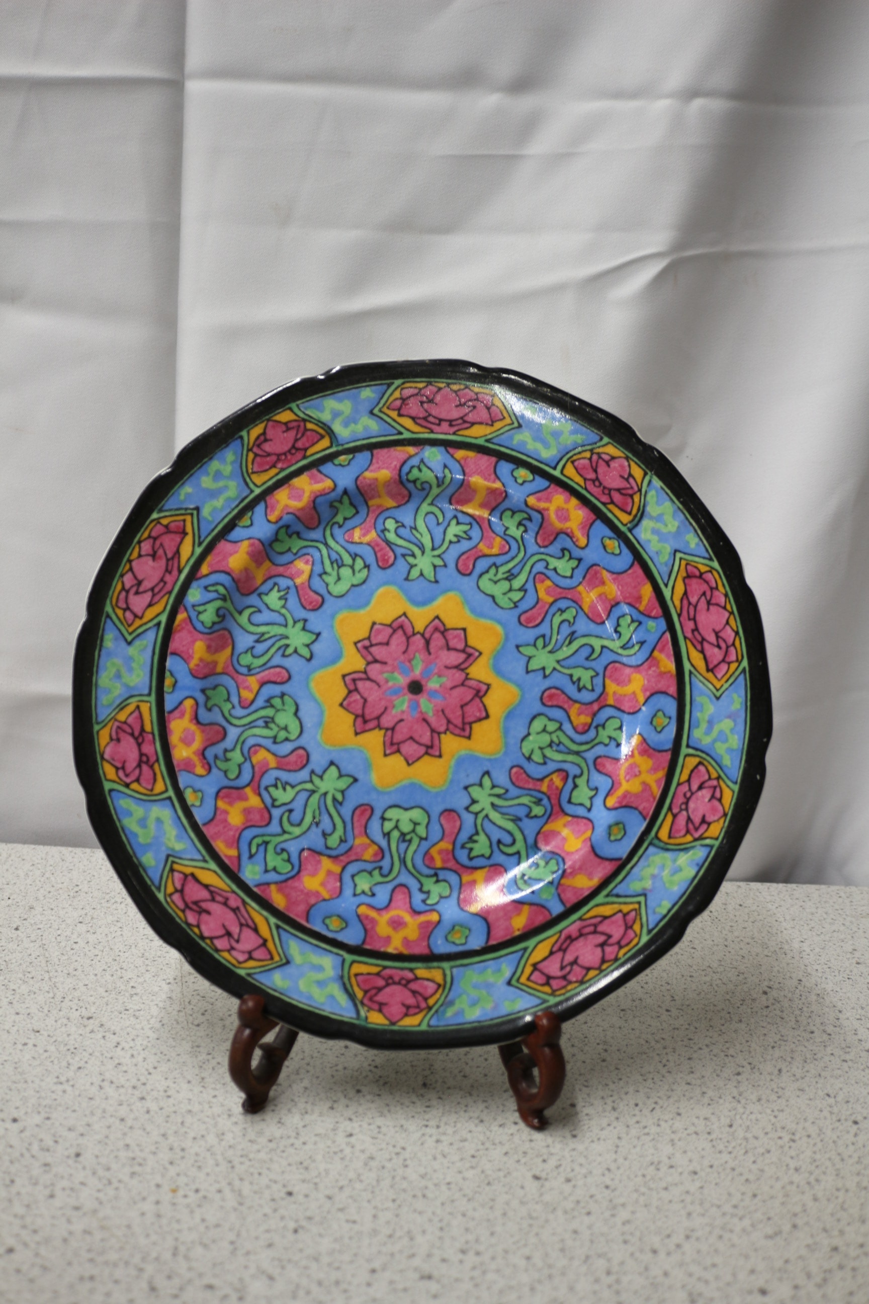 A multi-coloured Rosette decorative plate, primarily blue, pink, yellow, and green with a black rim, bearing a green ‘ROYAL DOULTON ENGLAND’ backstamp with a lion and crown, and the number ’11’ in black below it. 10.5″