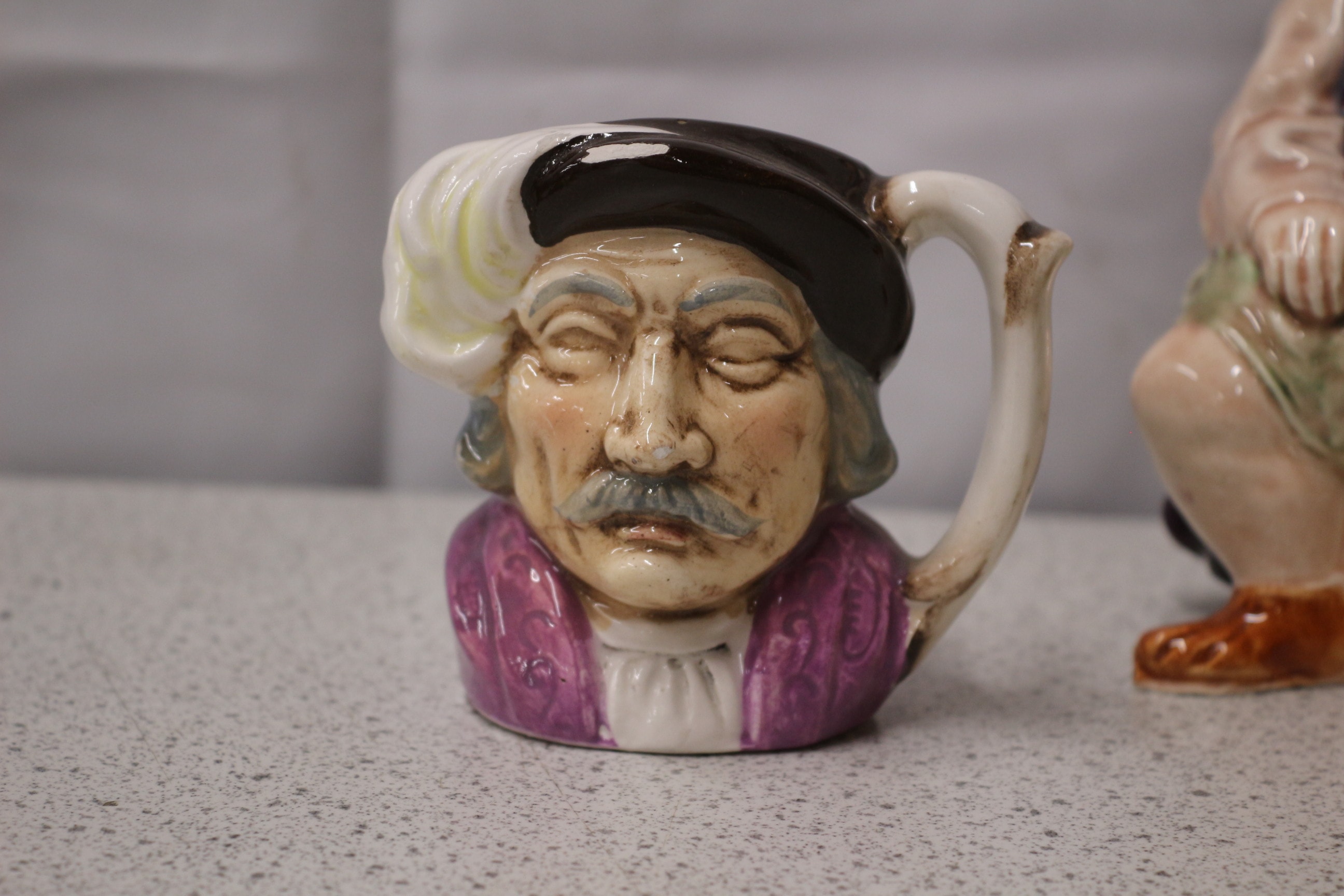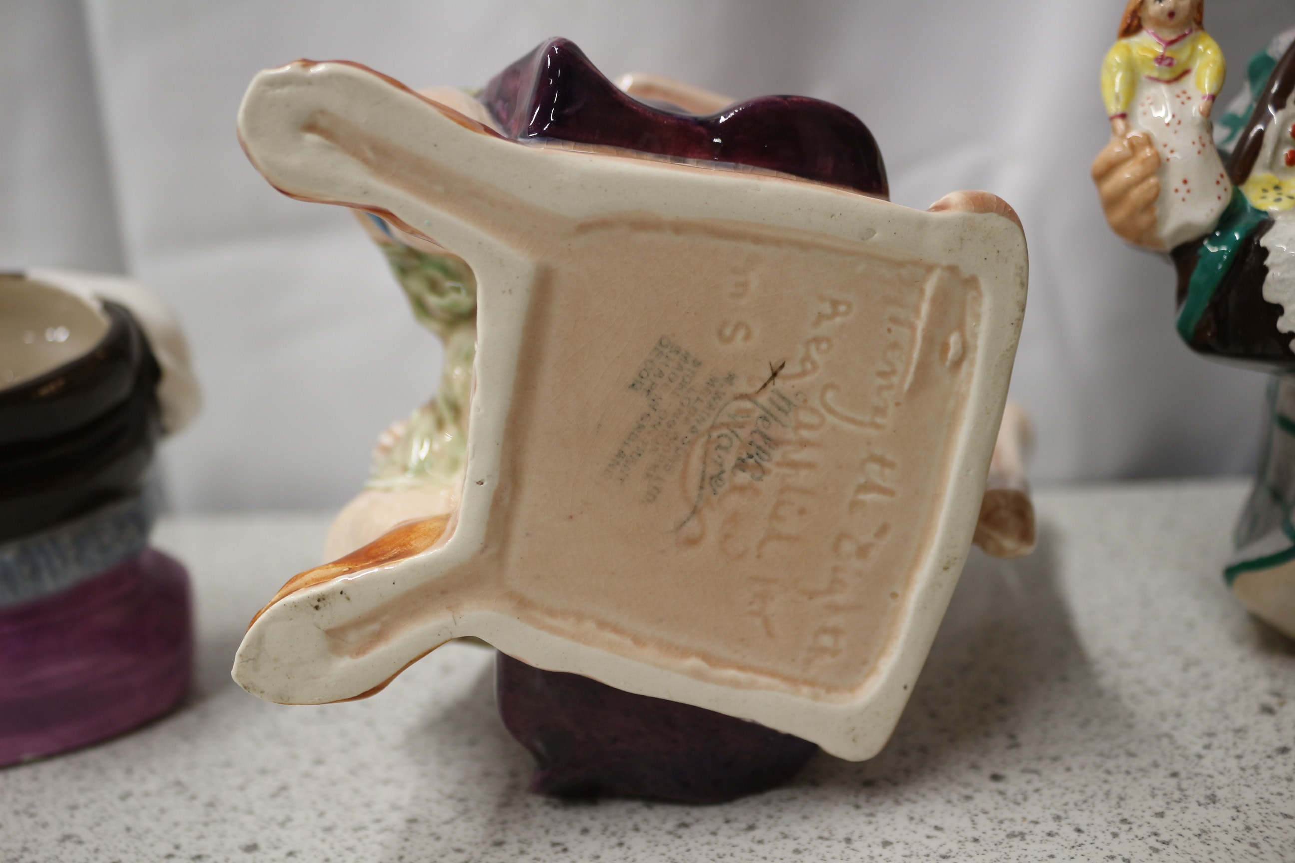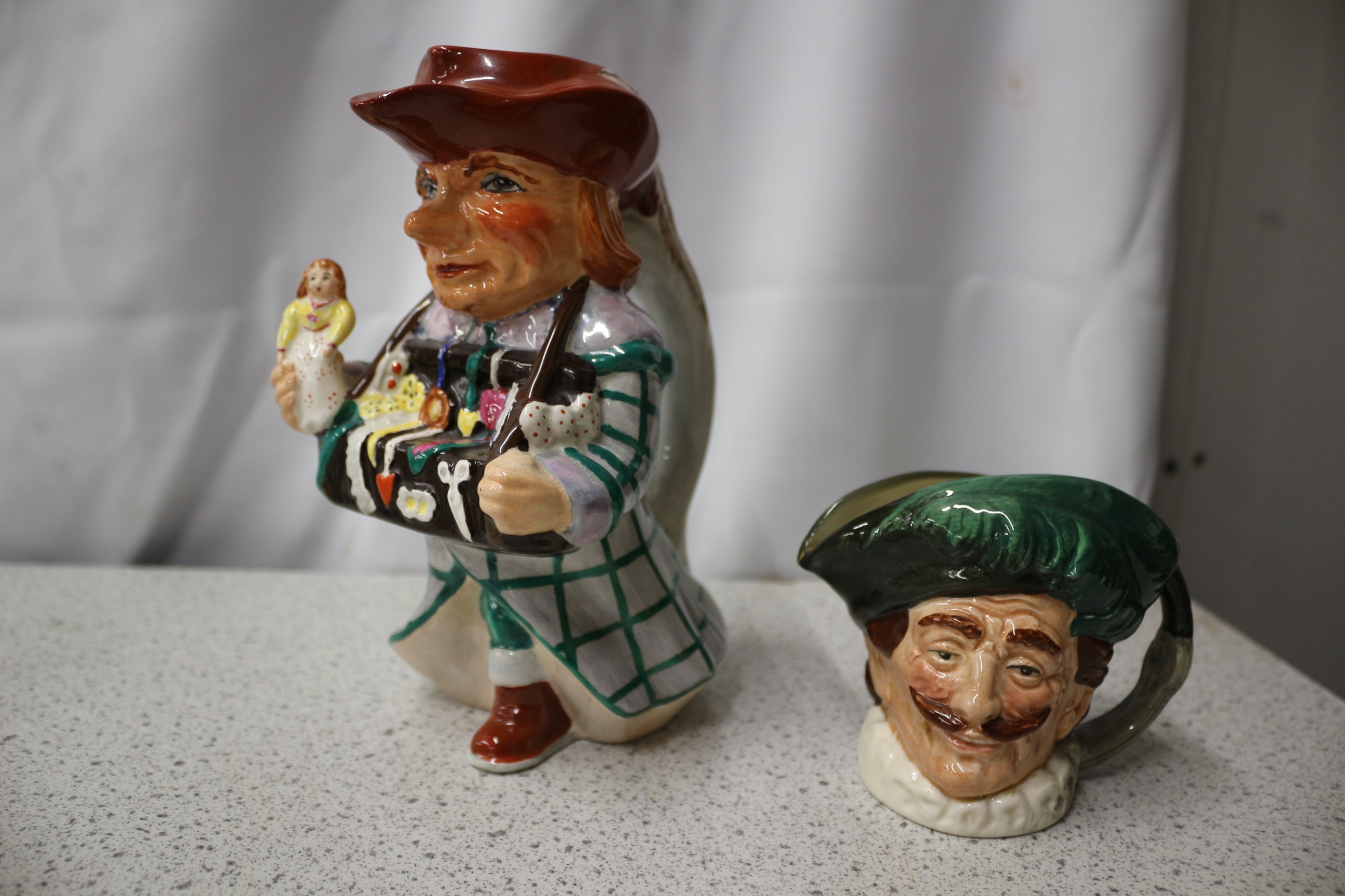 A collection of four multi-coloured ceramic character/toby jugs, including two Royal Doulton examples: a seated Henry VIII figurine by A.E. Smith, 1941, D 6317, and ‘The Cavalier’ jug; a Unicorn Hand-painted ‘Pedlar’ figurine; and a smaller jug of a man with a moustache. Tallest 17.5cm