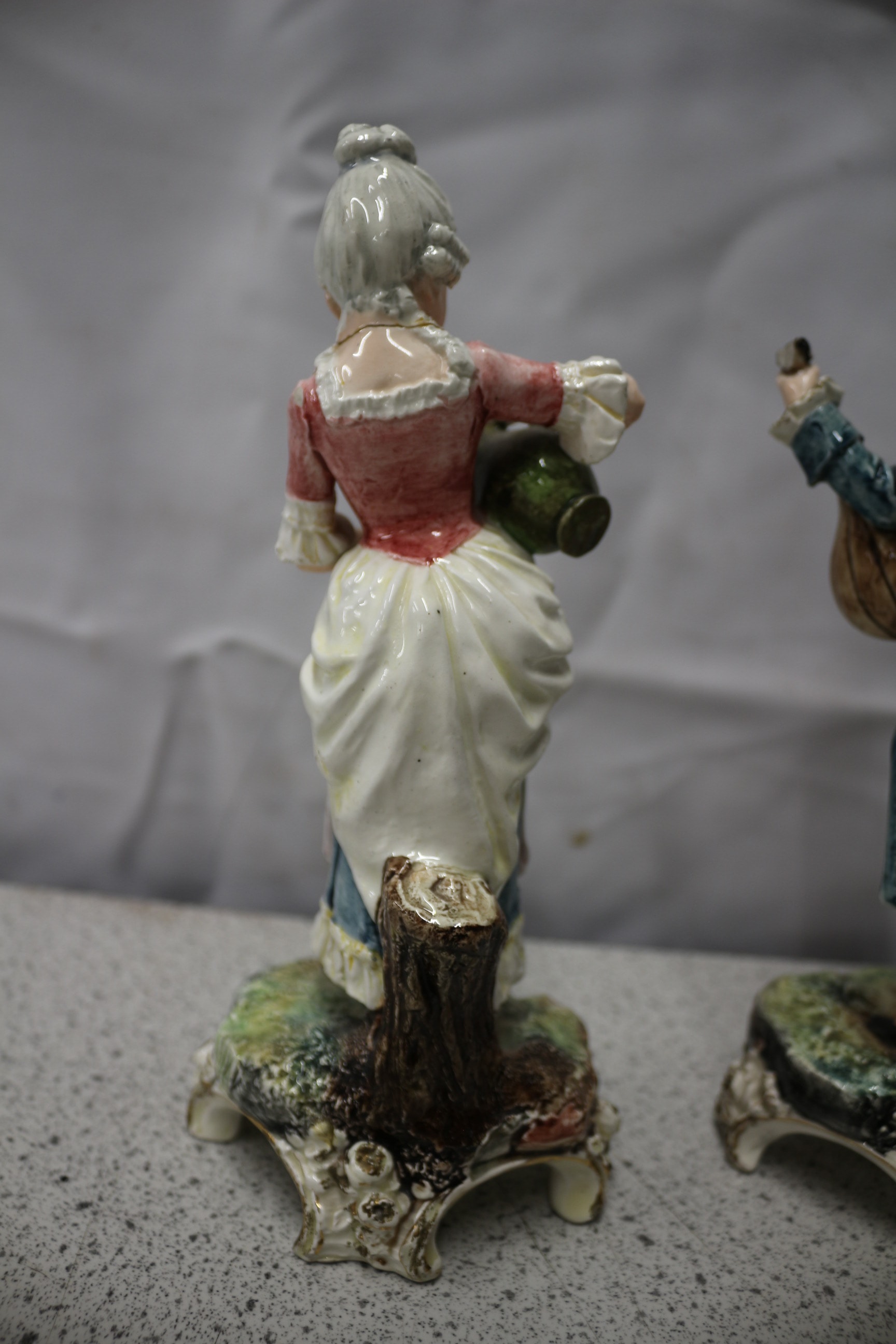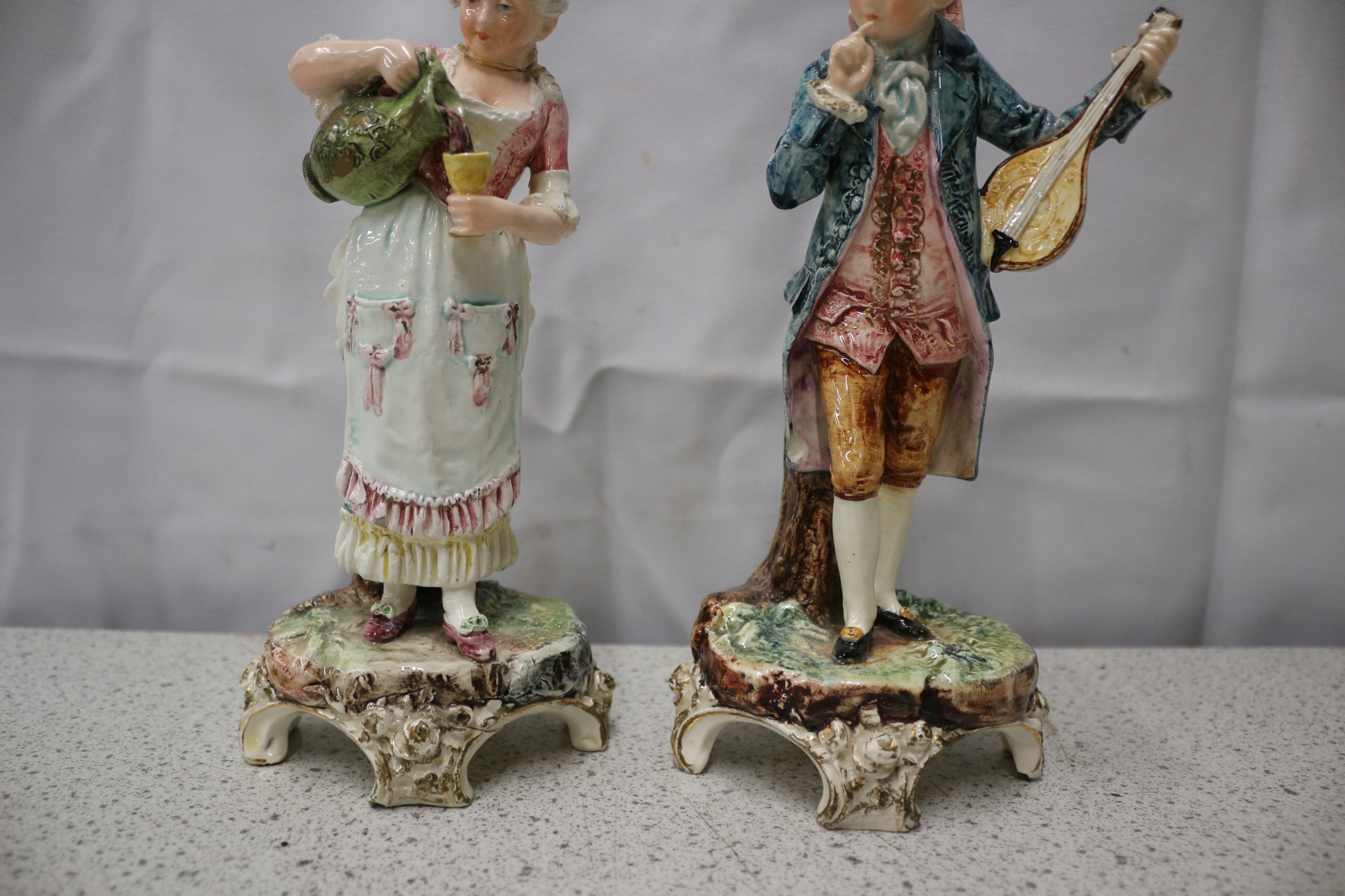 A pair of porcelain figurines depicts a woman pouring from a green jug and a man holding a mandolin, coloured white, pink, blue, green, and brown, with ‘4854 B’ on the woman’s base. 21.5cm tall. 1x AF