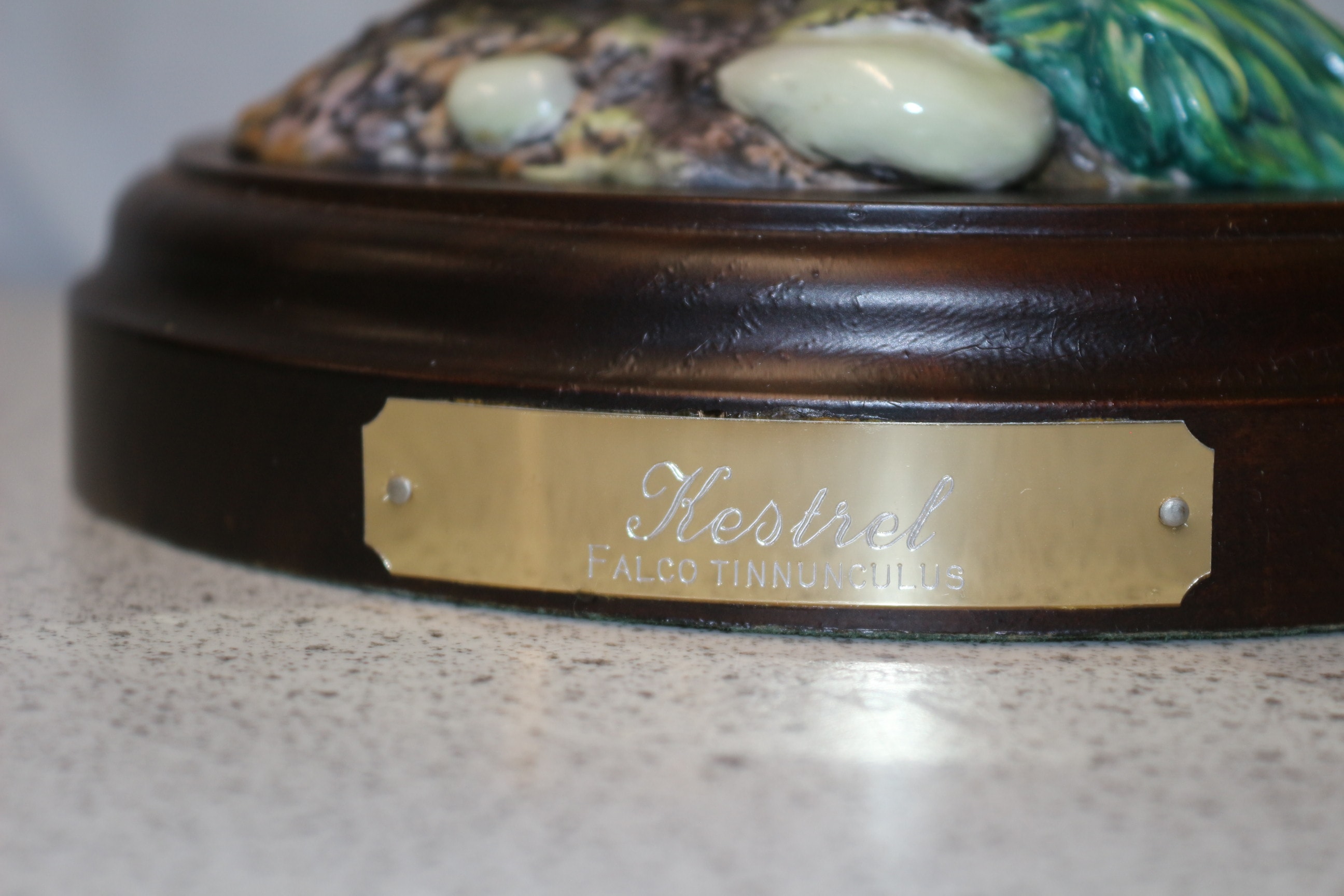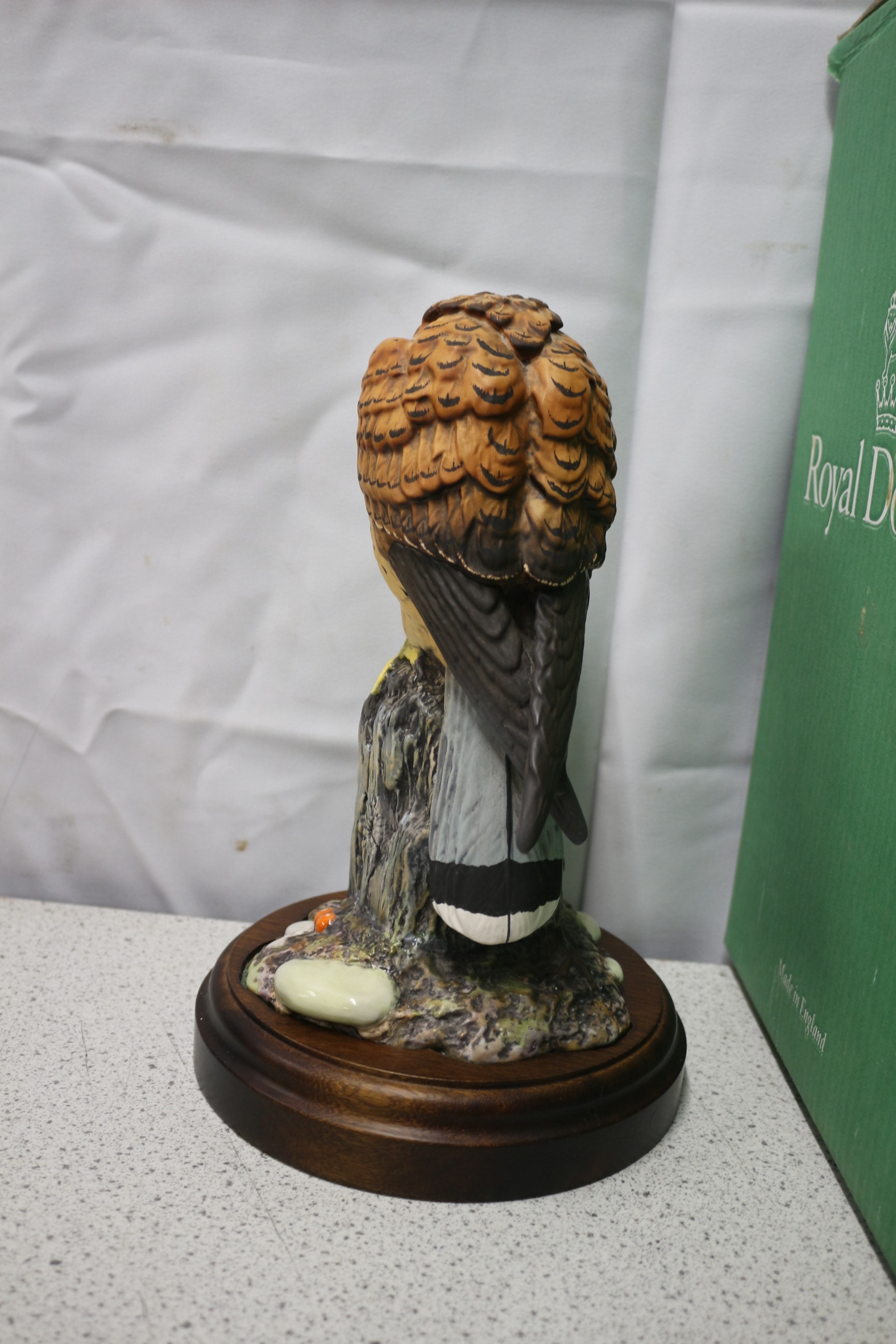 A Royal Doulton ‘Kestrel’ ceramic figurine, primarily brown, tan, and grey on a dark wood base, accompanied by its green Royal Doulton box labeled ‘Hand Made Ceramic Sculpture’ and ‘Made in England’.