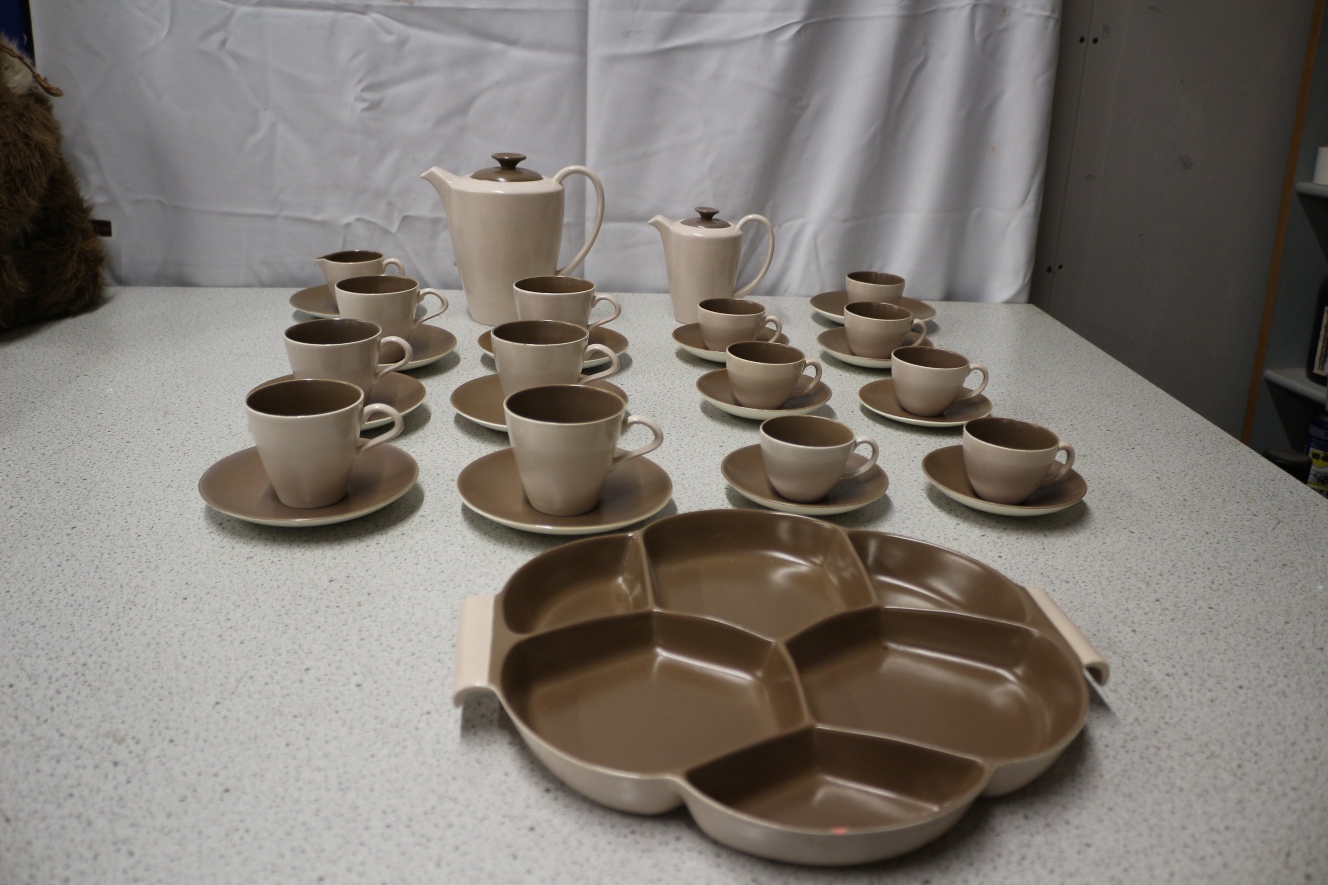 The lot consists of two two-tone light brown and dark brown teapots with lids, two-tone light brown and dark brown cups, dark brown saucers, and one two-tone light brown and dark brown segmented serving platter, all marked “POOLE ENGLAND EST 1873” with a dolphin logo. AF