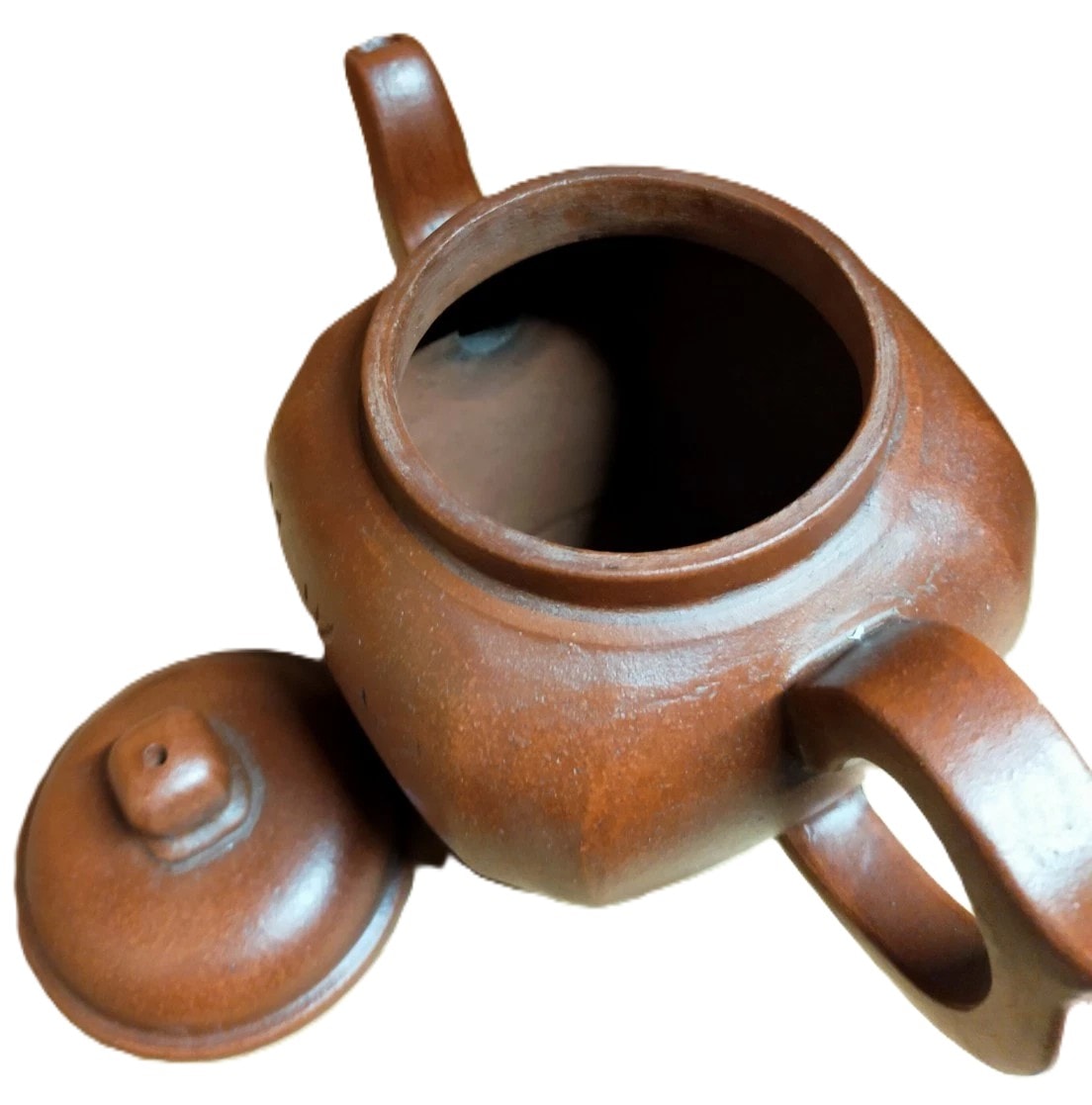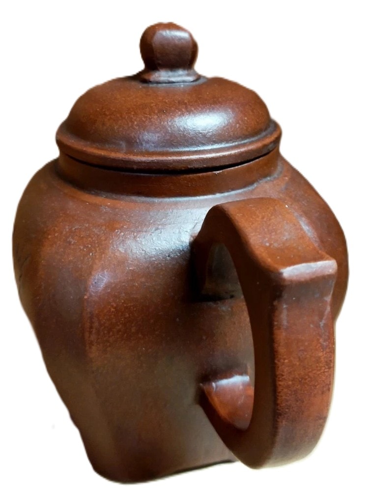 A reddish-brown Yixing clay teapot featuring an etched inscription of Chinese characters on its body and a square seal mark on its base reading ‘時大彬製’ (Shi Dabins made). 14cm tall