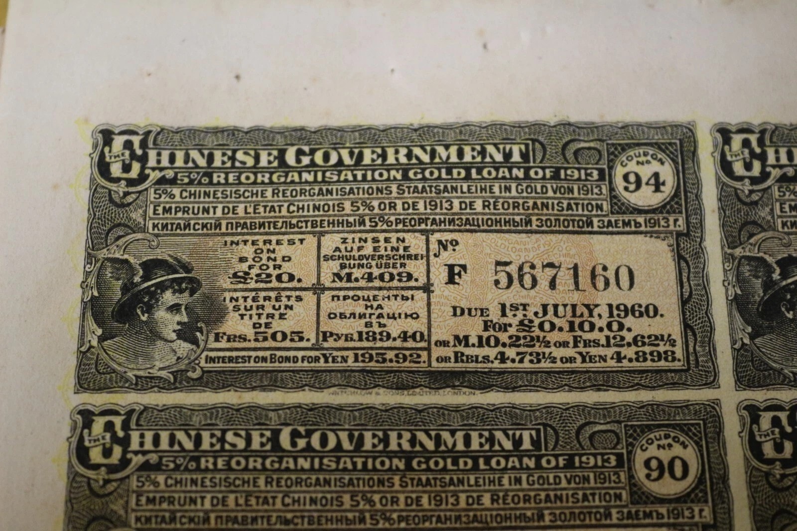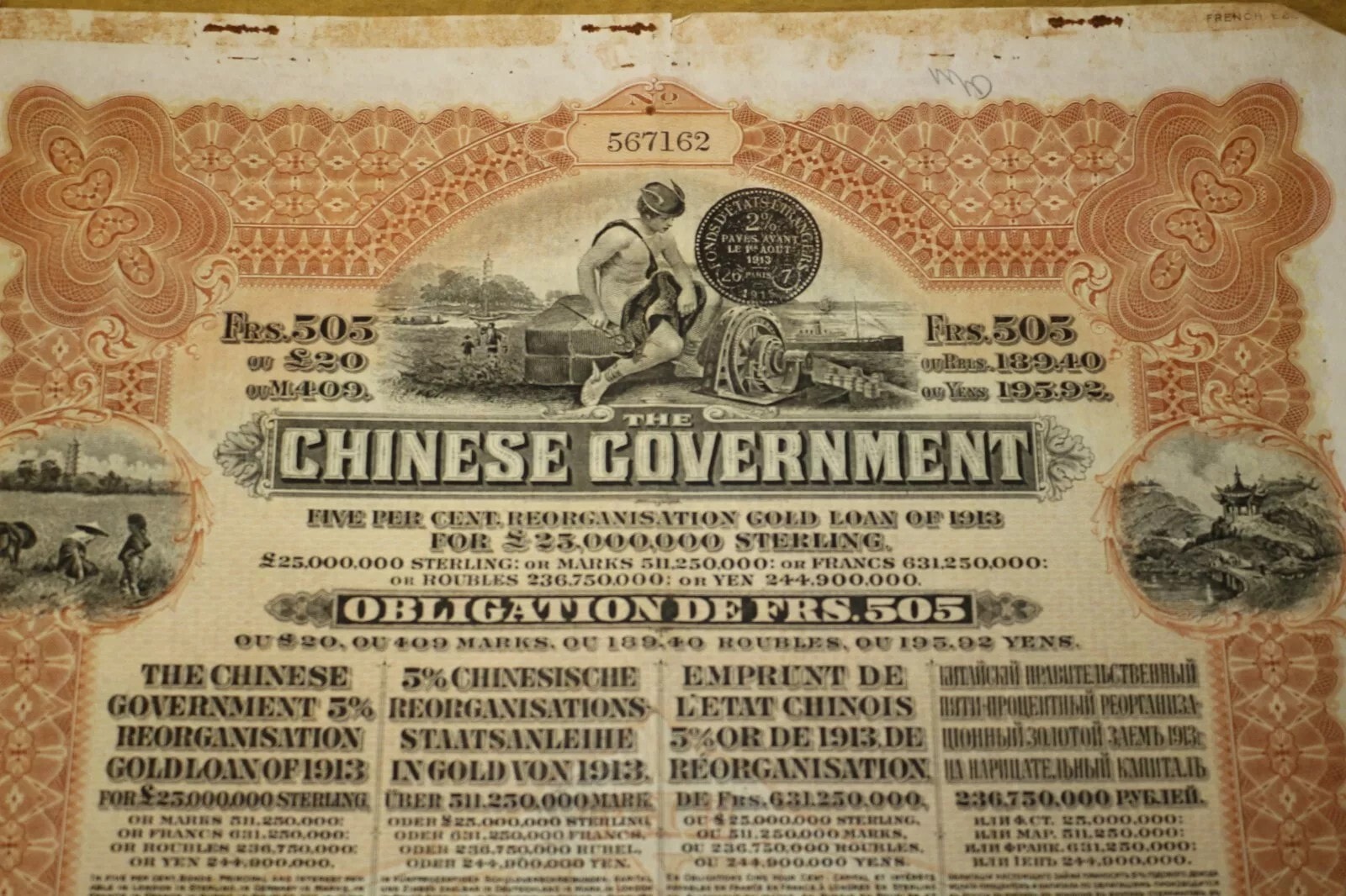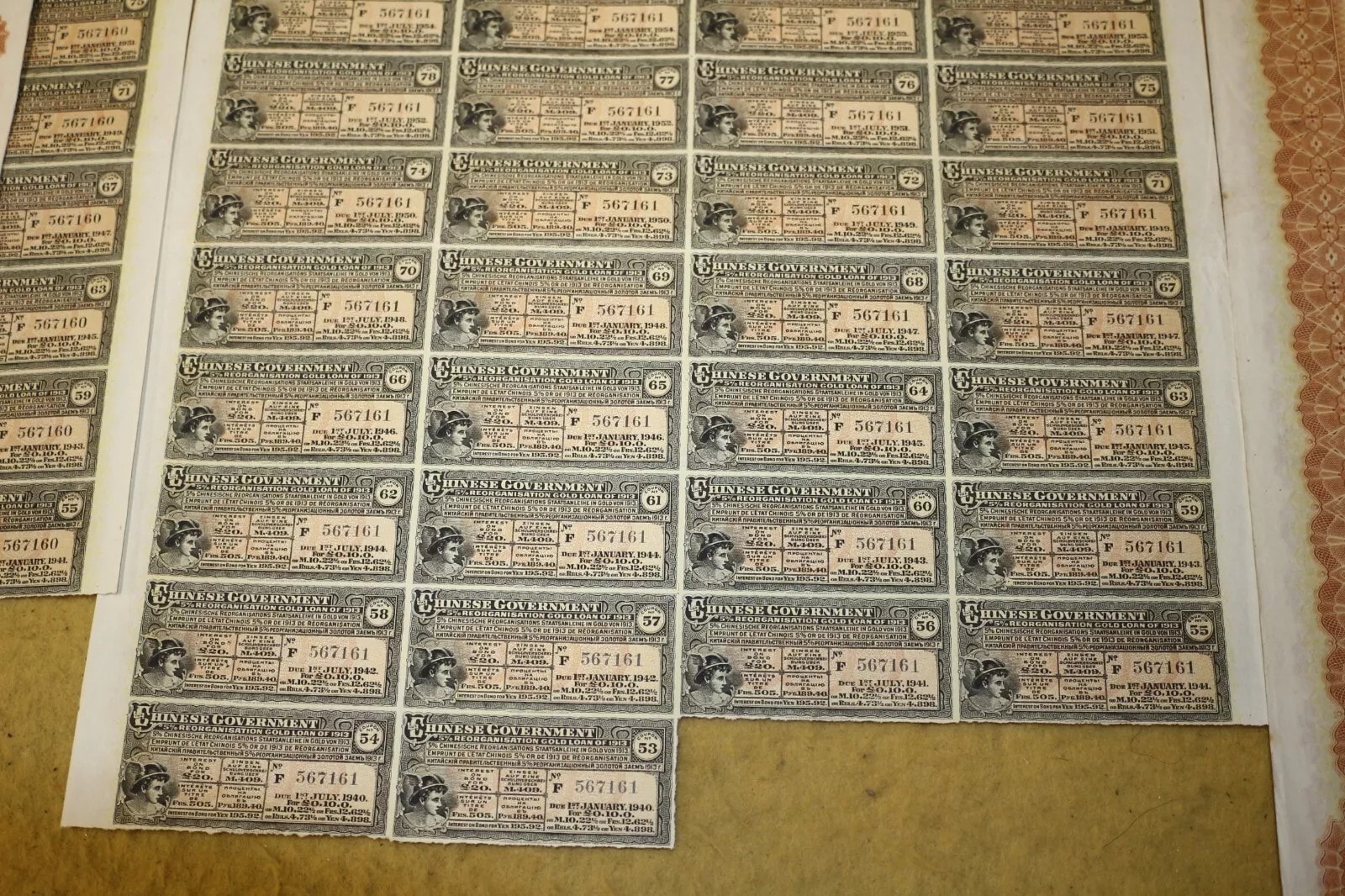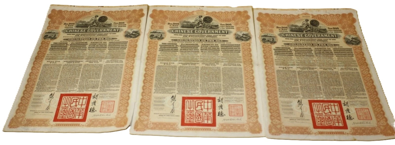 Three Chinese Government 5% Reorganisation Gold Loan of 1913 bonds, each valued at Frs. 505 (or equivalents in Sterling, Marks, Roubles, and Yen). The lot includes three sheets of corresponding, unsevered interest coupons. Printed on paper, the bonds feature an elaborate design with a central allegorical vignette and Chinese landscape scenes. They bear serial numbers 567160, 567161, and 567162. The documents are multilingual, presenting text in English, German, French, and Russian, and are marked with prominent red seals featuring Chinese characters, notably “中華民國之寶” (Seal of the Republic of China). Issued in 1913.