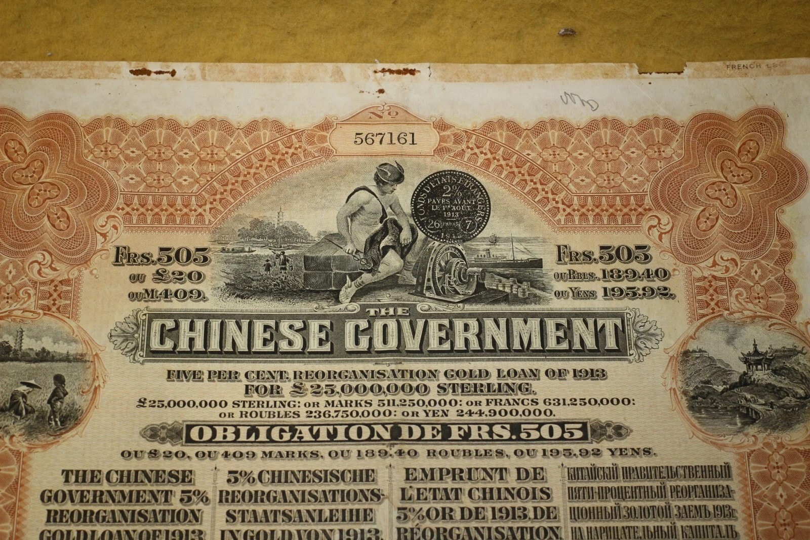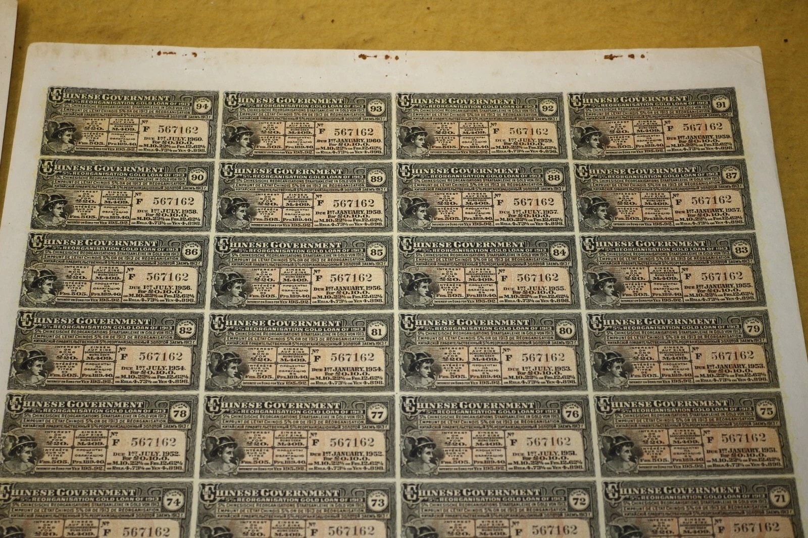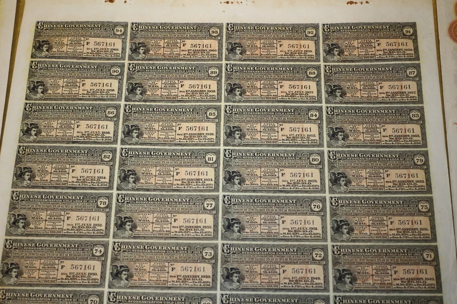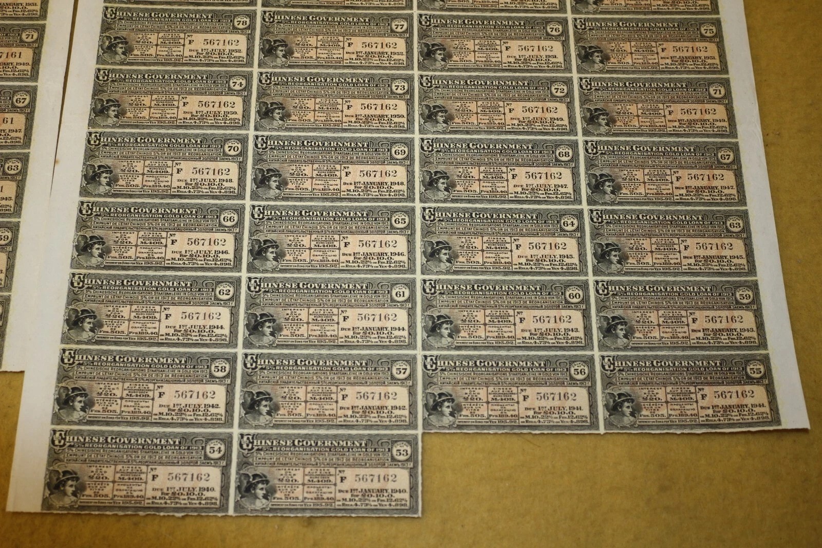 Three Chinese Government 5% Reorganisation Gold Loan of 1913 bonds, each valued at Frs. 505 (or equivalents in Sterling, Marks, Roubles, and Yen). The lot includes three sheets of corresponding, unsevered interest coupons. Printed on paper, the bonds feature an elaborate design with a central allegorical vignette and Chinese landscape scenes. They bear serial numbers 567160, 567161, and 567162. The documents are multilingual, presenting text in English, German, French, and Russian, and are marked with prominent red seals featuring Chinese characters, notably “中華民國之寶” (Seal of the Republic of China). Issued in 1913.