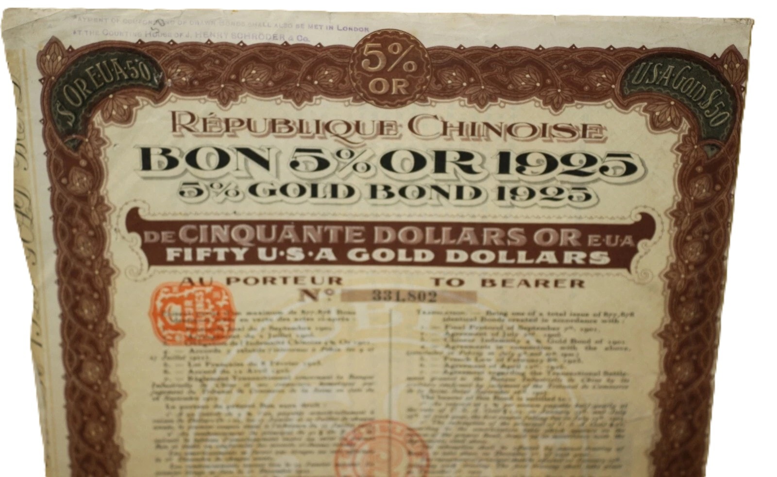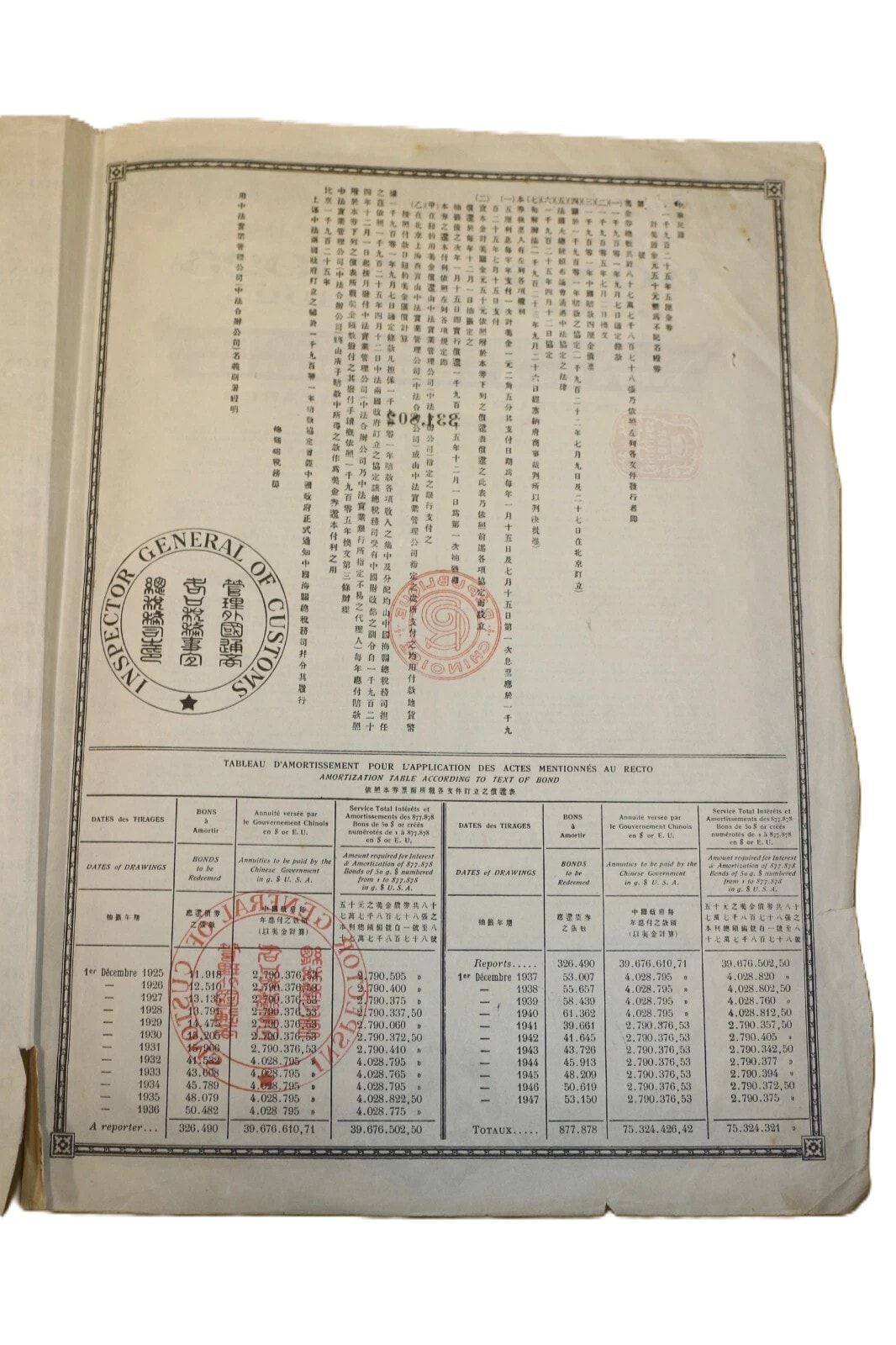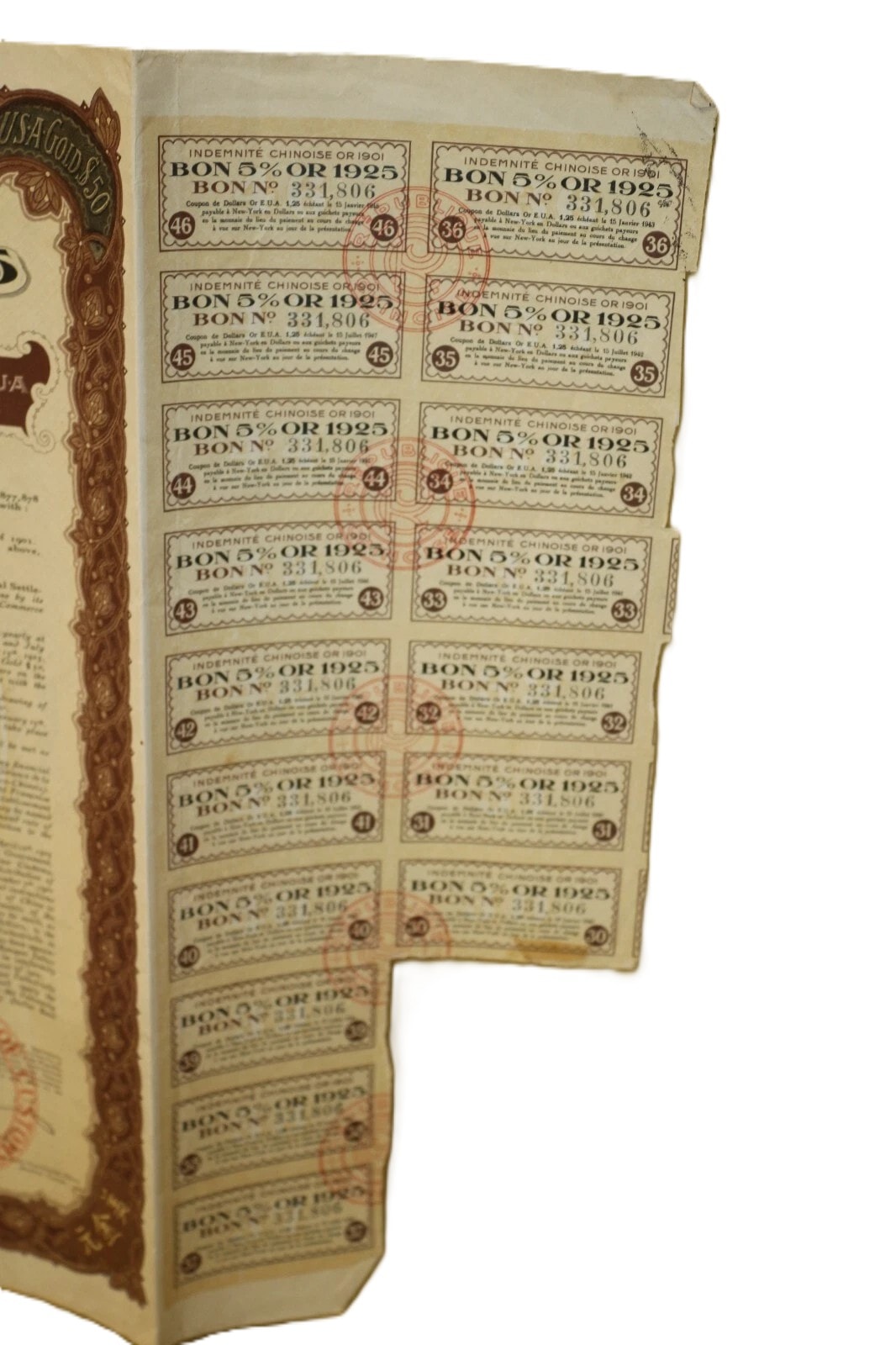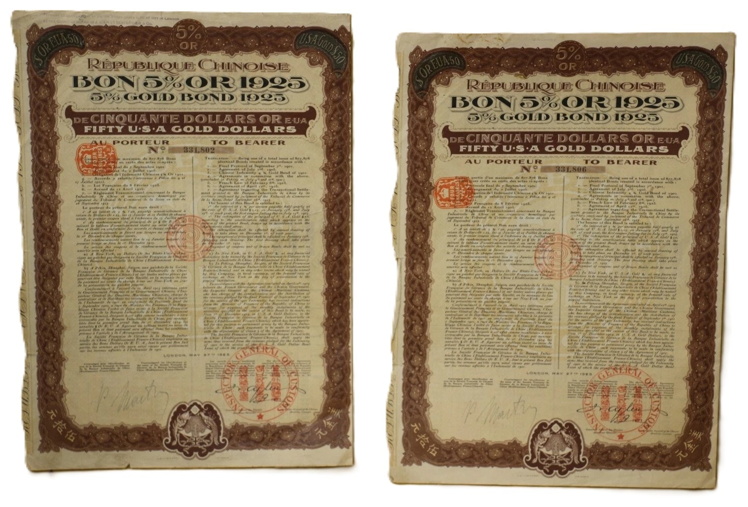 A pair of historical paper securities, specifically 5% Gold Bonds issued by the Chinese Republic (République Chinoise) on May 27, 1925, from London. Each bond is denominated for Fifty U.S.A. Gold Dollars (“DE CINQUANTE DOLLARS OR EUA / FIFTY U.S.A GOLD DOLLARS”) and issued “AU PORTEUR” (To Bearer). The documents feature decorative borders and extensive bilingual text in French and English detailing terms, alongside Chinese characters (“天陆伍拾元” and “陆伍拾元” confirming the “Fifty Yuan” denomination. Visible bond numbers are 331.802 and 331.806. Numerous red official stamps and seals are present, including those from the “GENERAL INSPECTORATE OF CUSTOMS” and “BUREAU GENERAL DES DOUANES MARITIMES CHINOISES.” Each main bond document includes a perforated sheet of detachable coupons, individually numbered and bearing the inscription “INDEMNITÉ CHINOISE OR 1901” (Chinese Indemnity Gold 1901), with payment dates extending into the 1940s, linking them to the Boxer Protocol indemnity payments. An additional document, an amortization table (“TABLEAU D’AMORTISSEMENT”), details repayment schedules.