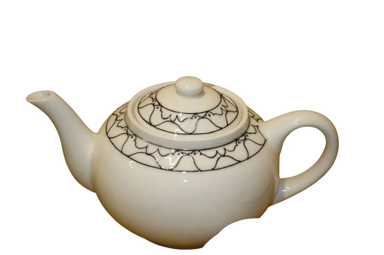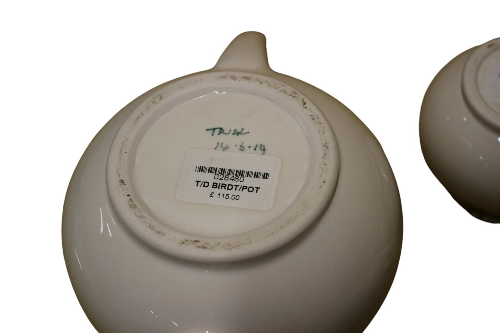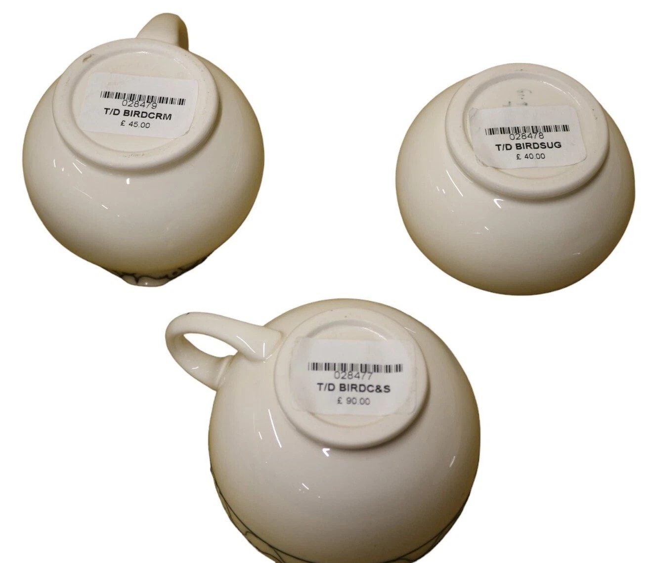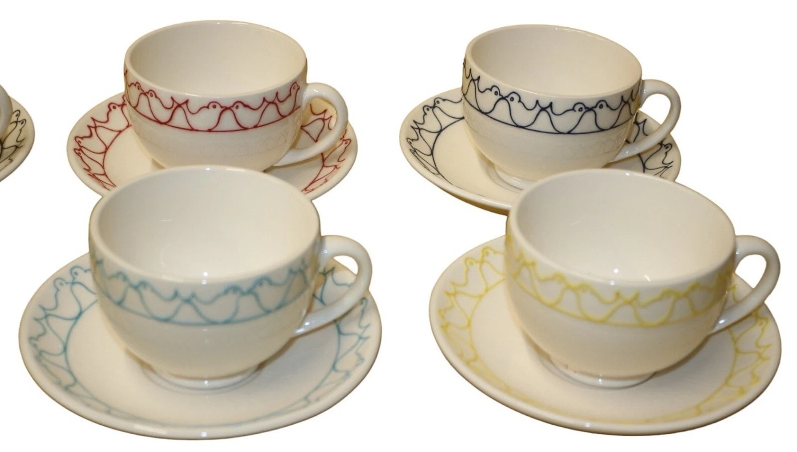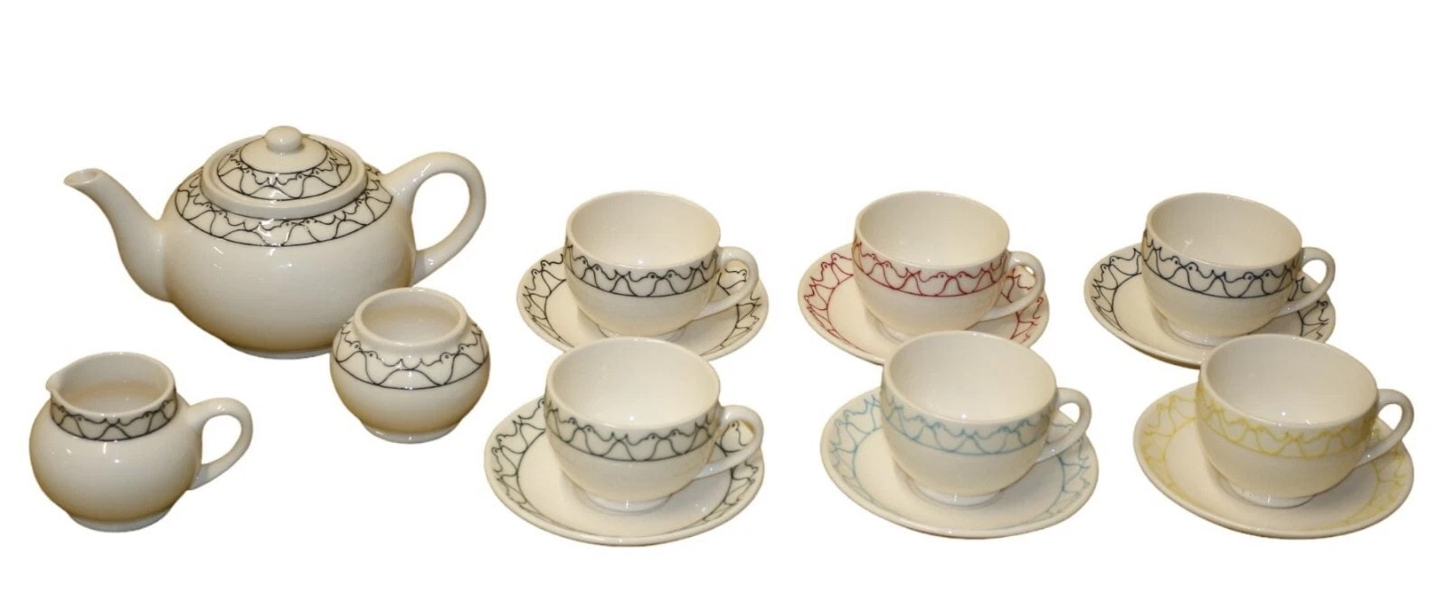 A ceramic tea service by Moorcroft, marked ‘TRIAL 14.8.19’. The service comprises a lidded teapot, a creamer, a sugar bowl, and five cups with their corresponding saucers. Each piece is crafted from white glazed ceramic and adorned with a distinctive, repeating curvilinear pattern, which appears to depict stylized birds, applied as a decorative band. The pattern is executed in black on the teapot, creamer, sugar bowl, and one cup/saucer set, with the remaining four cup and saucer sets featuring the pattern in red, dark blue, light blue, and yellow respectively. Visible impressed manufacturer’s mark ‘MOORCROFT MADE IN ENGLAND’ is present on the bases, along with a handwritten green script ‘TRIAL 14.8.19’, indicating these are prototype or sample pieces. Various retail stickers with item codes (e.g., ‘T/D BIRDCR’, ‘T/D BIRDT/POT’) and associated pricing are also present.