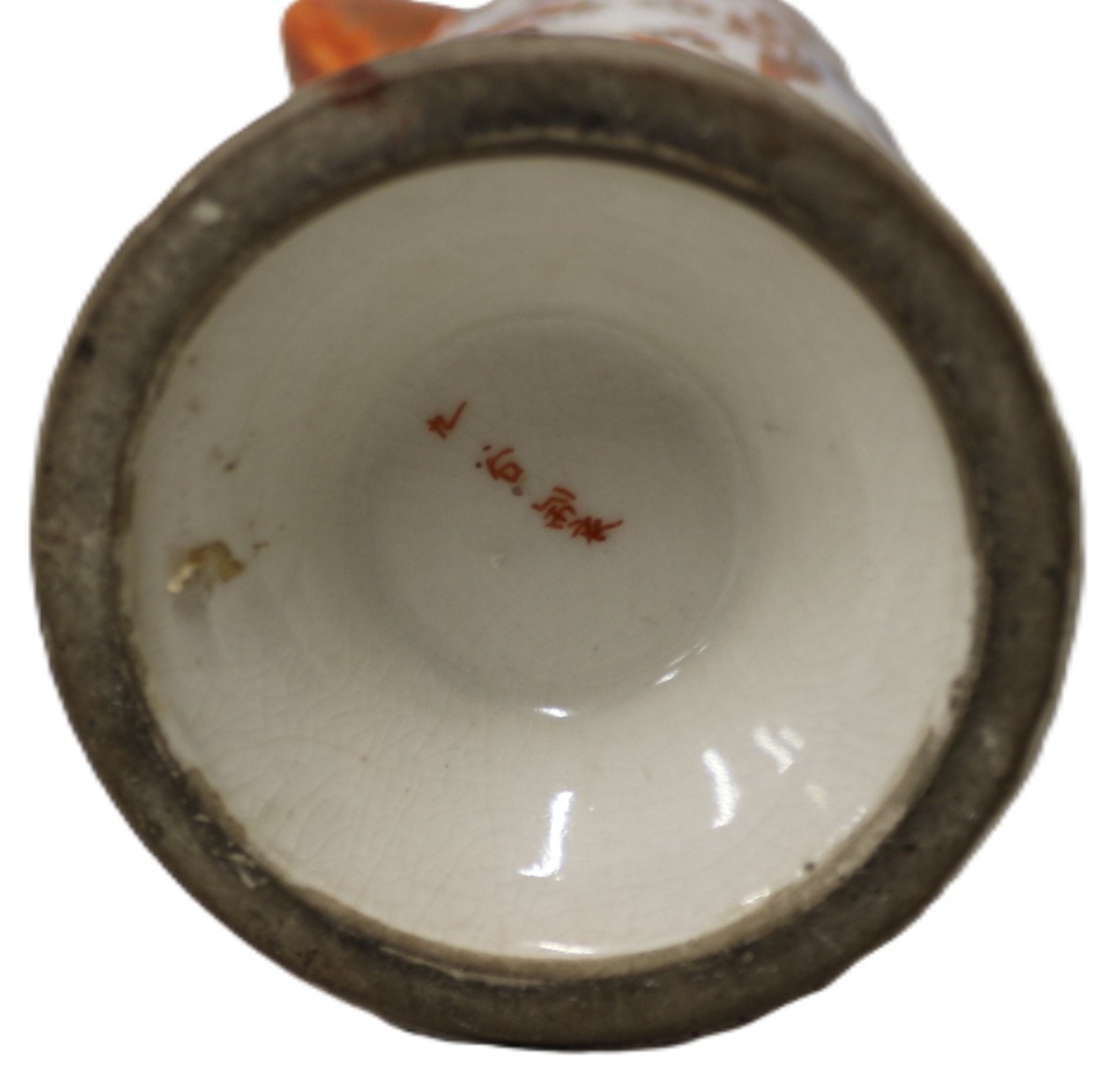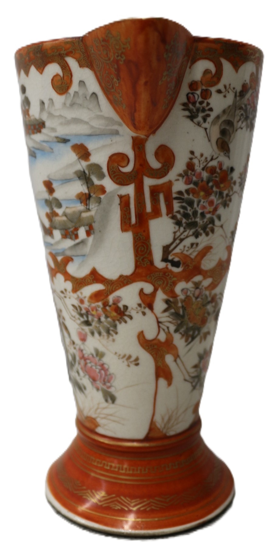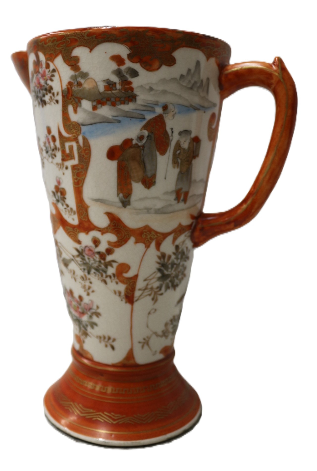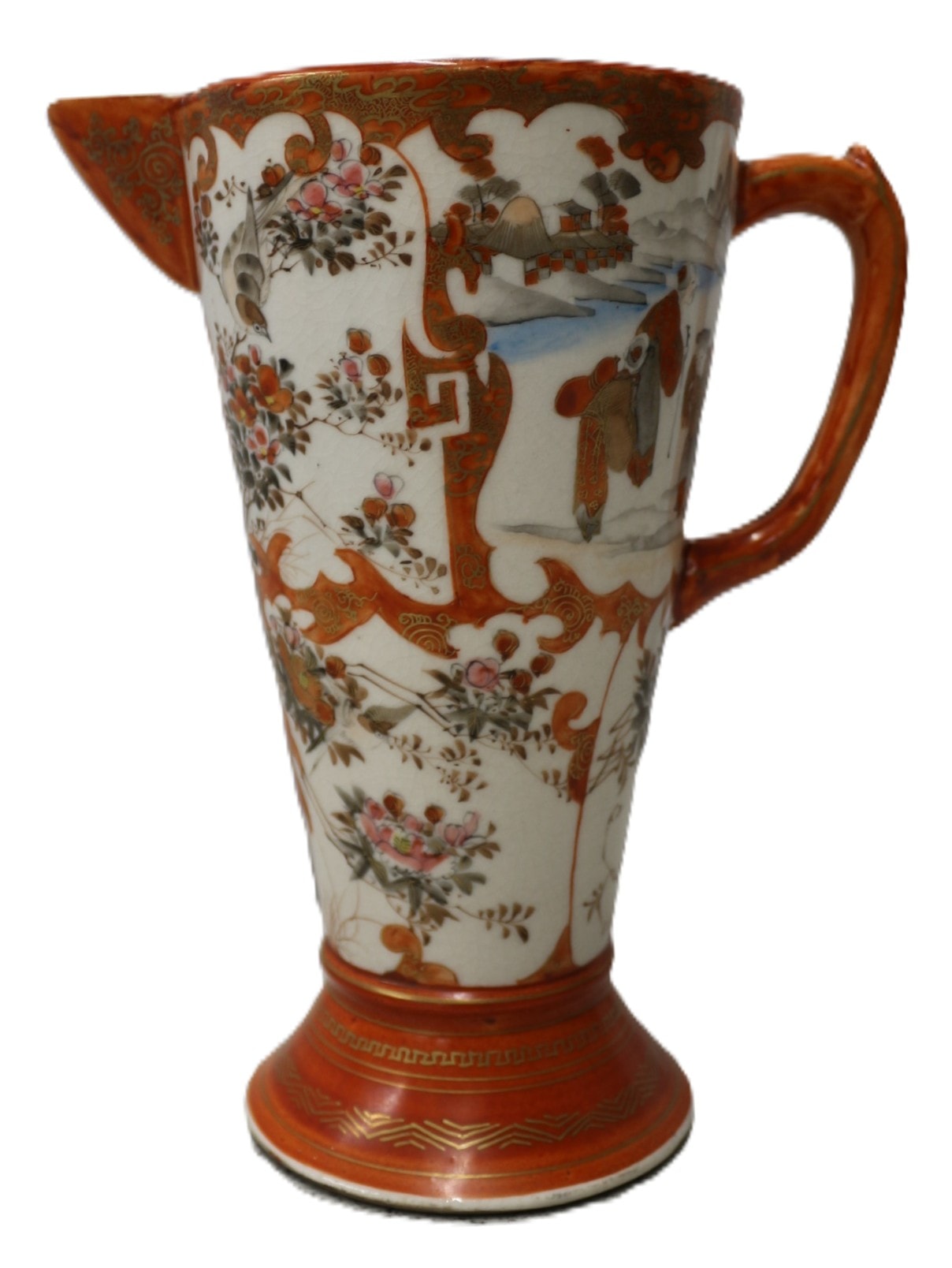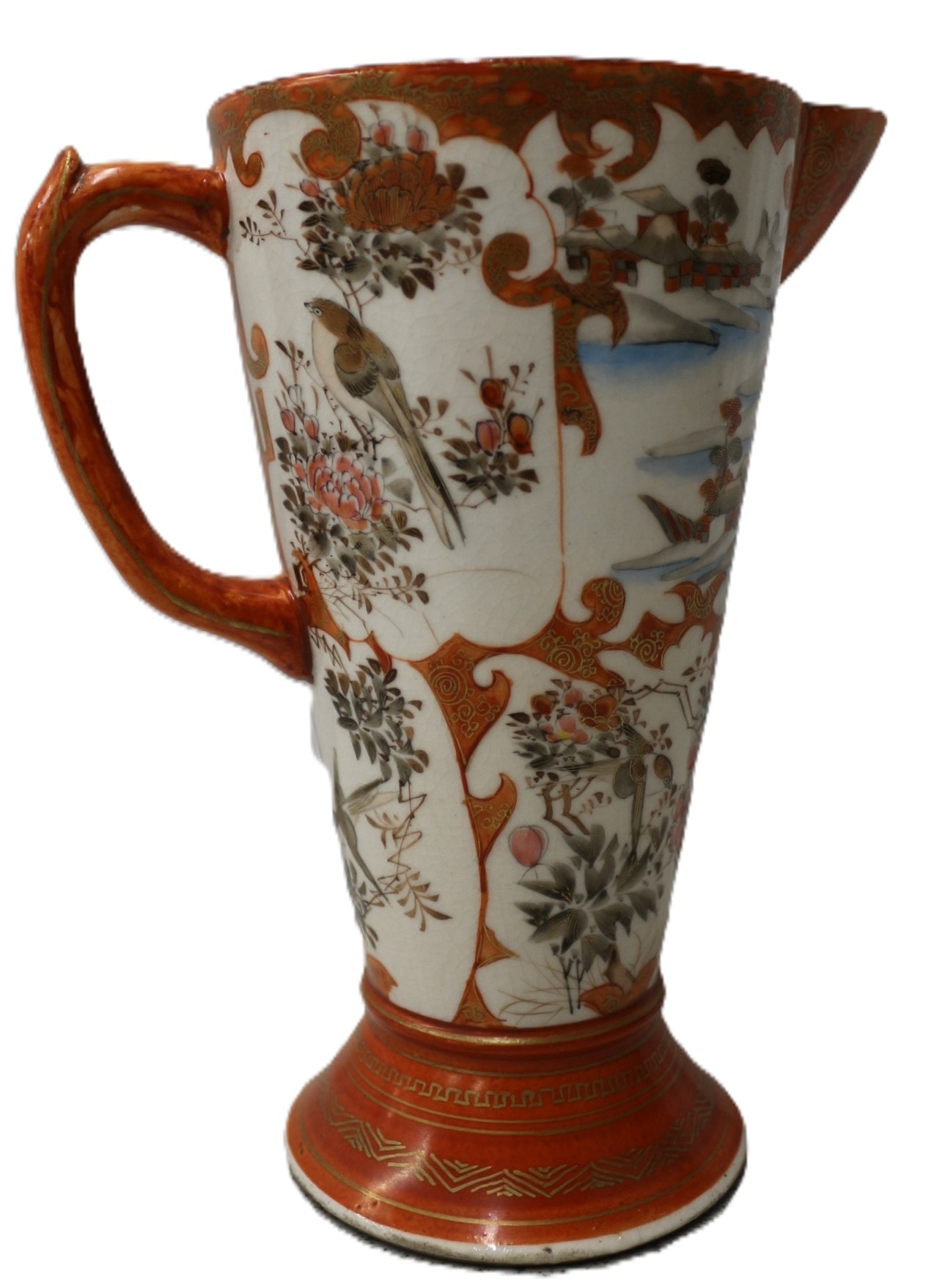 A Japanese Meiji Period Kutani porcelain chocolate pot, featuring a tall, tapering body with a flared foot and a distinct pouring spout. The decoration is predominantly in a palette of orange-red and gold enamels on a white ground, accented by polychrome elements. It is adorned with intricate gilt and red scrollwork forming cartouches that depict traditional Japanese landscapes with figures, and blossoming flora with birds. The foot, rim, and handle are coloured in solid orange-red with gilt geometric patterns. A red-painted mark on the base reads 「九谷製」 (Kutani-sei), translating to “Made by Kutani” or “Kutani ware.” 18cm Tall