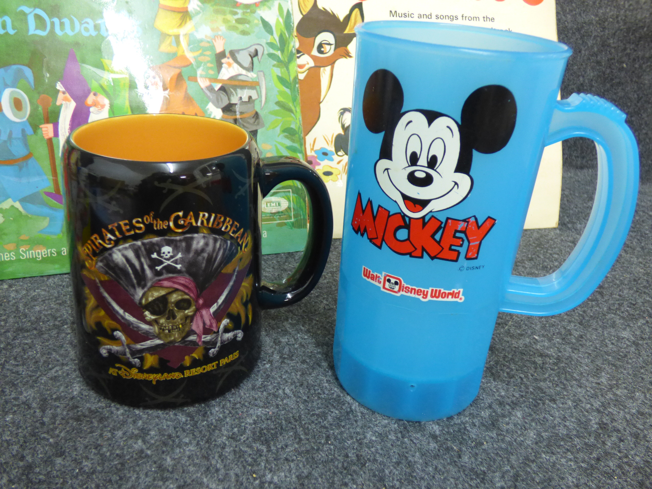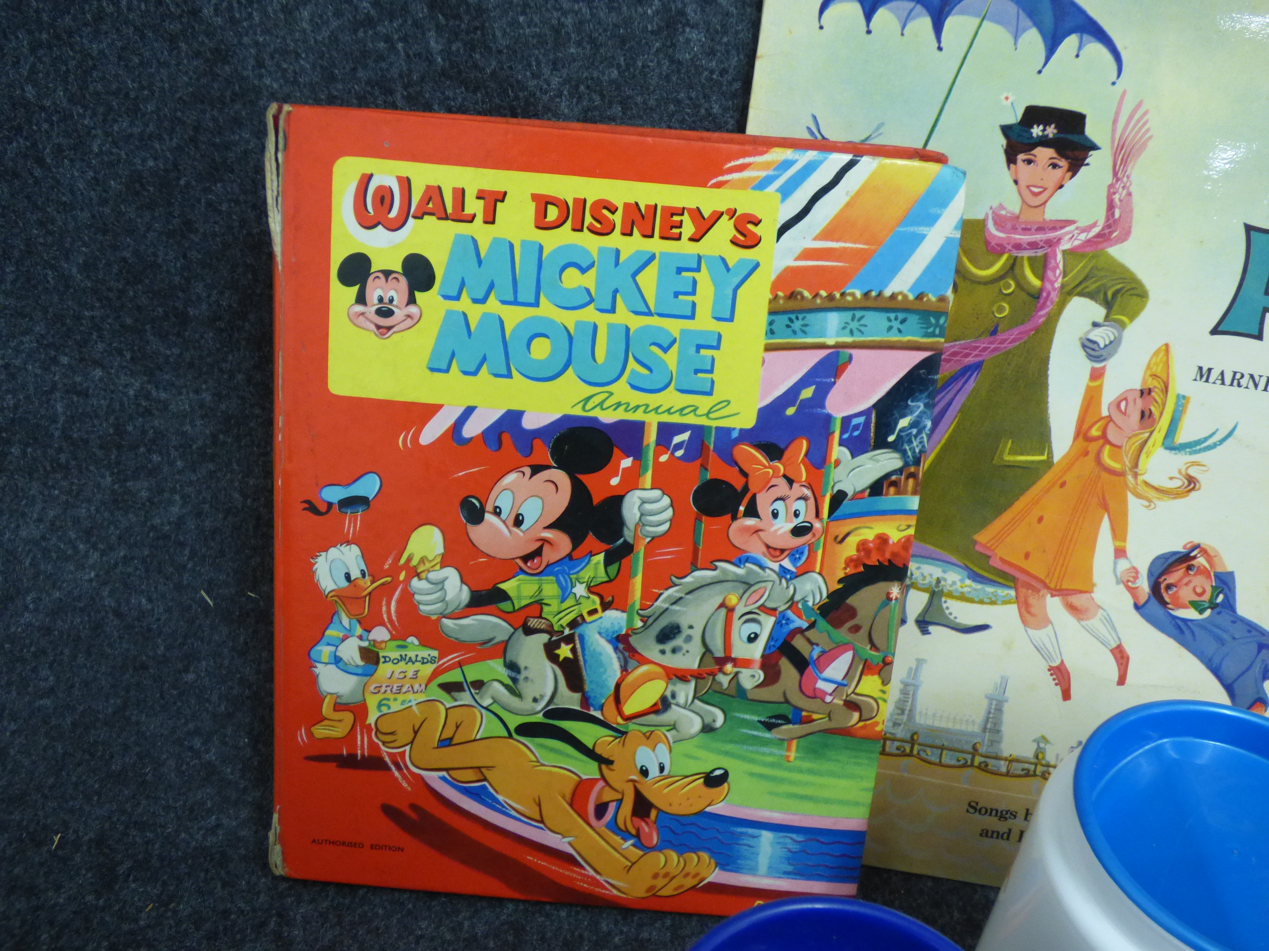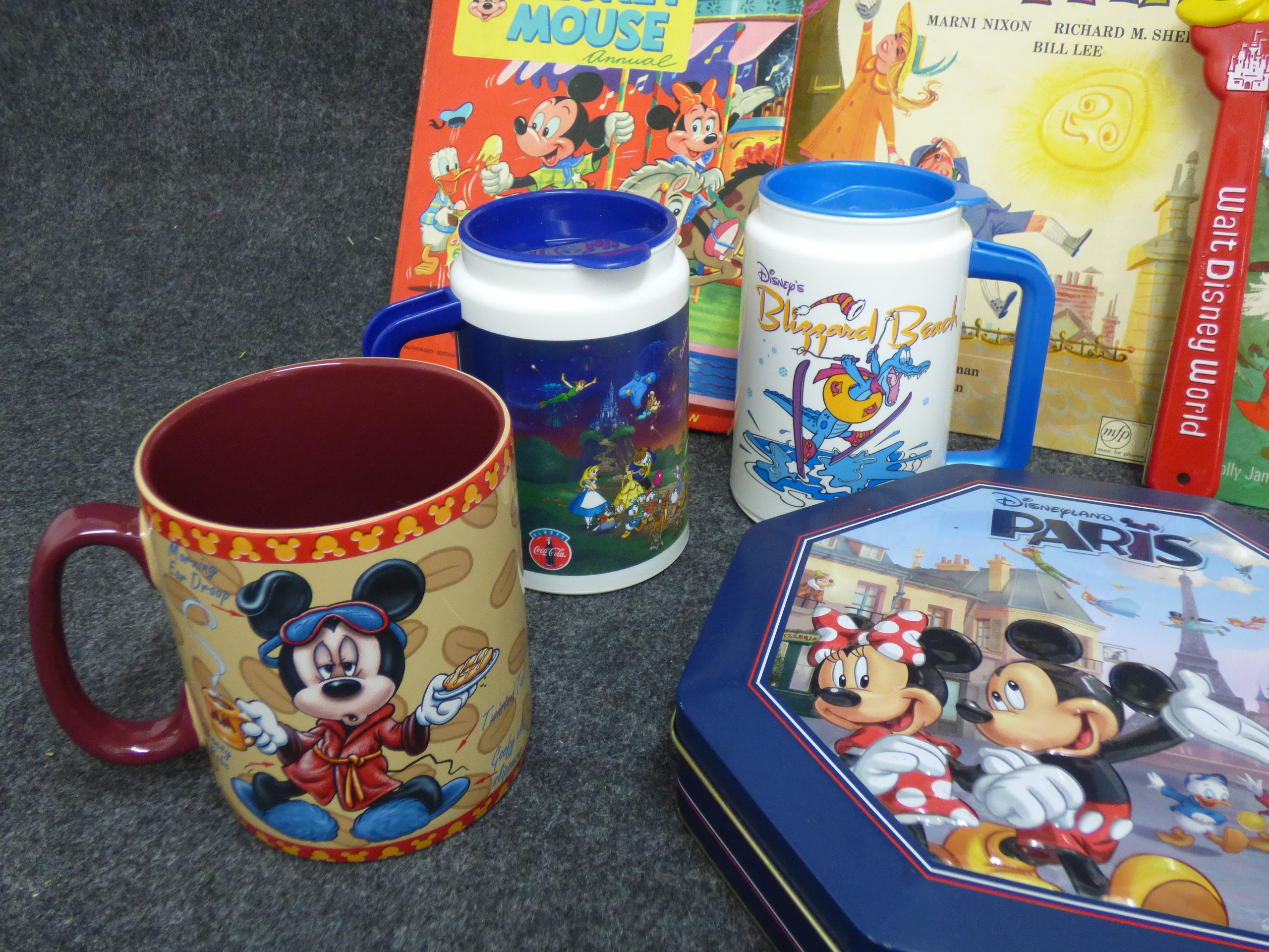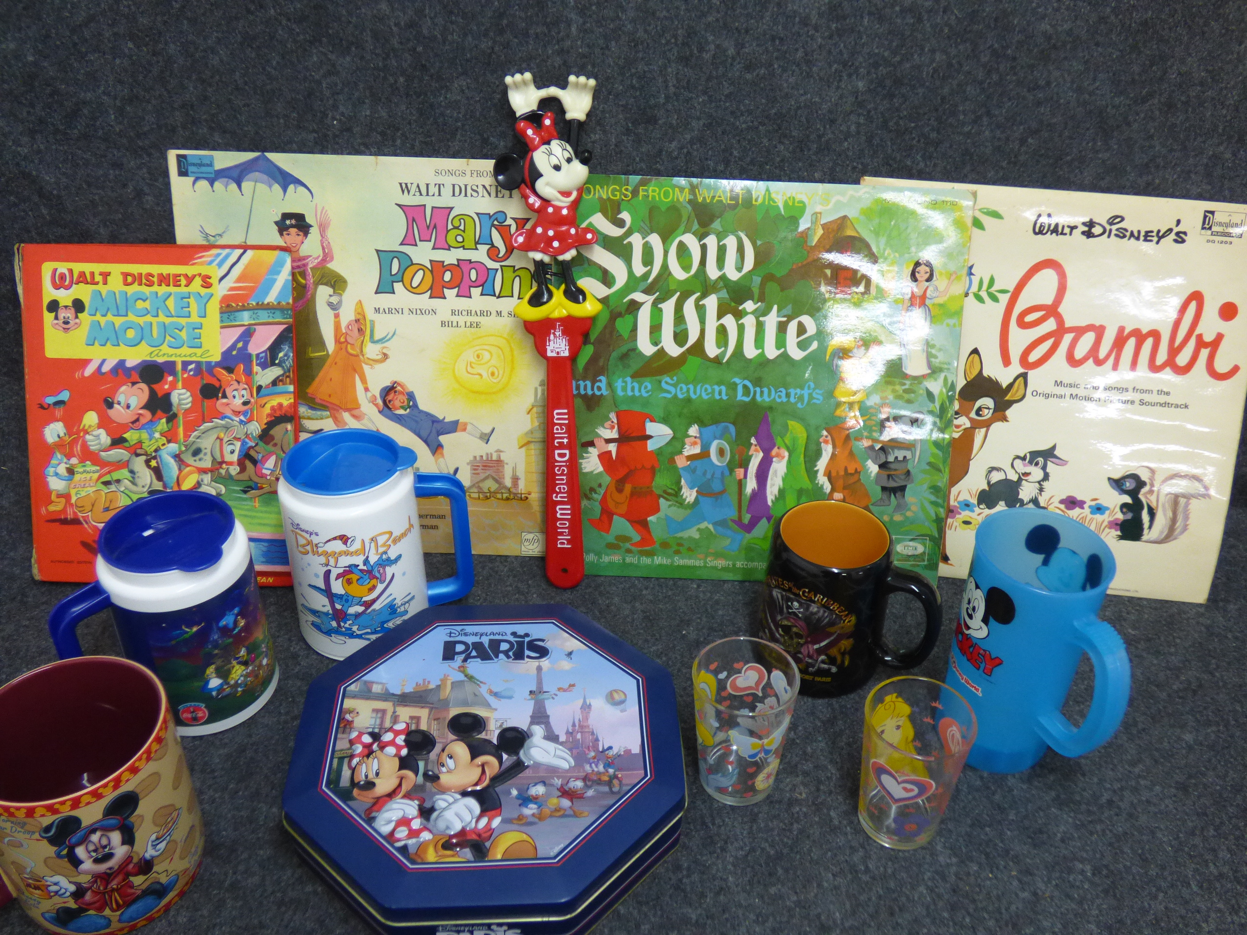 A collection of Disney themed items including several mugs and glasses, a Disneyland Paris decorative tin, record albums for Mary Poppins, Snow White, and Bambi, a Mickey Mouse Annual book, and a Walt Disney World Minnie Mouse backscratcher.