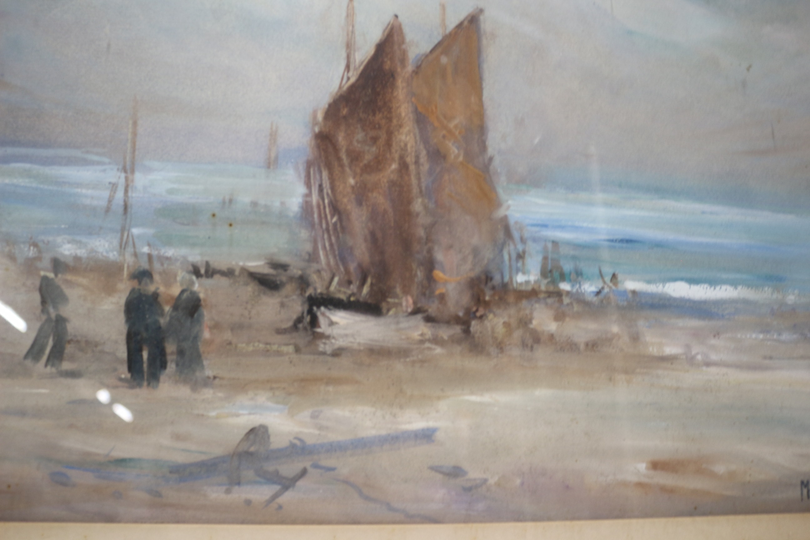 This framed watercolour painting depicts a bustling coastal seascape scene. The artwork features two prominent masted boats with sails on a sandy beach, accompanied by several figures, with breaking waves and a partly cloudy sky in the background. Rendered in a traditional seascape style, it is signed “M.A. Thornley.” in the lower right corner, with the additional marking “NSA” visible beneath the signature. The painting is presented under glass within an off-white mat, all contained within a simple wooden frame. 60x76cm
