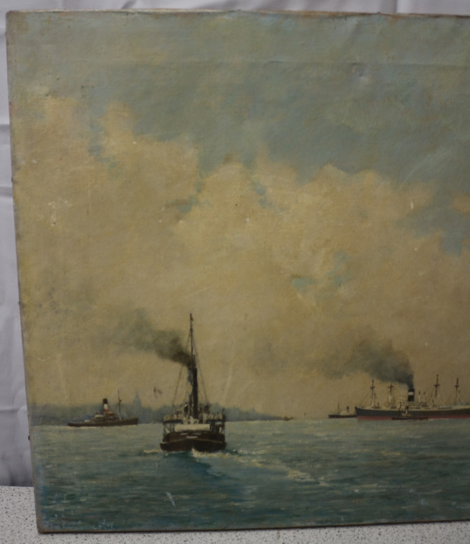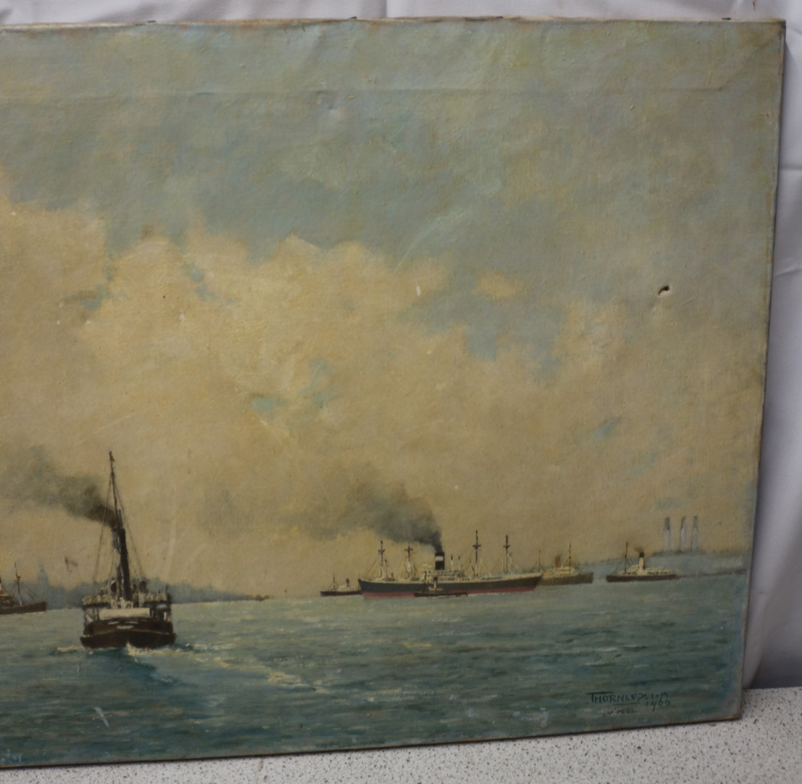 An oil painting on canvas by THORNLEY. D. A, dated 1960, depicting a maritime scene with multiple steam-powered vessels navigating a body of water under a cloudy sky. The artwork is signed “THORNLEY. D. A” in the lower right corner, with the additional inscription “LV.POOL” beneath, likely referring to “Liverpool Pilot” given the subject matter. 61x51cm