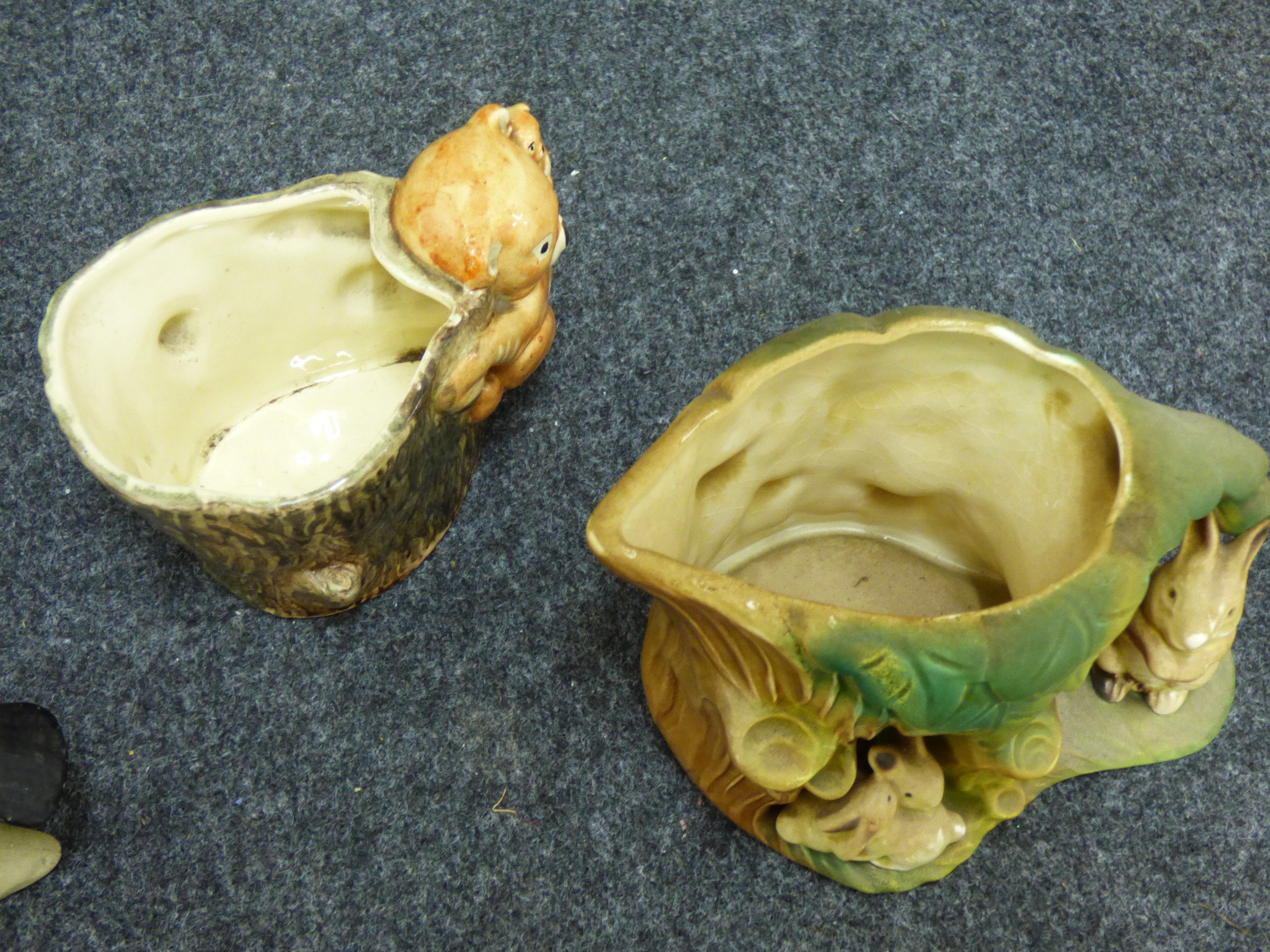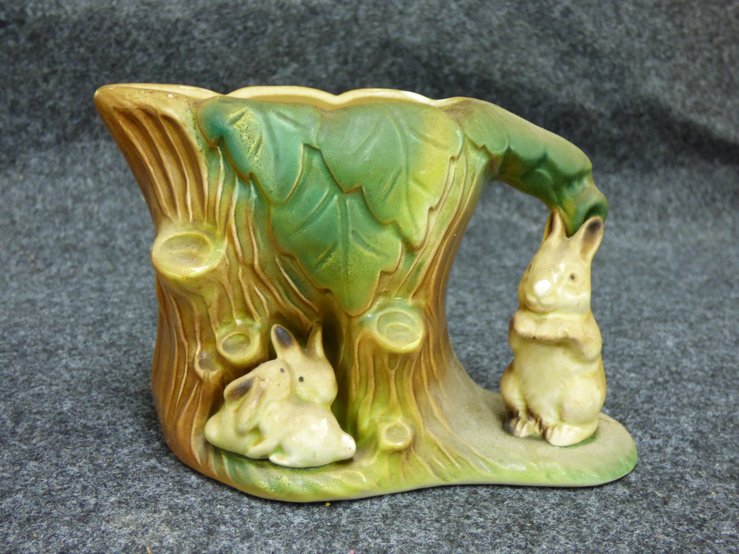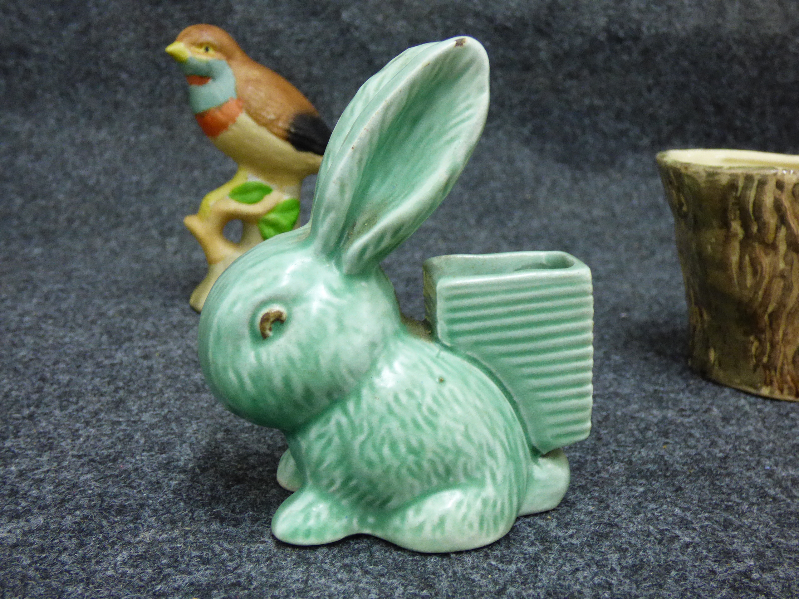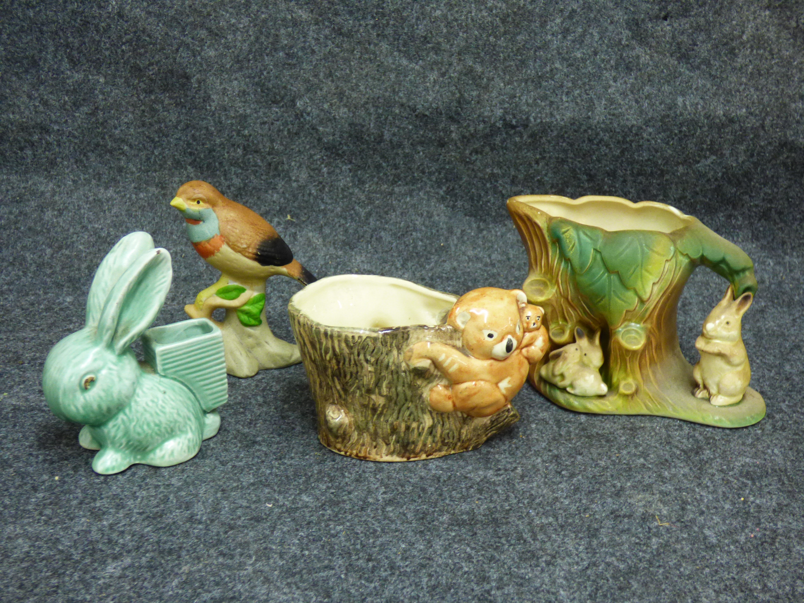 A collection of ceramic items including a green rabbit figurine, a multicoloured bird on a branch, a Brentleigh Ware koala planter, and a Hornsea Pottery rabbit planter.