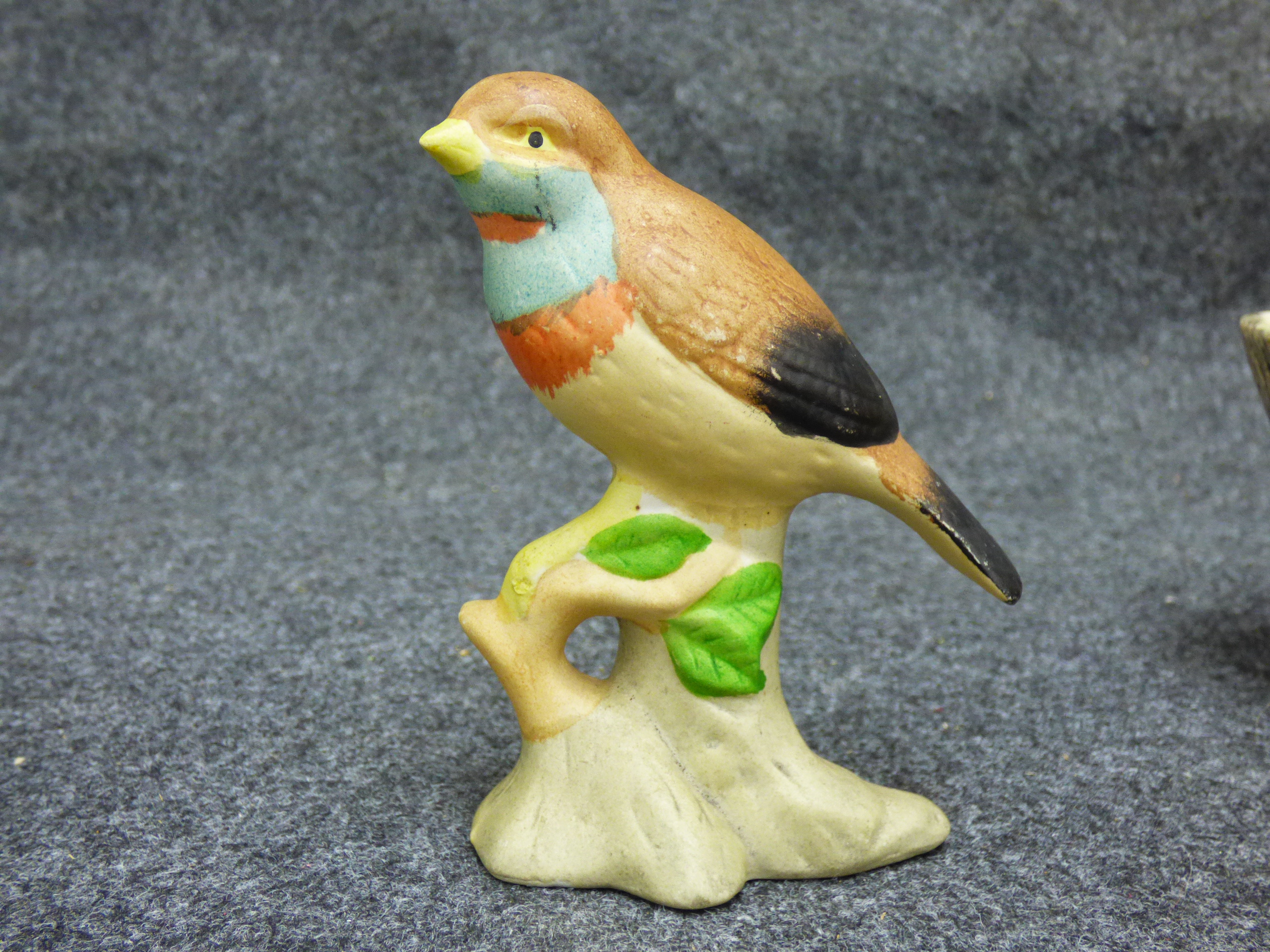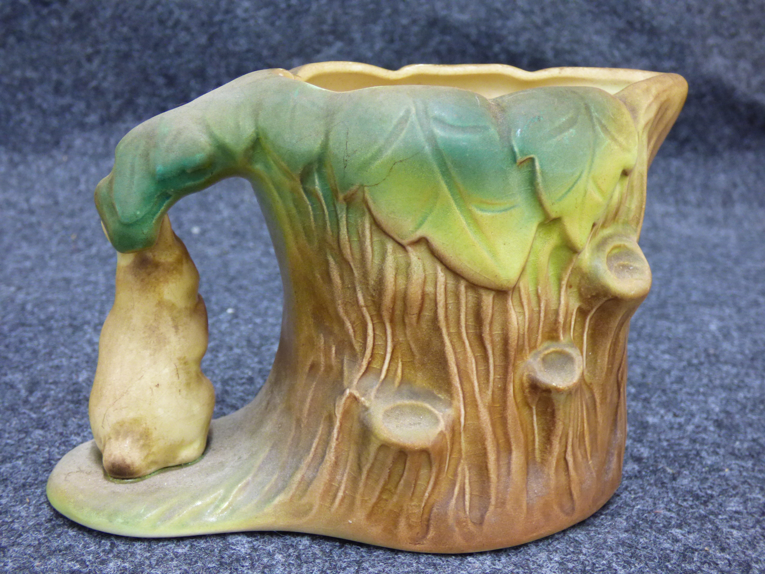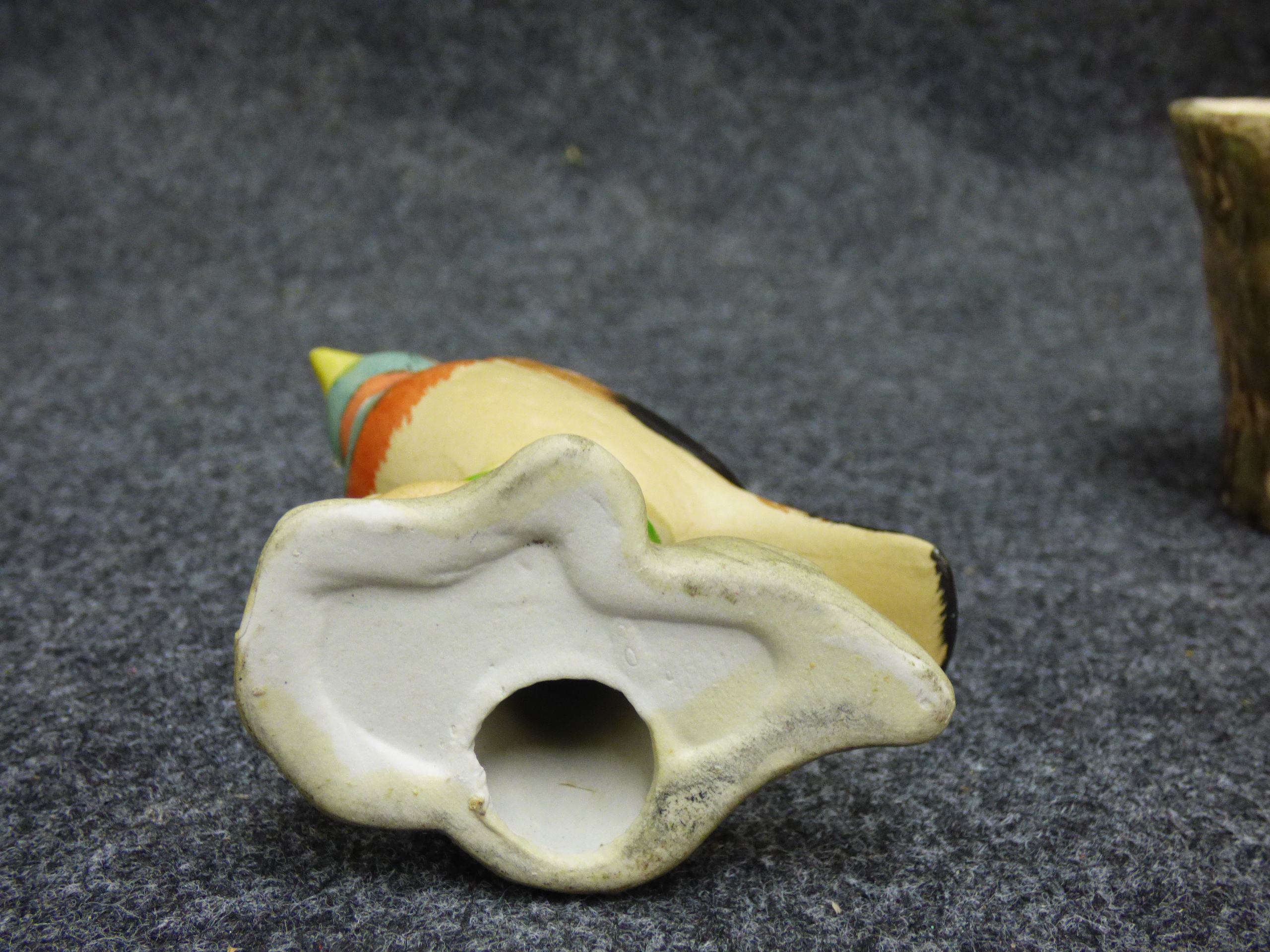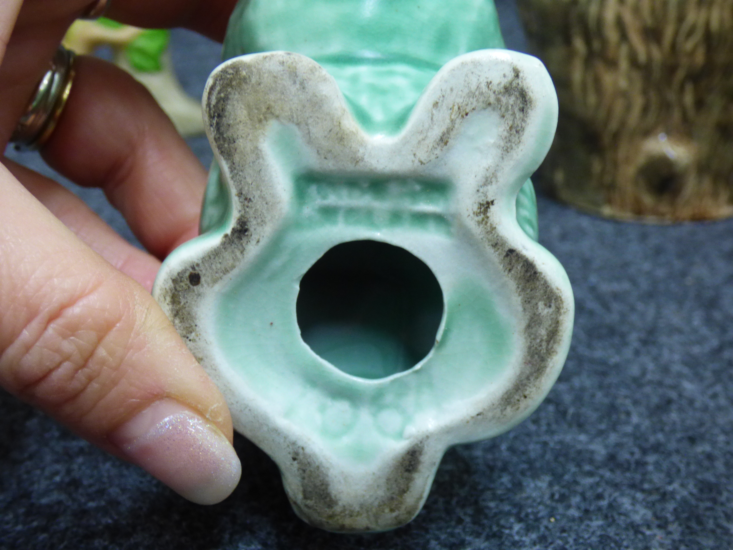 A collection of ceramic items including a green rabbit figurine, a multicoloured bird on a branch, a Brentleigh Ware koala planter, and a Hornsea Pottery rabbit planter.