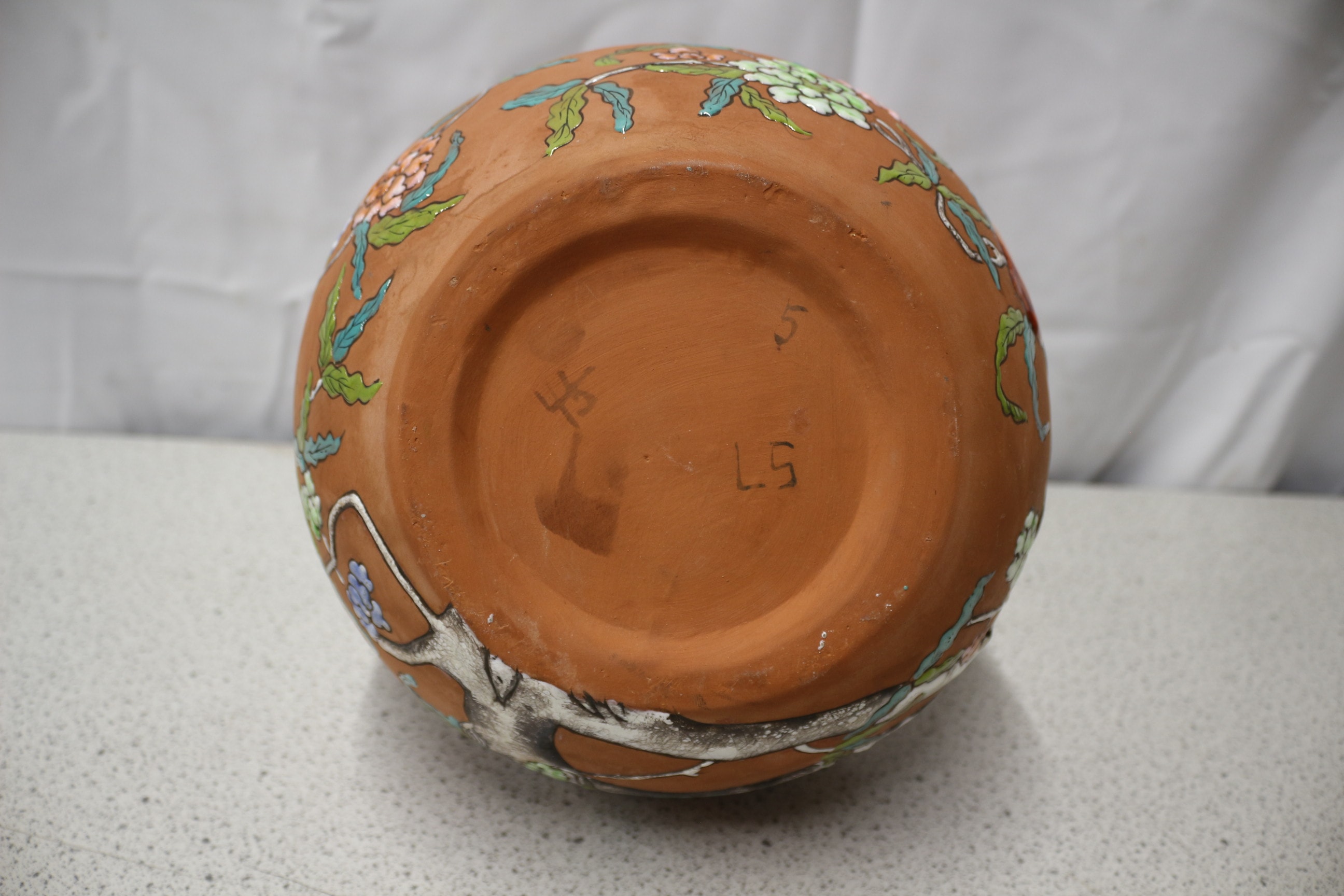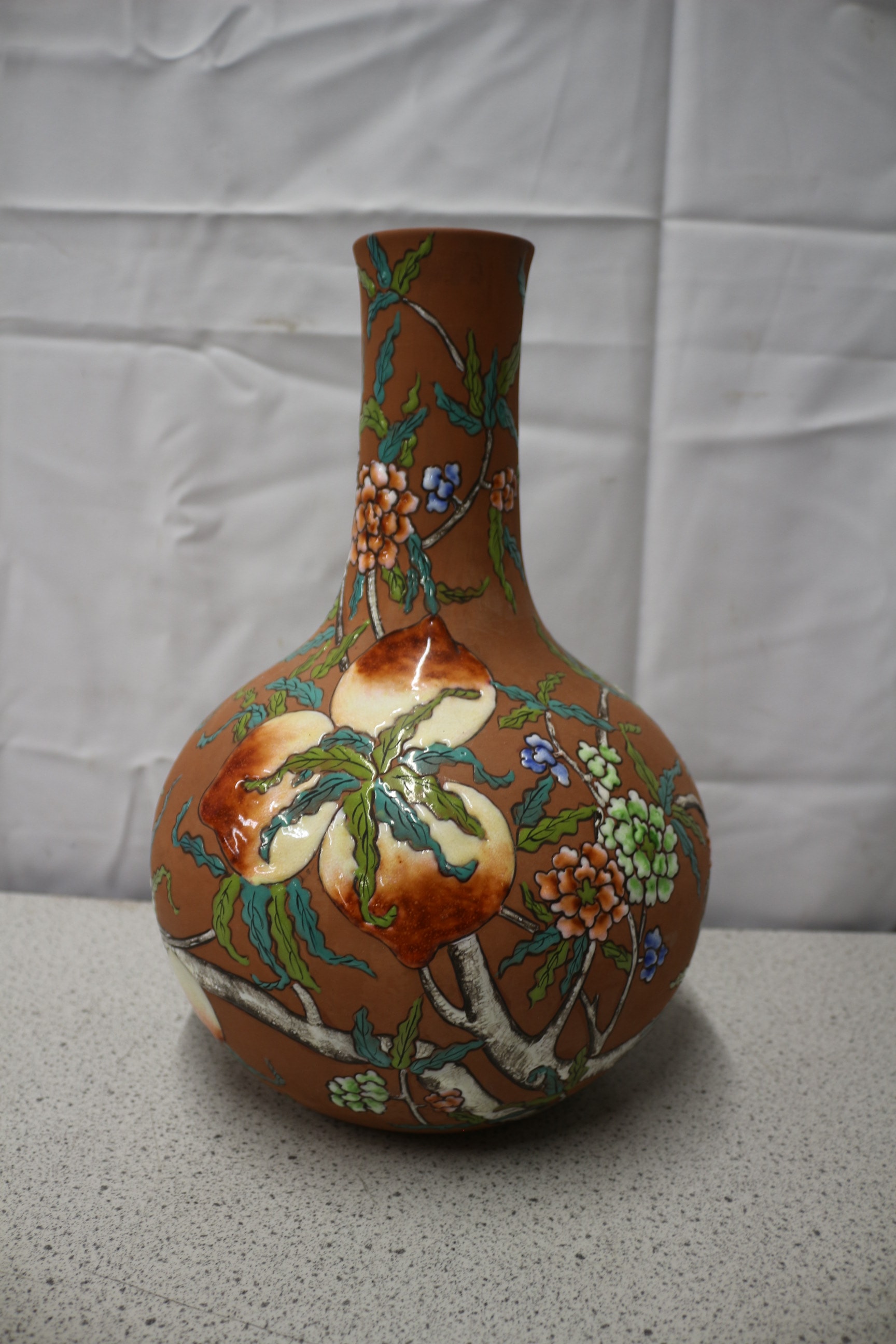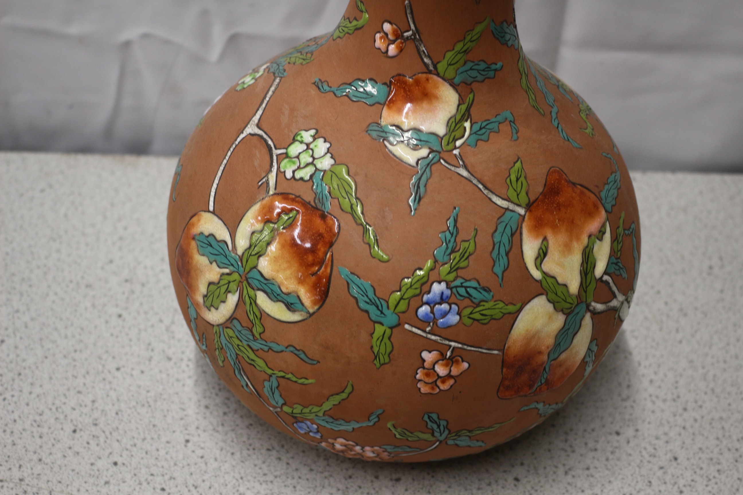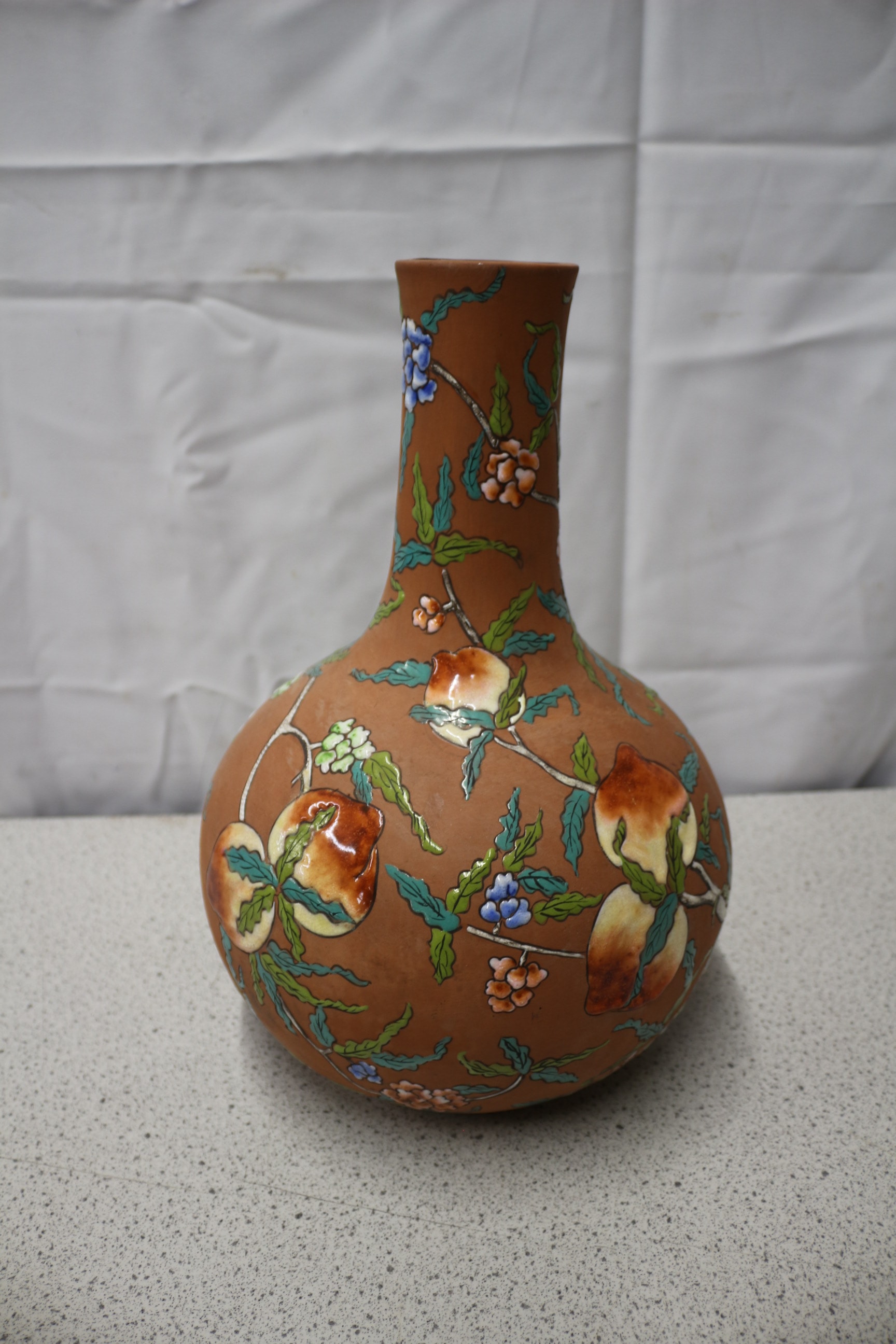 This globular Yixing vase features a tapering neck, crafted from a reddish-brown, unglazed terracotta body. The surface is extensively decorated with a vibrant, slightly raised enamel or painted design, characteristic of an East Asian aesthetic. The decoration depicts flowering branches bearing large, ripened fruit, likely peaches or quinces, alongside various blossoms in tones of blue, orange, green, and white. The glossy finish of the decoration contrasts with the matte ground. On the underside, handwritten marks ’45’, ‘L.S’ (or ‘L.5’), and a single ‘5’ are visible. 35cm Tall
