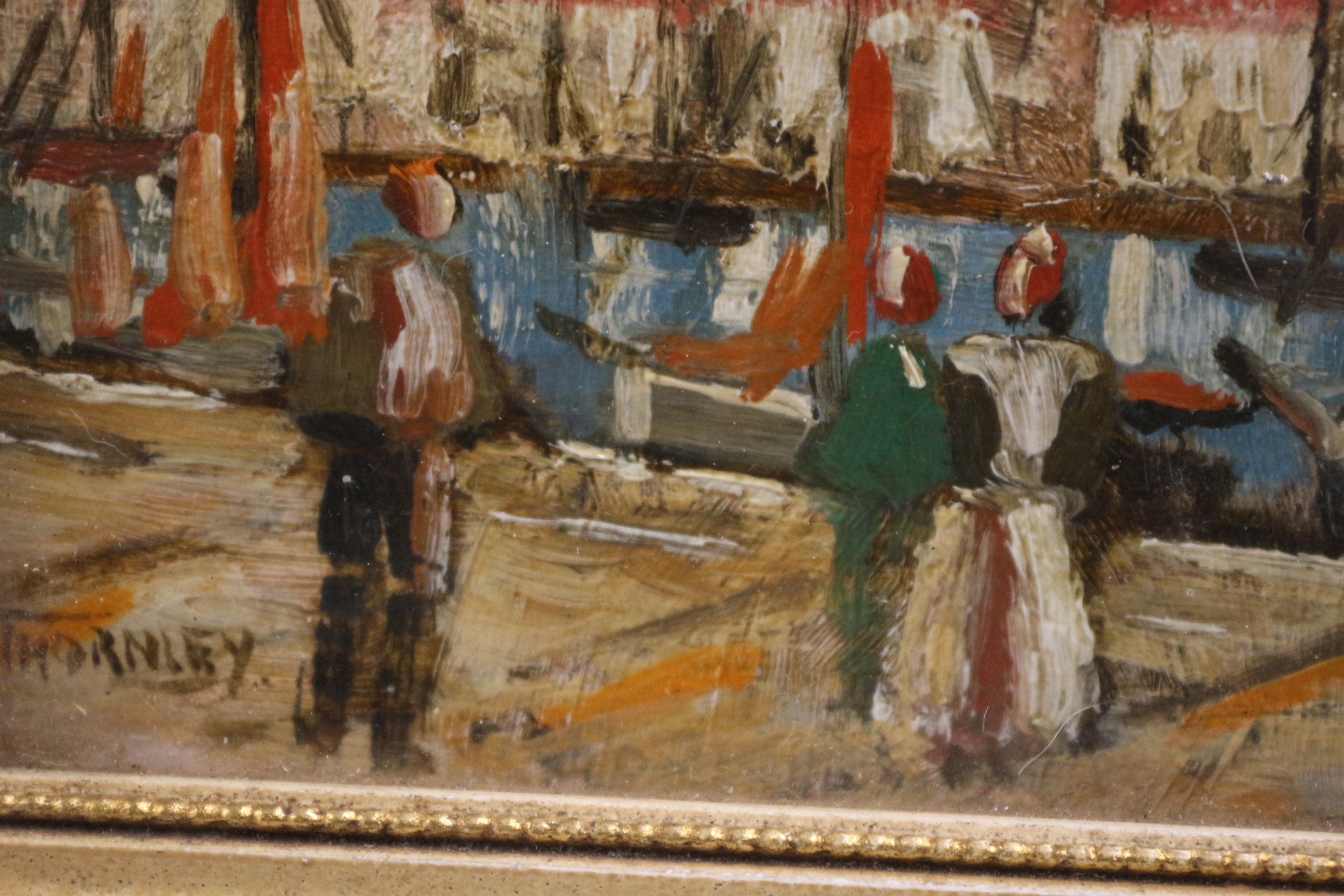 An oil painting signed ‘THORNLEY’ in the lower left corner, depicting a bustling harbour scene. The work features numerous boats, figures on a quay, and a town in the background characterized by red-roofed buildings and a prominent church spire, set against a mountainous backdrop. The painting is executed in an impasto technique with visible brushwork, characteristic of an Impressionistic or Post-Impressionistic style. It is housed under glass within a textured, possibly painted wood frame with a gilded inner rim. 13.5×15.5cm