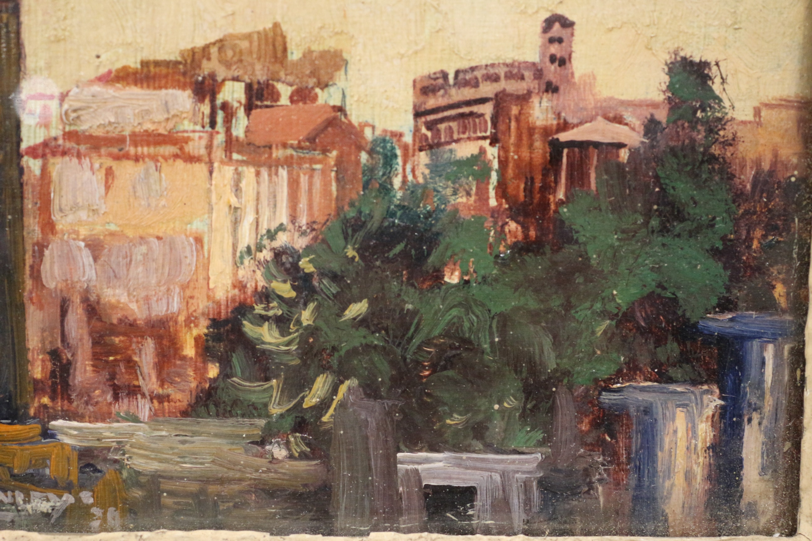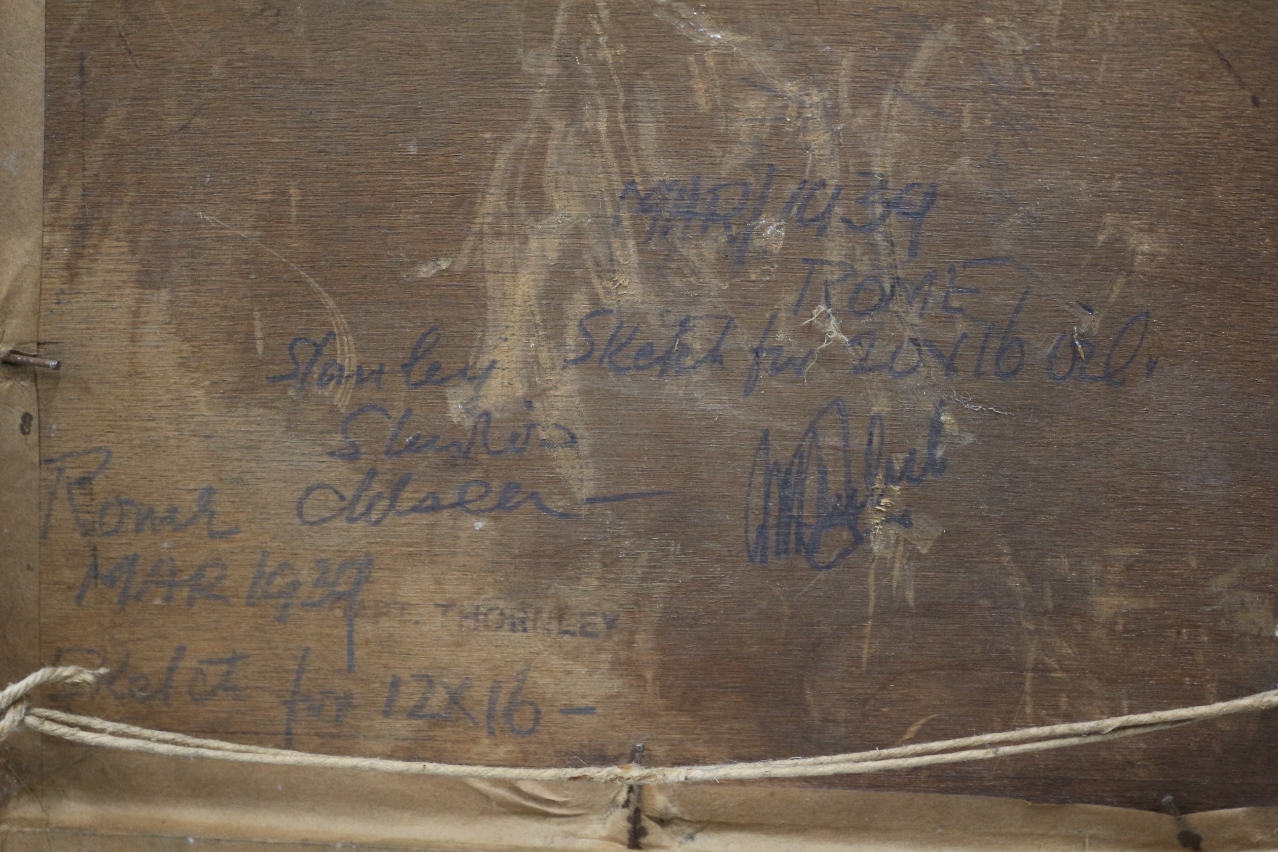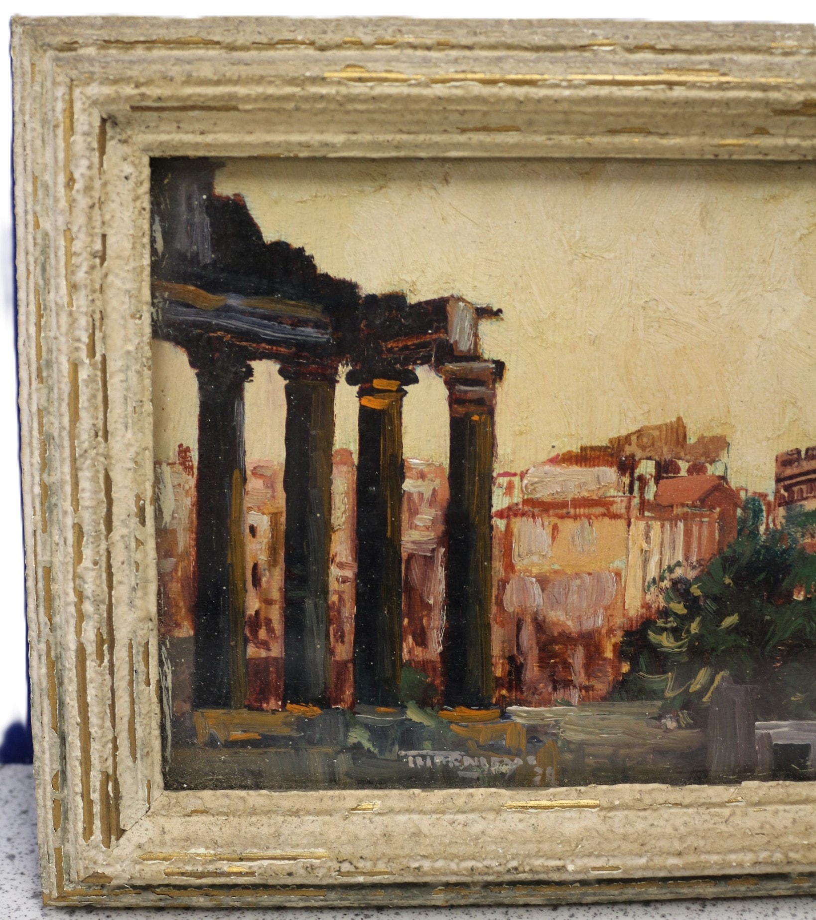 An oil painting on a rigid panel or board, depicting a classical architectural ruin scene with prominent dark columns in the foreground and lighter-toned city buildings in the background, all beneath a pale, textural sky. The artistic style is characterized by thick, visible impasto and broad brushstrokes. The painting is signed ‘INFERNUDA’ in the lower center. The reverse of the panel bears multiple handwritten inscriptions, including ‘980/039,’ ‘ROME, ‘ ‘Stanley Sketch for 20×16 Oil, ‘ ‘Roma Oldseen, ‘ ‘MAR 1939,’ ‘THORNLEY, ‘ and ‘Sketch for 12×16-, ‘ indicating it is a preliminary sketch created in March 1939, depicting a Roman scene, by artist named Thornley. The painting is presented in a distressed, off-white wooden frame with chipped paint revealing gold-coloured accents underneath. 23x18cm