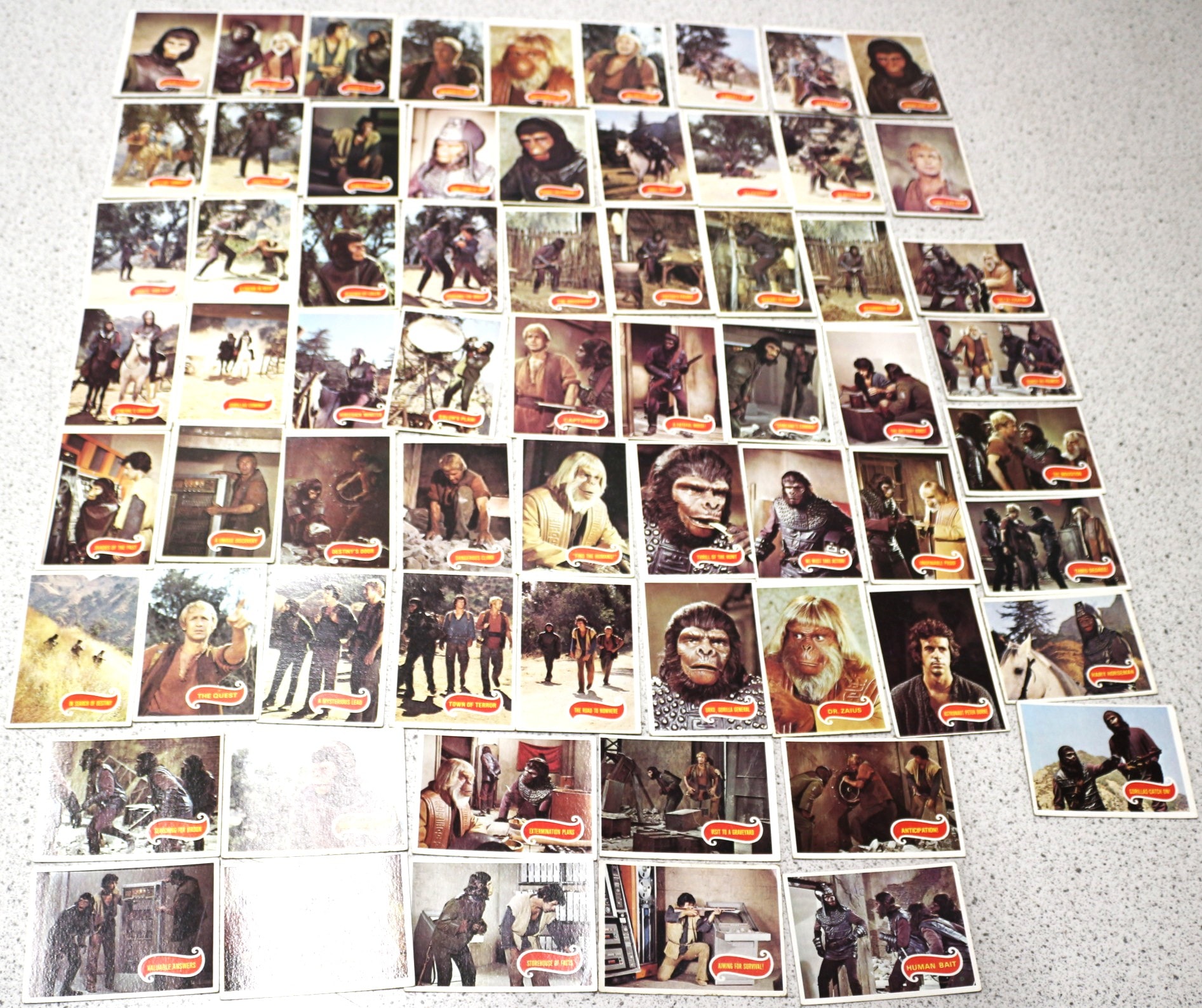 A believed to be full set collection of 66 Rare Topps Planet of the Apes 1975 trading cards. This substantial collection, numbering over one hundred cards, features colour photographic stills from the “Planet of the Apes” media franchise. The cards depict various human and ape characters, scenes, and action shots, consistent with the style and aesthetic of late 1960s to early 1970s film and television productions. Each card is constructed from paper or cardstock and framed by an orange-red border with descriptive white English text at the bottom, identifying characters or plot points, such as “DR. ZAIUS, ” “DOGGY MCDOWALL, ” “THE KEY, ” “CHARGING THE BRUTE, ” and “MARC EVANS IS FREE!”