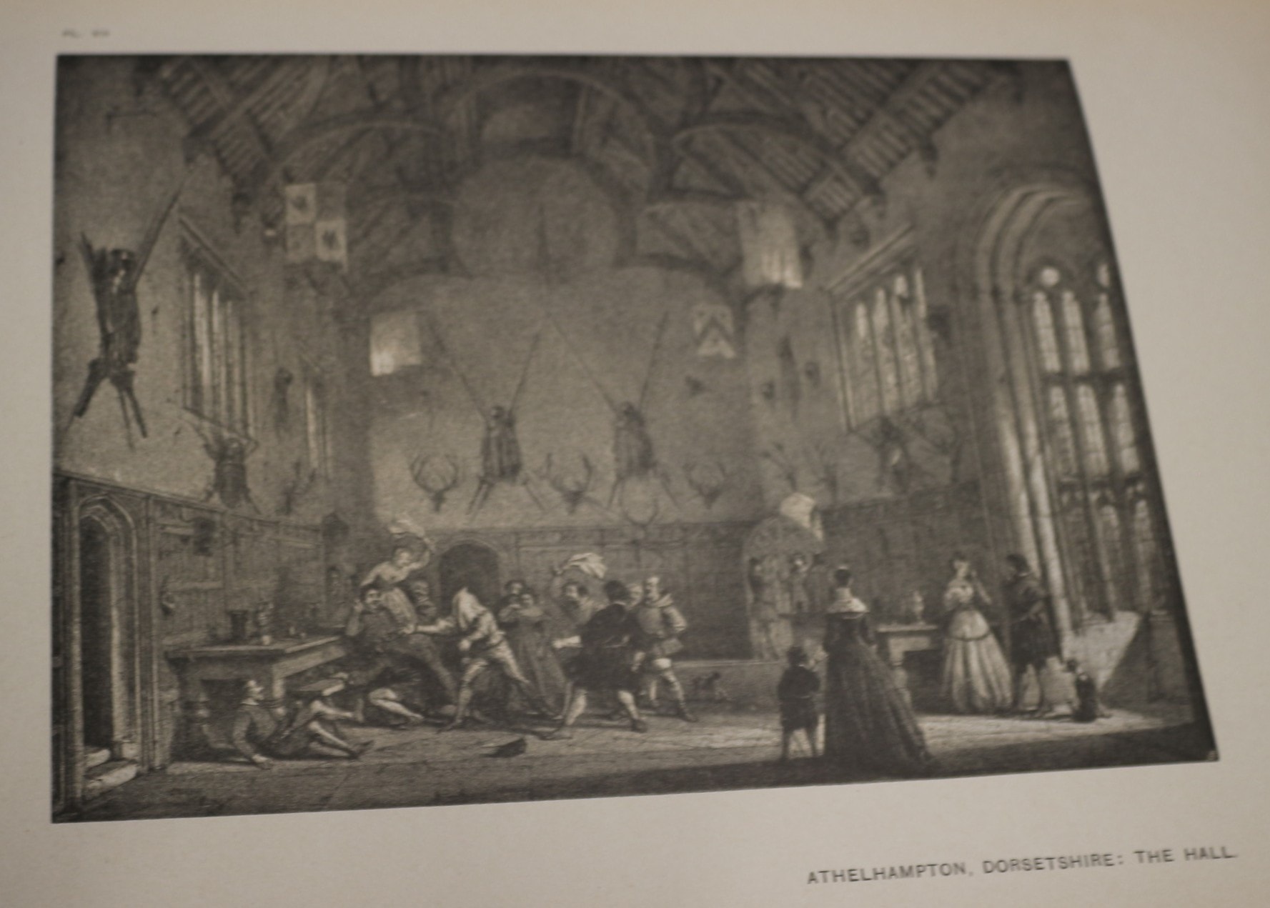 The Mansions of England in the Olden Time by Joseph Nash, published as ‘The Studio Special Winter Number 1905-1906’. This early 20th-century printed book features a cream-coloured cardstock cover and green patterned endpapers. The light-coloured fabric spine is embossed with gold text. Internally, it comprises primarily paper pages with black and white illustrations depicting historical English interiors and exteriors, including ‘ATHELHAMPTON, DORSETSHIRE: THE HALL’ and ‘BURLEIGH, NORTHAMPTONSHIRE: THE STAIRCASE’.