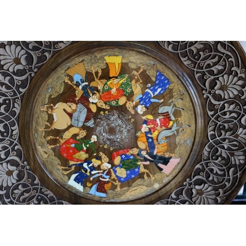 This item comprises a circular decorative plate presented within a custom rectangular hinged case. The case is clad in dark green velvet, lined with cream satin, and features brass-toned clasps. The plate itself is crafted from wood, featuring a central section adorned with a vibrant hand-painted scene depicting a procession of numerous figures in traditional attire on camels and a donkey, rendered in a style characteristic of Persian or Middle Eastern miniature painting, possibly under a clear protective coating. This central medallion is framed by a deeply carved wooden border showcasing intricate arabesque or scrolling foliate patterns. The reverse of the plate reveals natural wood grain and is fitted with a small metal hanger. No visible text, signatures, or maker’s marks are apparent on either the plate or its case.