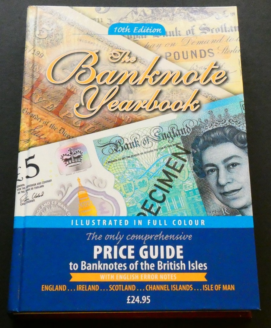 A modern printed reference book, “The Banknote Yearbook, 10th Edition, ” featuring a glossy cover. The design prominently displays images of British banknotes, including a £5 Bank of England note with Queen Elizabeth II’s portrait marked “SPECIMEN, ” and background elements from a Bank of Scotland note. The cover text identifies the object as “The only comprehensive PRICE GUIDE to Banknotes of the British Isles, ” encompassing “ENGLAND… IRELAND… SCOTLAND… CHANNEL ISLANDS… ISLE OF MAN, ” and detailing “WITH ENGLISH ERROR NOTES.” The publication is “ILLUSTRATED IN FULL COLOUR” and contains 536pp