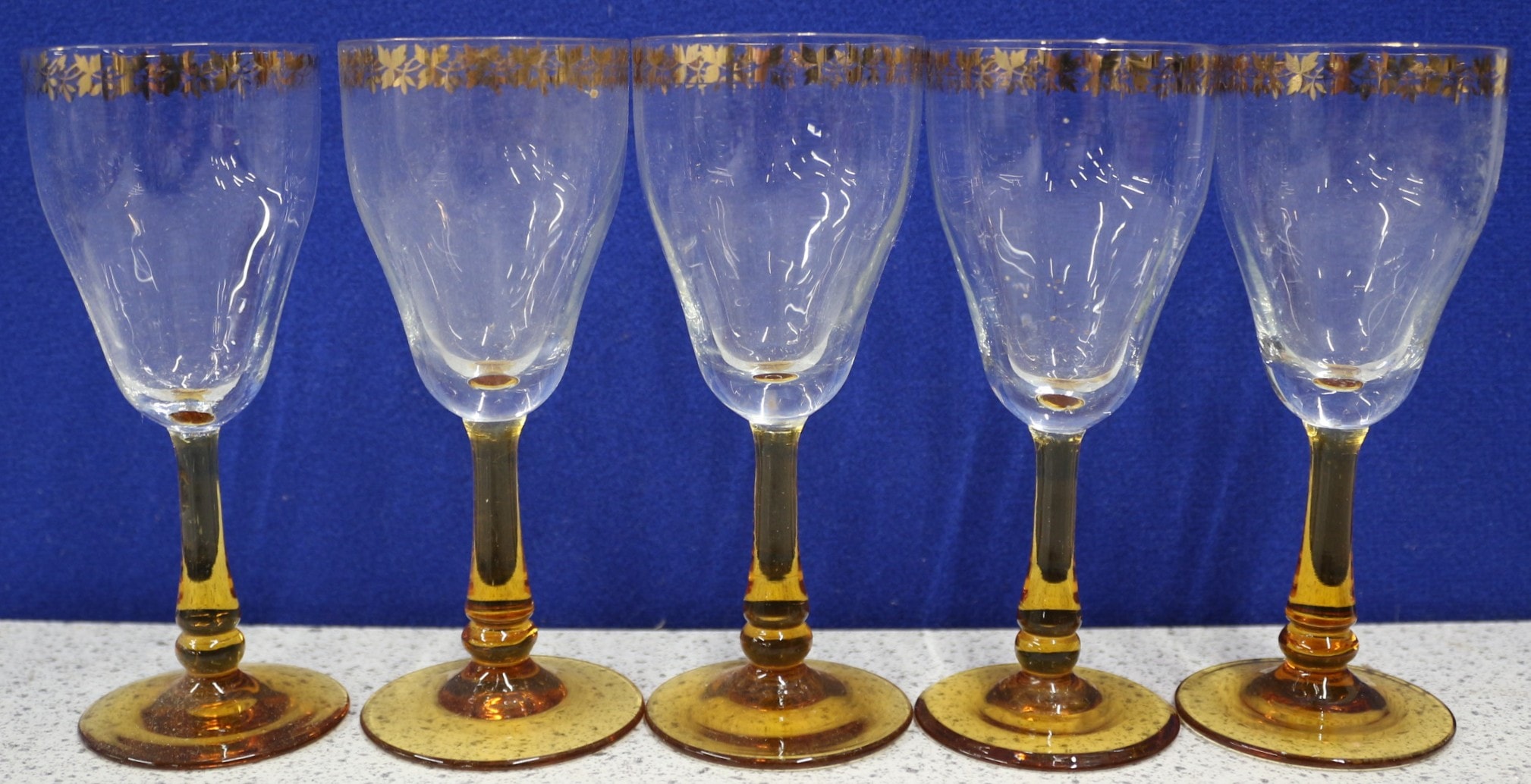 A set of five clear glass goblets, each featuring an amber-coloured stem and a circular amber-coloured base. The rims of the goblets are adorned with a repeating band of gold-coloured decoration depicting a stylized leaf or vine pattern. No visible text or manufacturer’s markings are apparent.