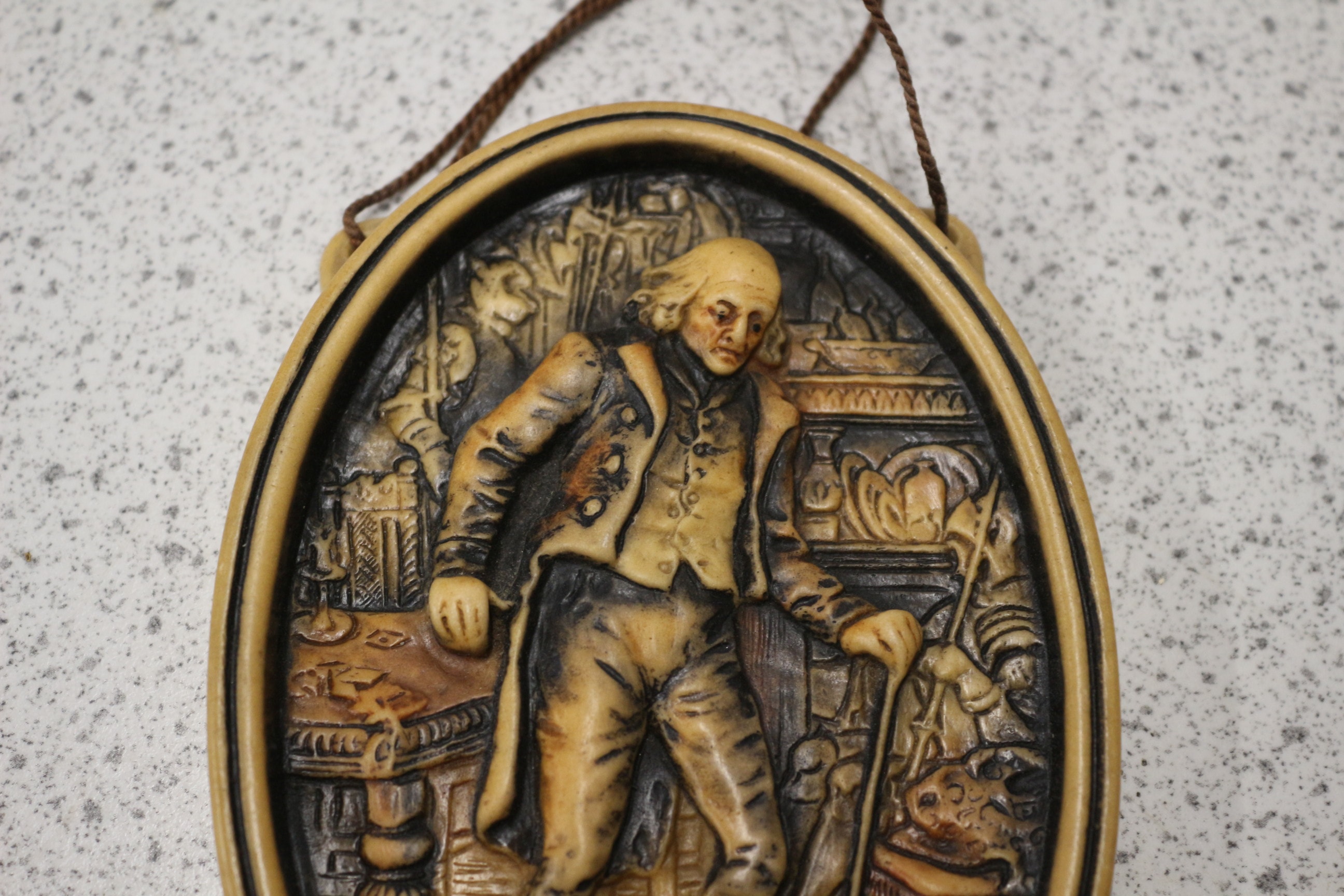 An Arthur Osborne Ivorex Plaque, titled ‘The Grandfather’. This oval-shaped decorative wall plaque features a high-relief carving of a gentleman in 18th-century European-style attire, holding a walking stick amidst ornate furnishings, evoking a historical genre scene. The plaque is made from a molded composite material or resin, finished with a two-tone patina simulating carved wood, with darker hues highlighting the recesses and lighter tan on the raised elements. The item is fitted with a braided brown hanging cord. 12.5cm tall