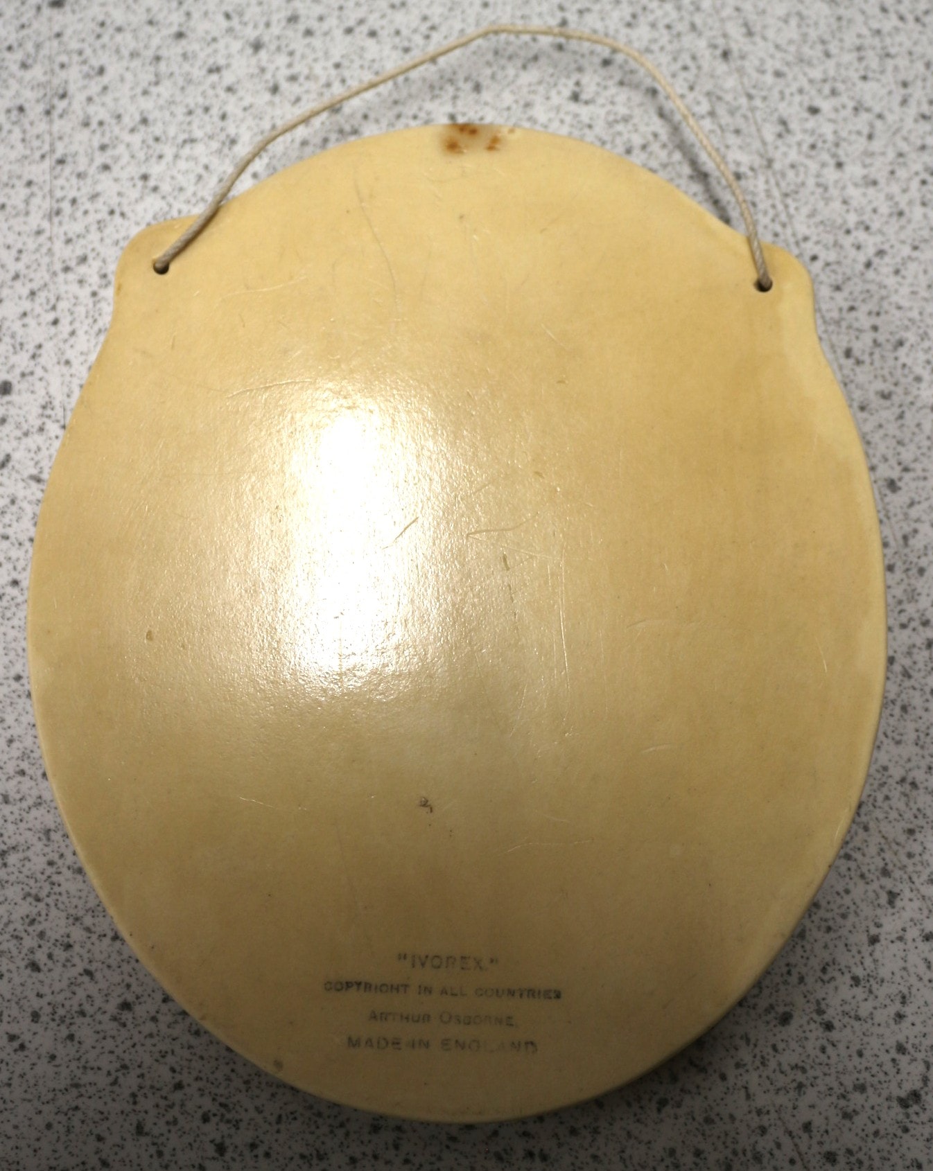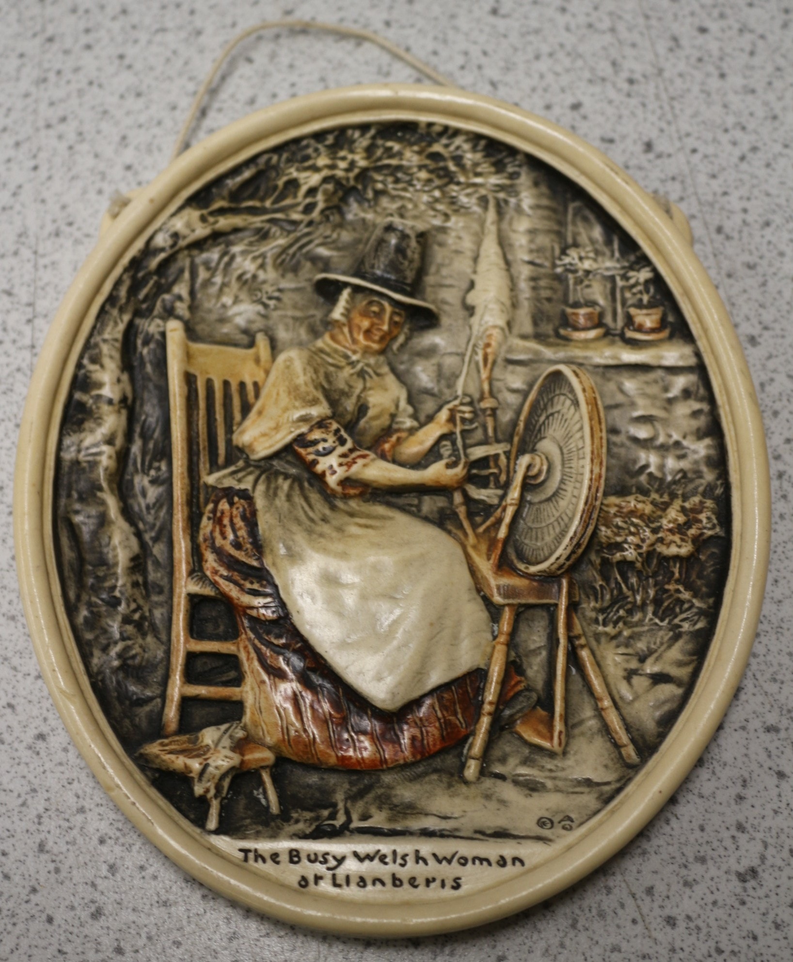 An Arthur Osborne Ivorex wall plaque, titled ‘The Busy Welsh Woman of Llanberis’. This oval-shaped decorative plaque, crafted from a molded composition material known as Ivorex, dates from the early 20th century, likely around 1930. The relief depicts a naturalistic genre scene of a smiling Welsh woman, dressed in traditional attire including a tall hat, seated and operating a spinning wheel within an interior setting with some outdoor elements visible. The front is inscribed “The Busy Welsh Woman of Llanberis, ” along with faint initials, possibly “G.S.” The reverse confirms its origin with the markings “IVOREX.”, “COPYRIGHT IN ALL COUNTRIES”, “ARTHUR OSBORNE”, and “MADE IN ENGLAND, ” accompanied by a faintly visible date, likely “1930,” along the edge. The plaque retains its original hanging cord. 17cm