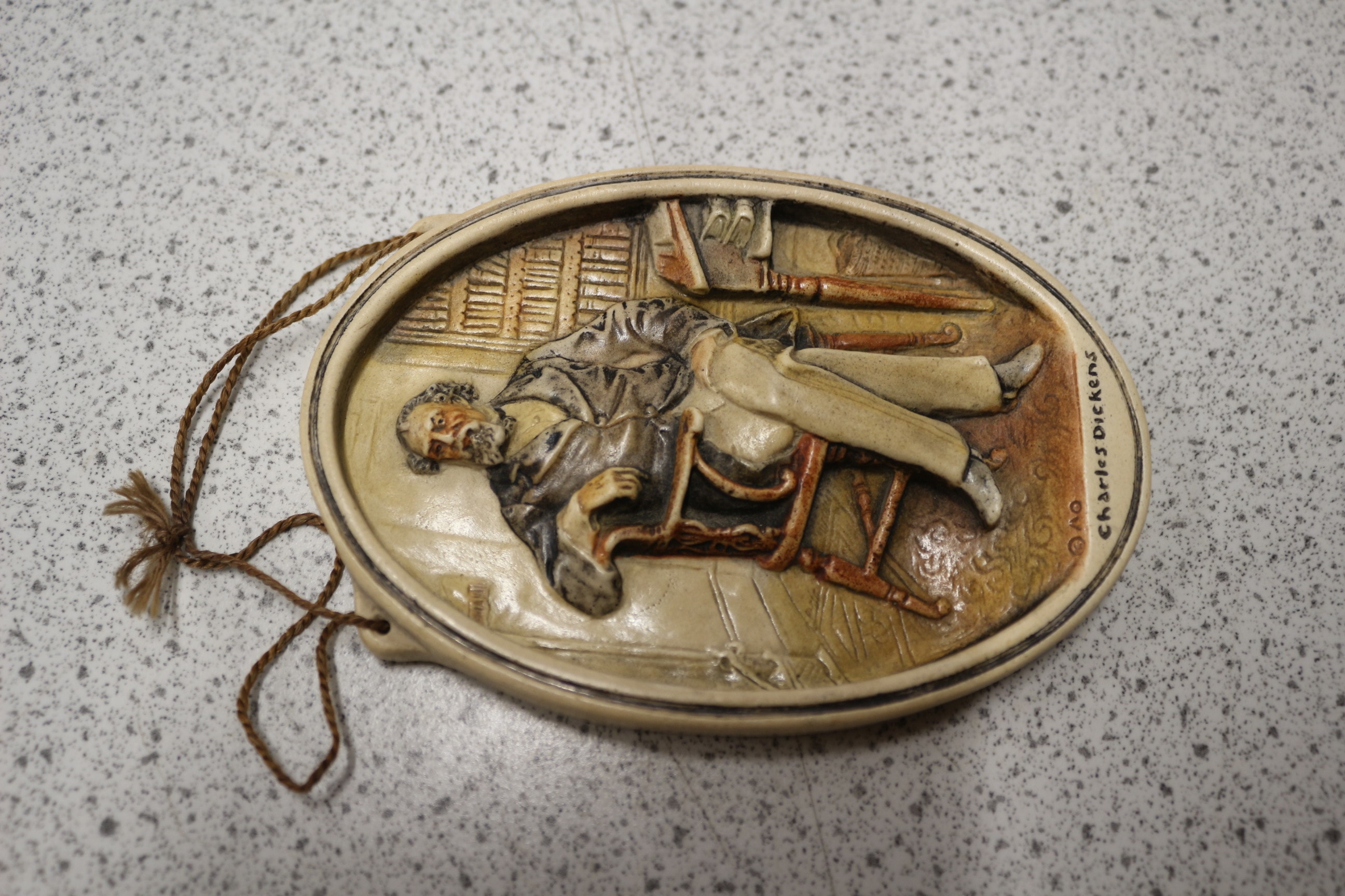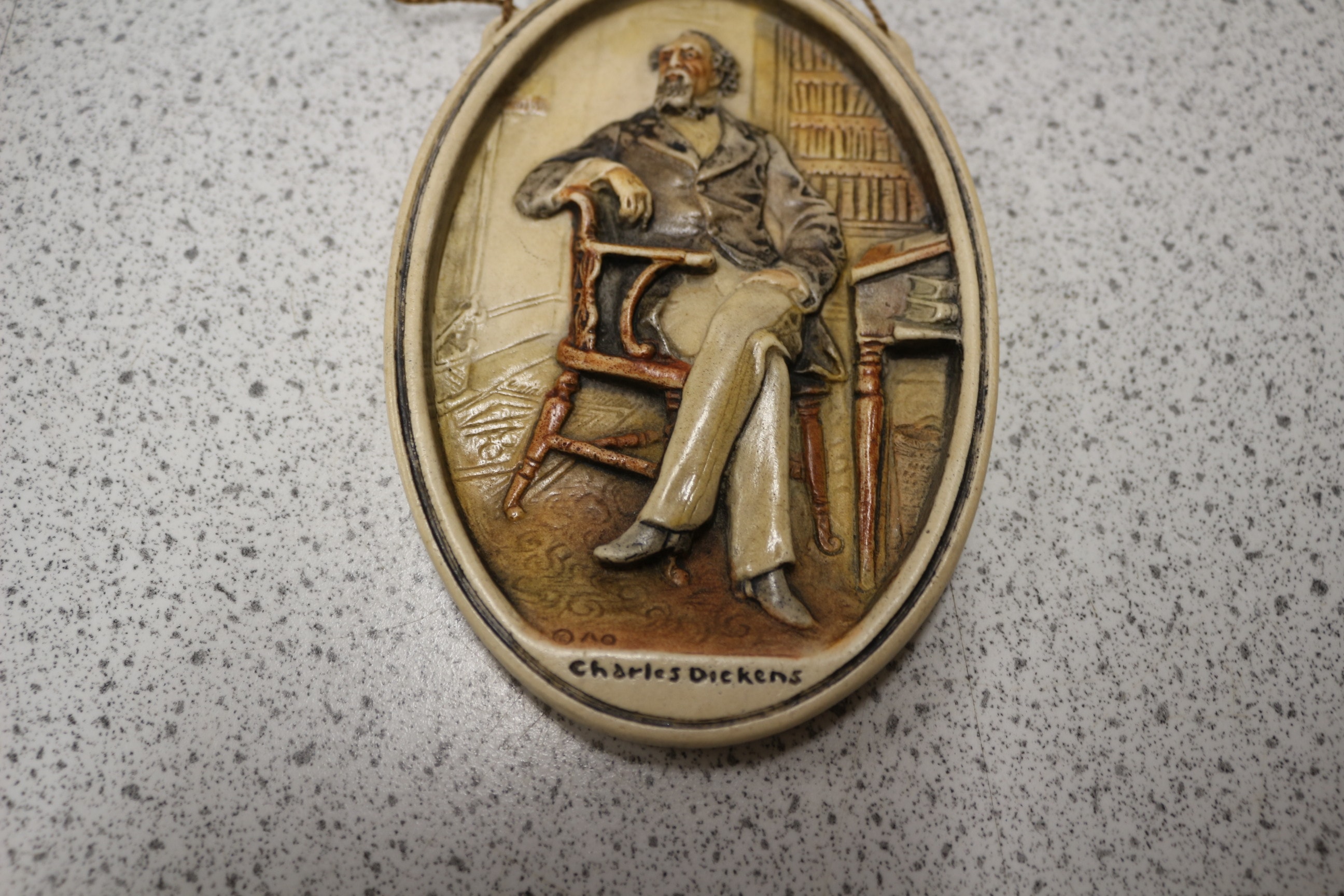 An Osborne Ivorex Charles Dickens Wall Plaque. This oval, molded relief plaque depicts a seated figure of Charles Dickens, identified by the inscribed text at the bottom. The man is rendered in a naturalistic style, suggestive of the Victorian era, within a study setting featuring bookshelves and a desk. The plaque is executed with a multi-toned finish in shades of cream and brown. It is constructed from a composite material, possibly resin or plaster, and fitted with a braided string for hanging. 12.5cm