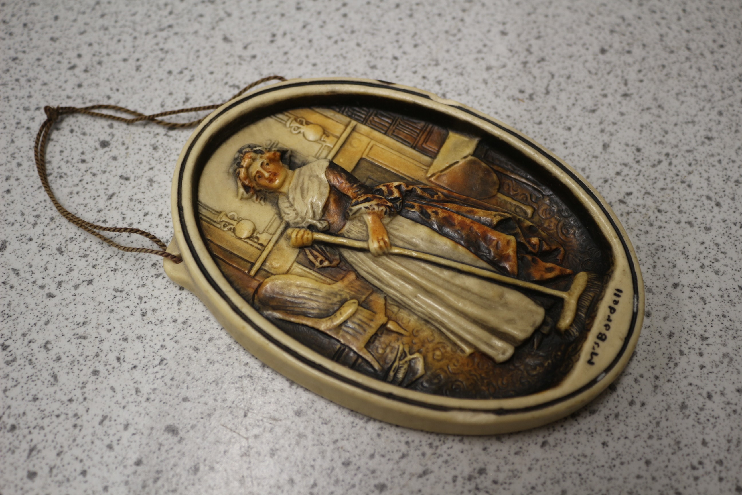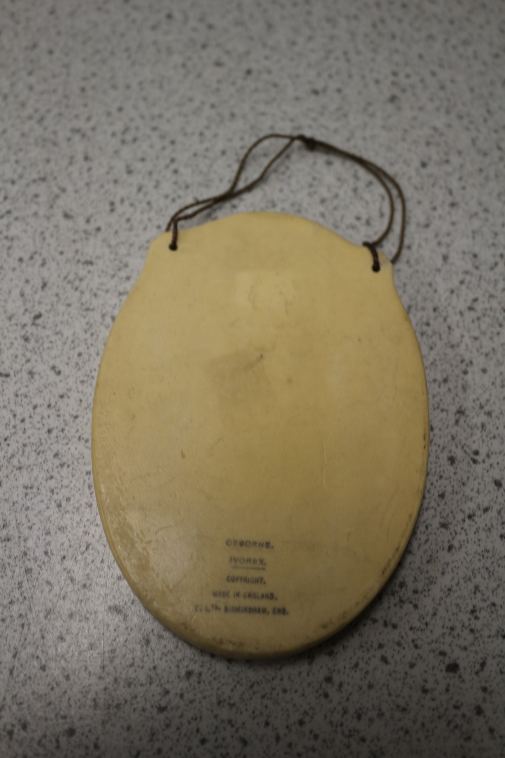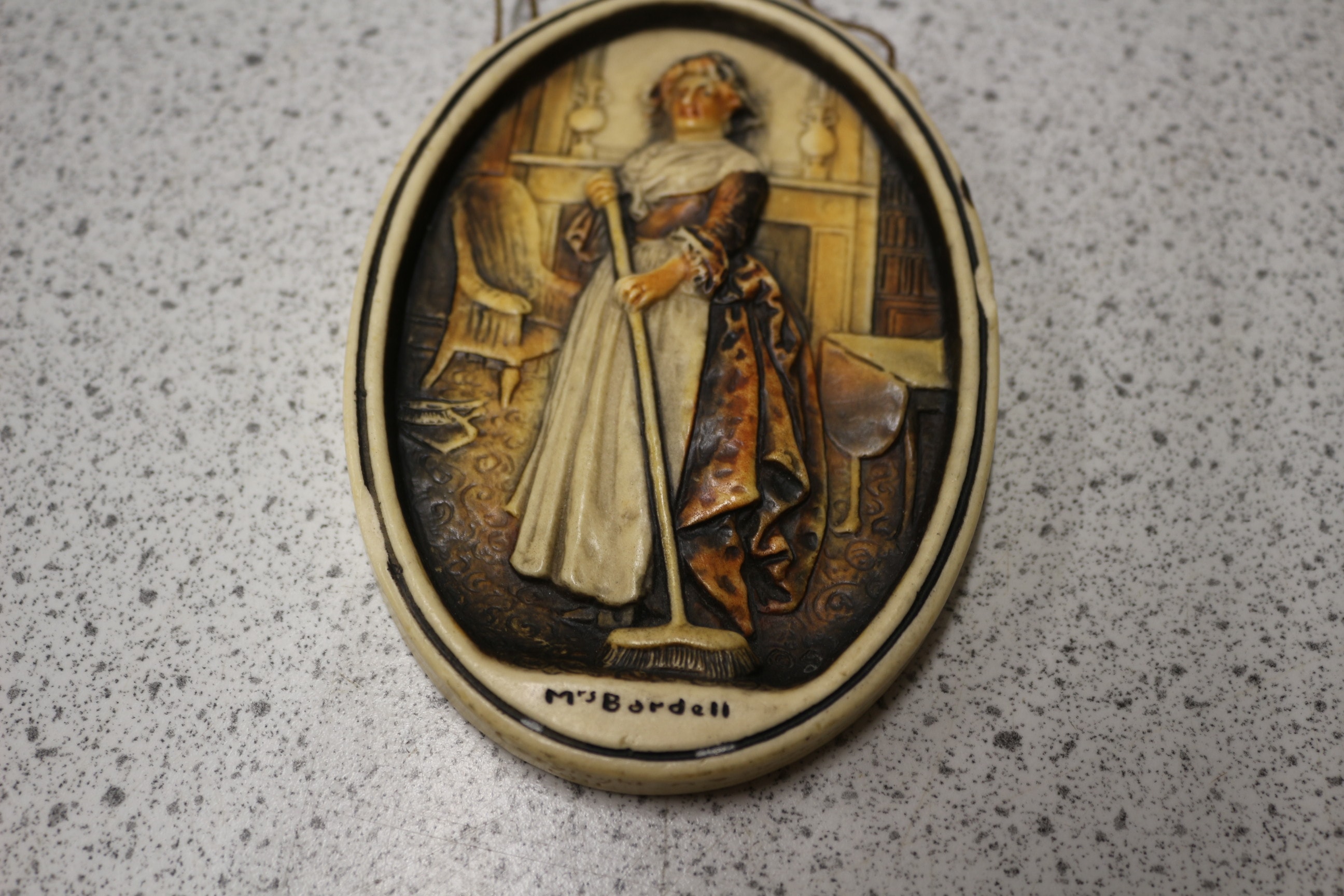 An Arthur Osborne Ivorex wall plaque depicting ‘Mrs. Bardell’ from Charles Dickens’ *The Pickwick Papers*. This oval-shaped, high-relief molded composite plaque features a genre scene of a woman in historical attire, holding a broom within a domestic interior, complete with a fireplace, chair, and table. The material has a creamy, bone-like finish with darker tones accentuating the relief details. The front lower edge is inscribed ‘M$^rs$ Bordell’. The reverse is impressed with ‘IVOREX’, ‘OSBORNE, ‘, ‘COPYRIGHT, ‘, ‘MADE IN ENGLAND, ‘, and ‘F. & C.O. BURNHAM, ENG.’. A braided cord is attached for hanging. 12.5cm
