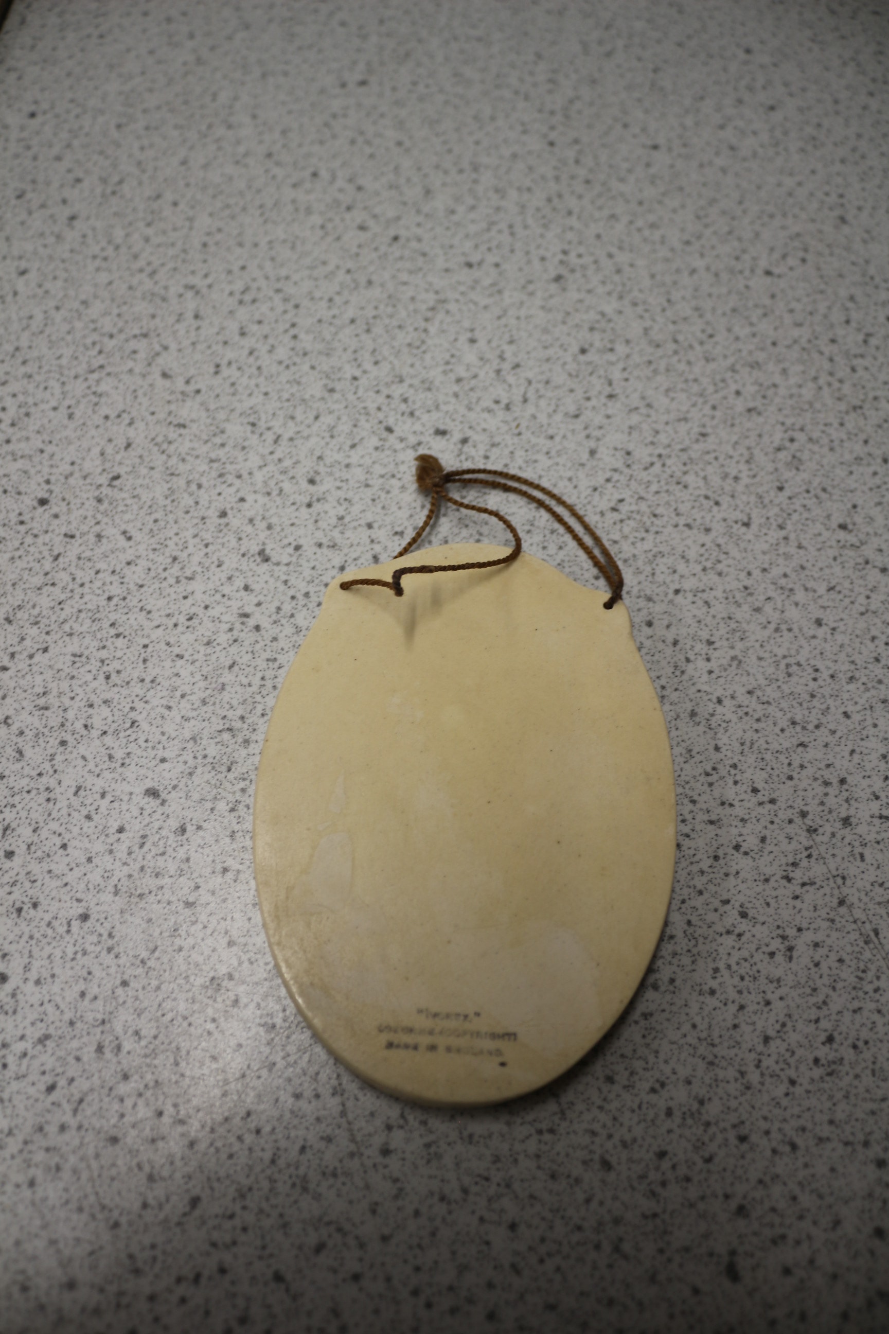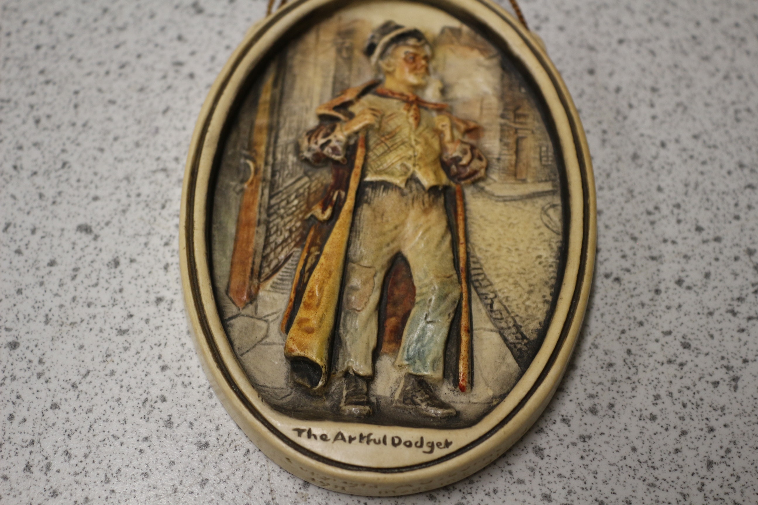 An Arthur Osborne Ivorex wall plaque featuring a hand-painted, high-relief depiction of ‘The Artful Dodger’ from Charles Dickens’ *Oliver Twist*. The oval, molded resin plaque presents a male figure in period attire, including a vest, trousers, long coat, and hat, rendered with expressive, somewhat caricatured features against a street scene background. The inscription “The Artful Dodger” is visible at the bottom front. The reverse side bears a copyright date of “© 1982” and “Made in England.” The item retains its original braided twine hanger. 12.5cm