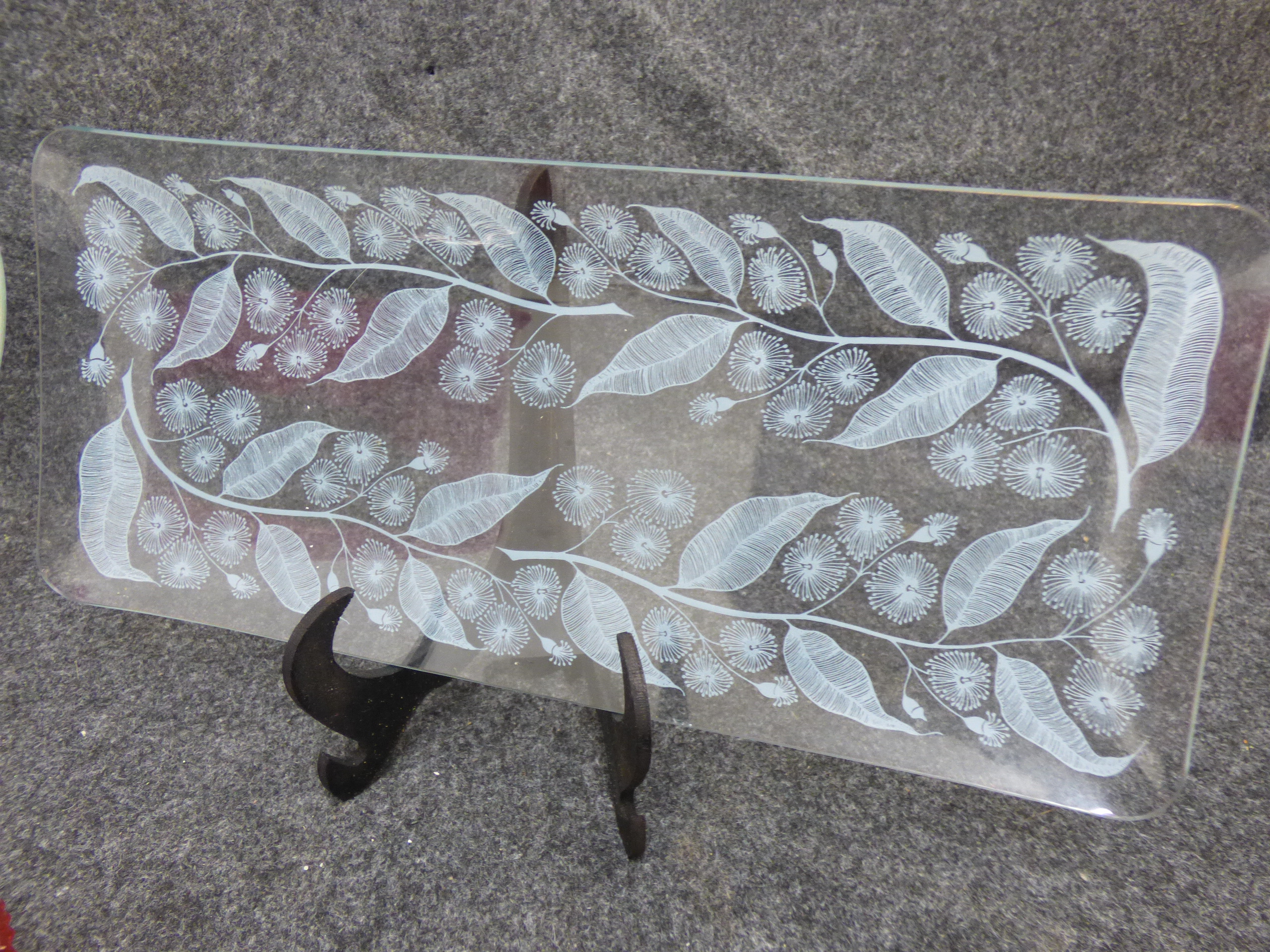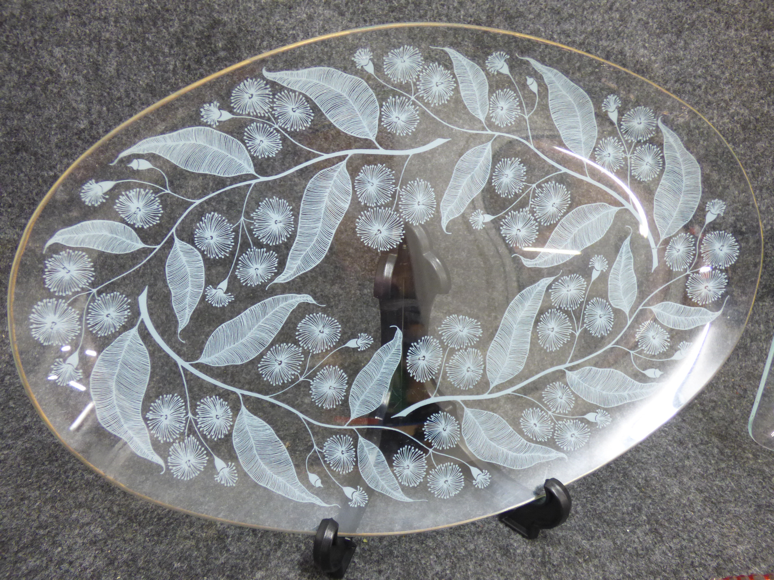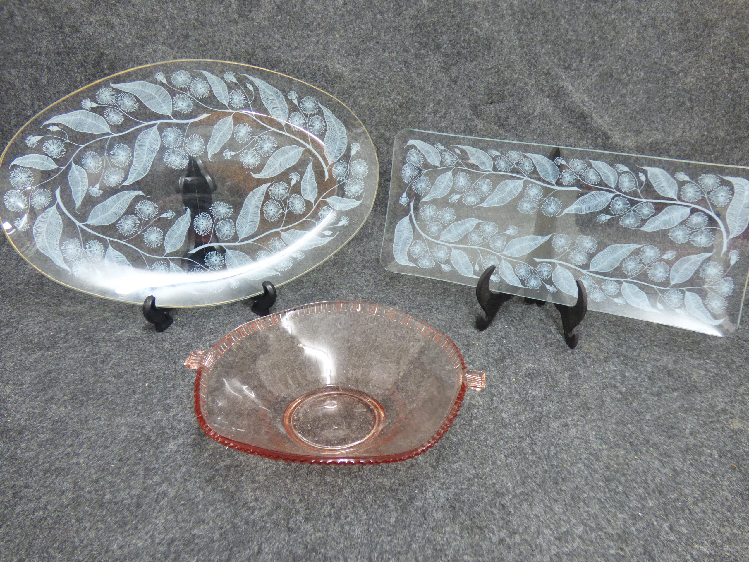 A trio of glass serving pieces featuring two clear platters with white etched floral designs and one pink glass bowl with integrated handles. Oval serving platter 35cm wide