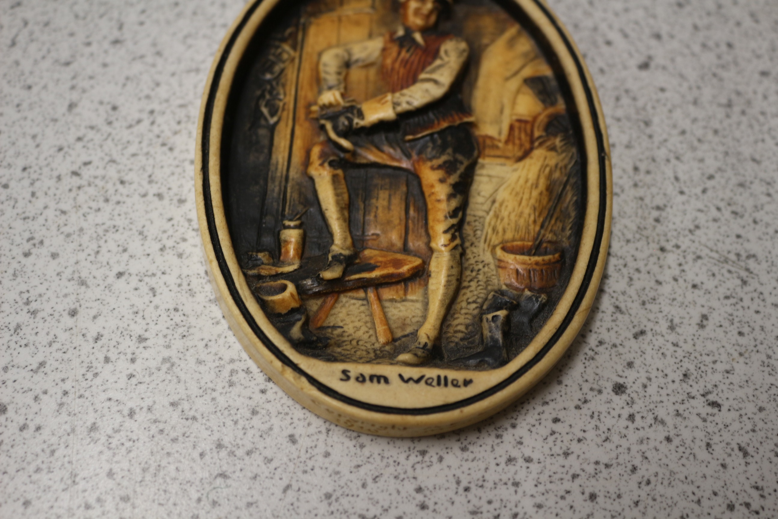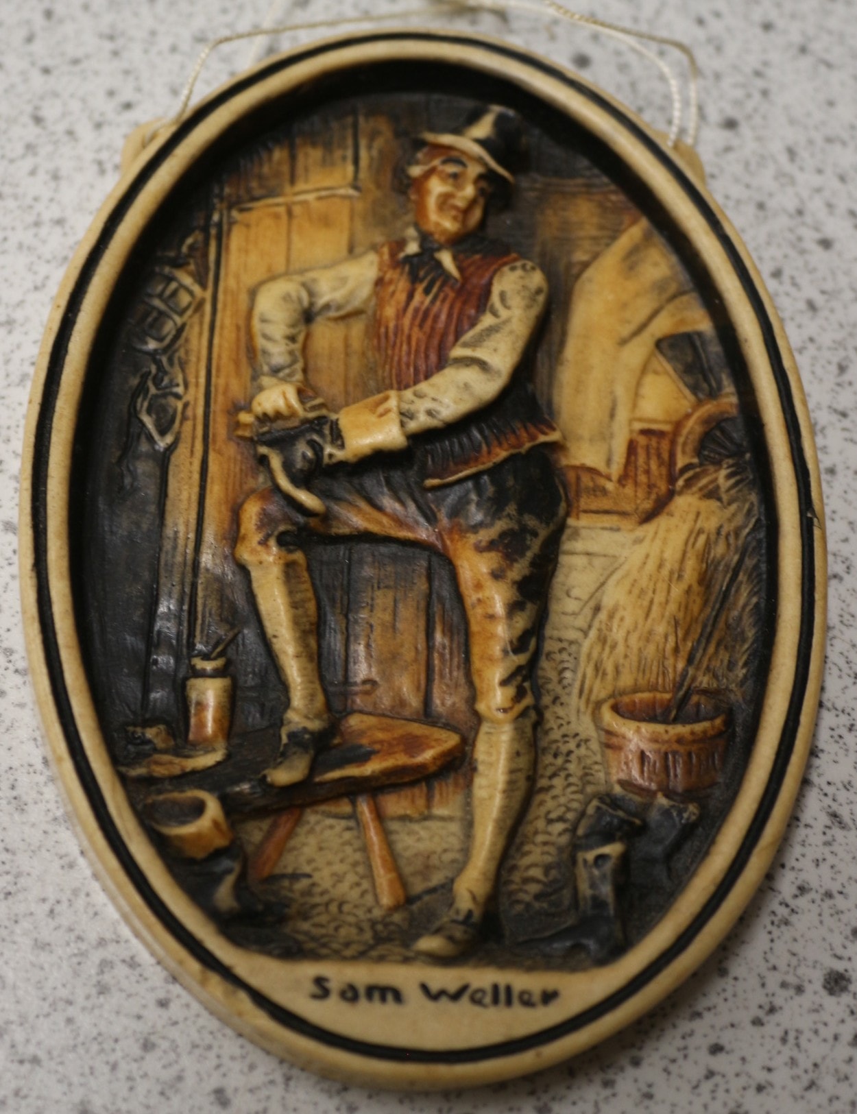 An Arthur Osborne Ivorex wall plaque, oval-shaped and featuring a high-relief molded scene. The plaque depicts a male figure, likely a shoemaker or cobbler, wearing traditional attire including a hat, waistcoat, and knee breeches, actively working on a shoe while seated on a stool within an interior workshop setting. The plaque exhibits a two-tone appearance, mimicking carved wood or aged resin, with darker recesses defining details and providing depth. In raised script along the bottom edge, the name “Sam Weller” is visible. A simple string hanger is attached at the top. 12.5cm