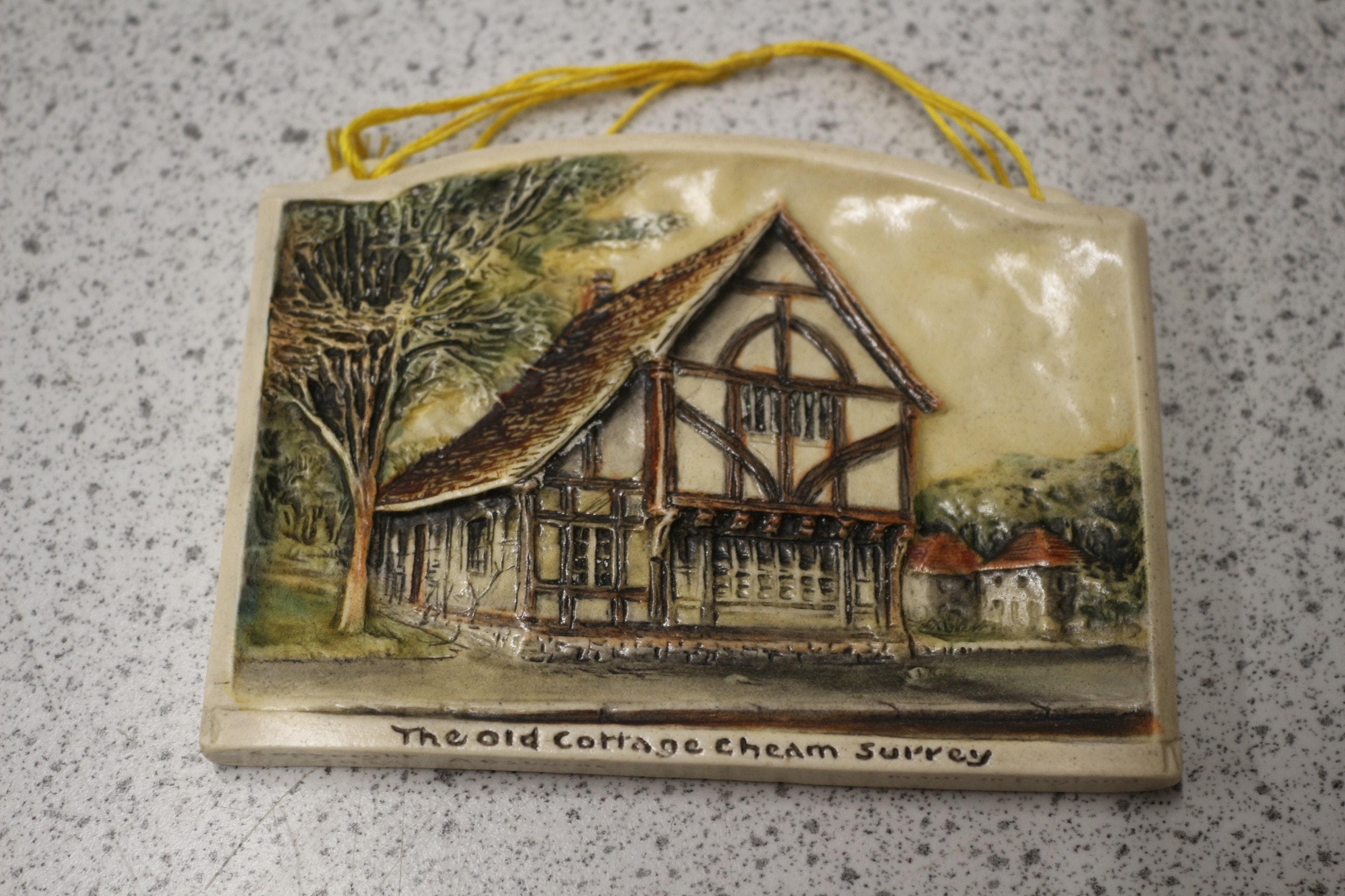 An Arthur Osborne Ivorex relief-molded ceramic wall plaque, rectangular in form. It features a detailed depiction of a half-timbered cottage with a prominent tree to its left and smaller buildings in the background, suggesting a traditional English architectural style. The plaque is primarily in muted tones of brown, green, and cream, with a semi-glossy finish on the front. The reverse is unglazed or matte. Along the bottom edge, the text “The Old Cottage Cheam Surrey” is inscribed in black script. A yellow braided cord is attached at the top for hanging. 12.5cm
