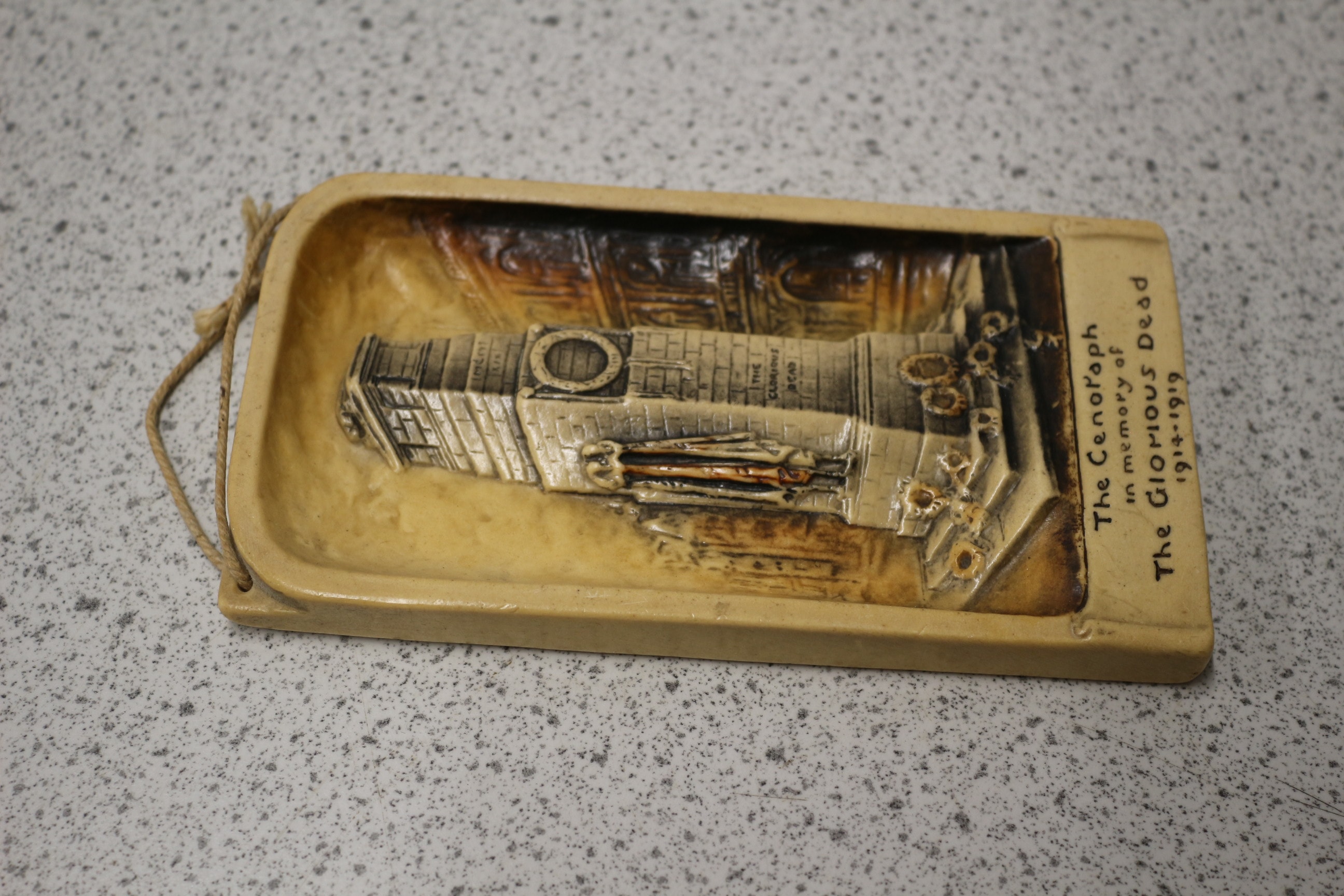 An Osborne Ivorex relief plaque depicting The Cenotaph. This rectangular plaque features a detailed representation of the war memorial, complete with draped flags and wreaths at its base. Cast in Ivorex, a material resembling plaster or resin, it exhibits an aged, yellowish patina with darker antiquing in the recessed areas, enhancing its depth. The front bears the inscription ‘The Cenotaph / in memory of / The Glorious Dead / 1914-1919’ at the bottom, mirroring ‘THE GLORIOUS DEAD’ visible on the monument within the relief. The reverse is marked ‘Regd No 699402’ and ‘MADE IN Gt BRITAIN’. A jute rope is attached at the top for hanging. 15.5cm