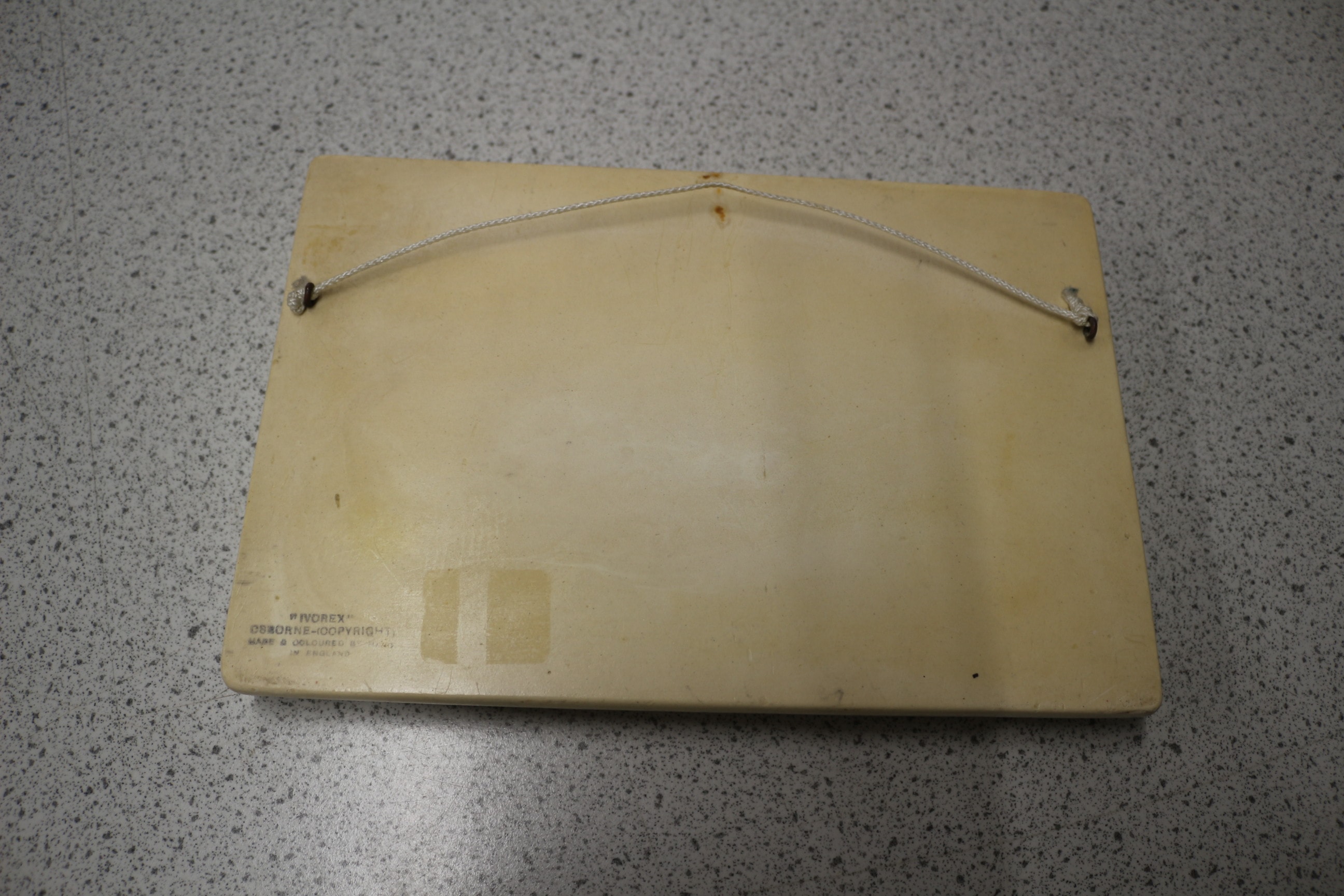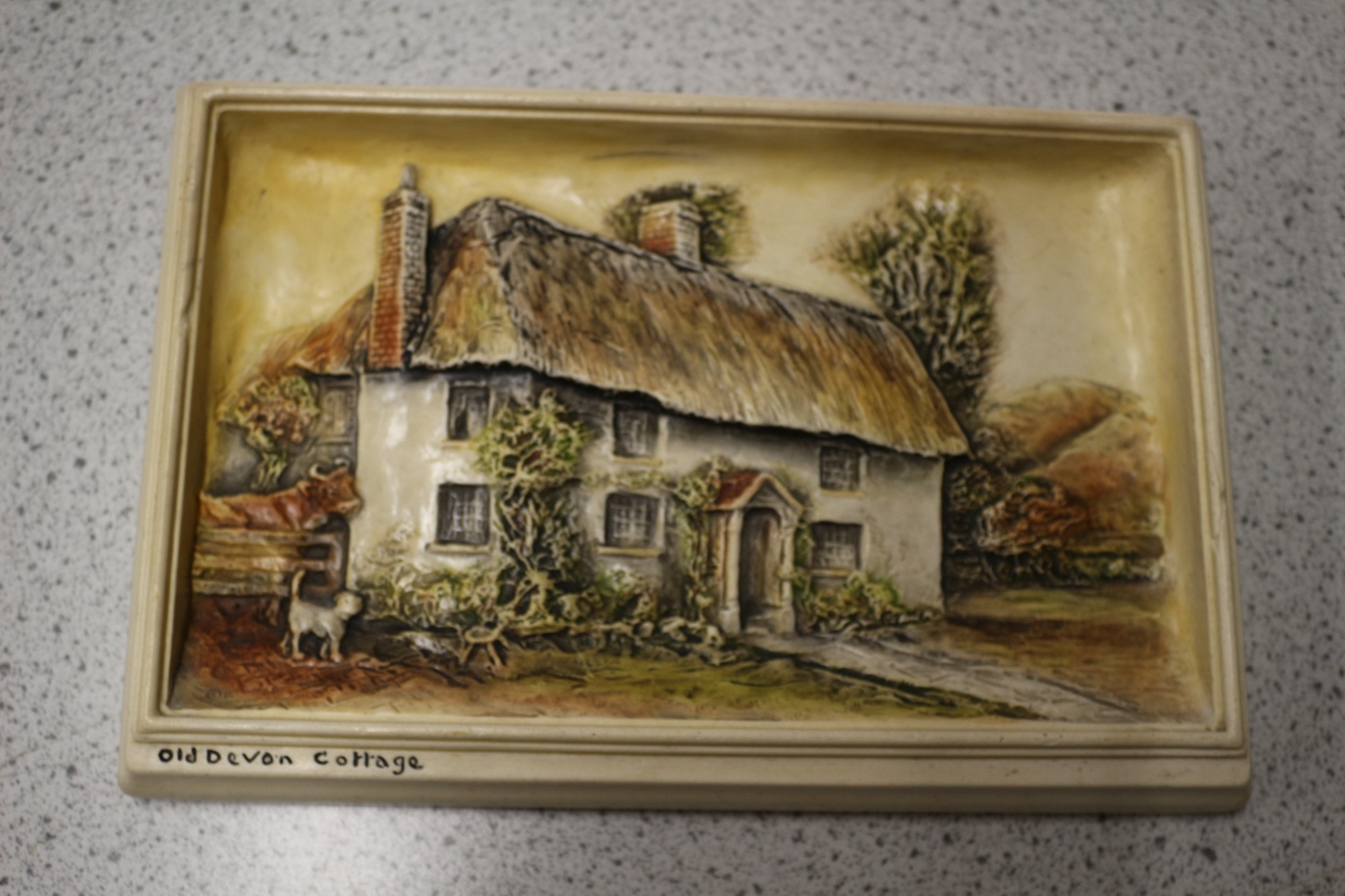 An Arthur Osborne Ivorex wall plaque, crafted from a molded composite material, depicting a picturesque English rural scene. The central image features a naturalistically rendered thatched cottage with surrounding foliage, a cow, and a dog, set against a hilly landscape. Inscribed on the front bottom left is the title “Old Devon Cottage.” The reverse side bears stamped markings including “PUROX, ” “OSBORNE – COPYRIGHT, ” and “MADE & DESIGNED IN ENGLAND.” The item is equipped with a hanging cord. 23.5x16cm