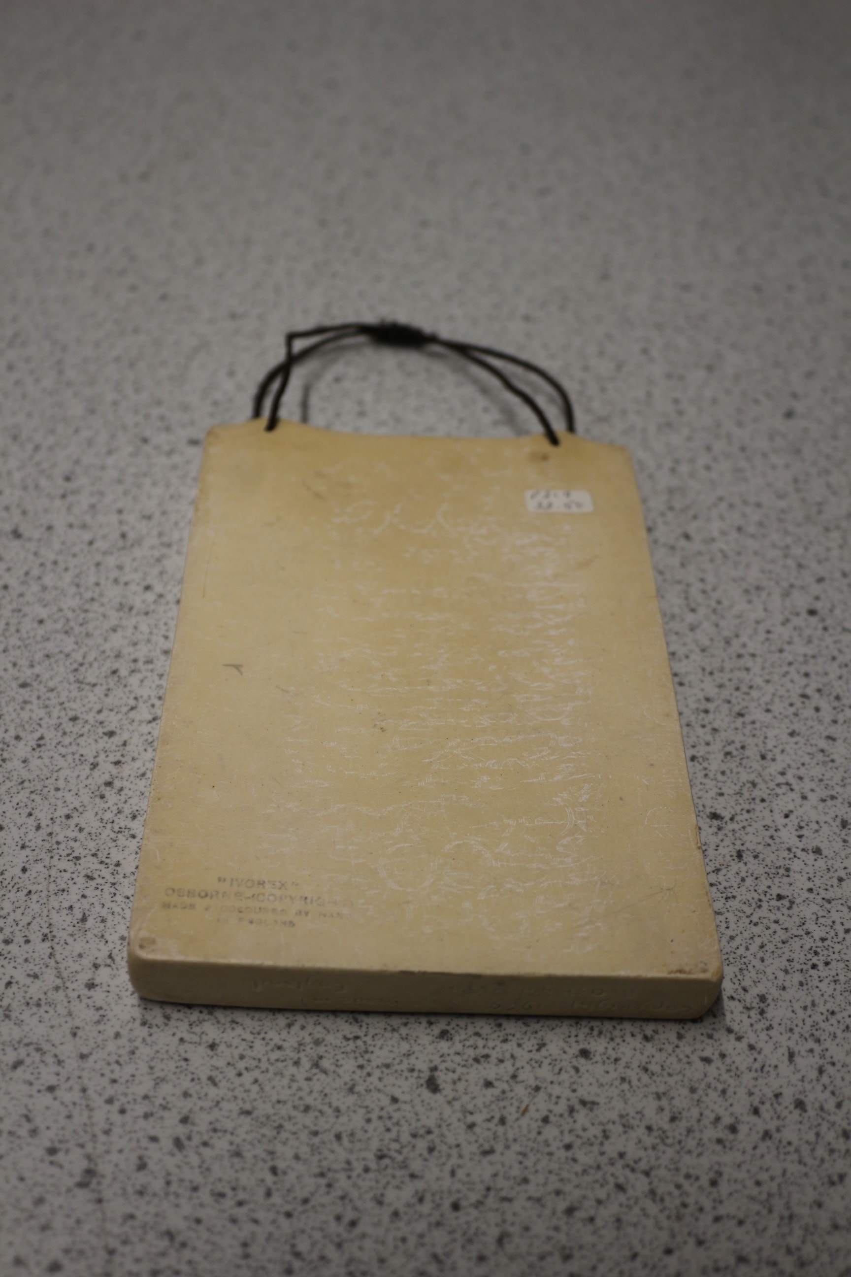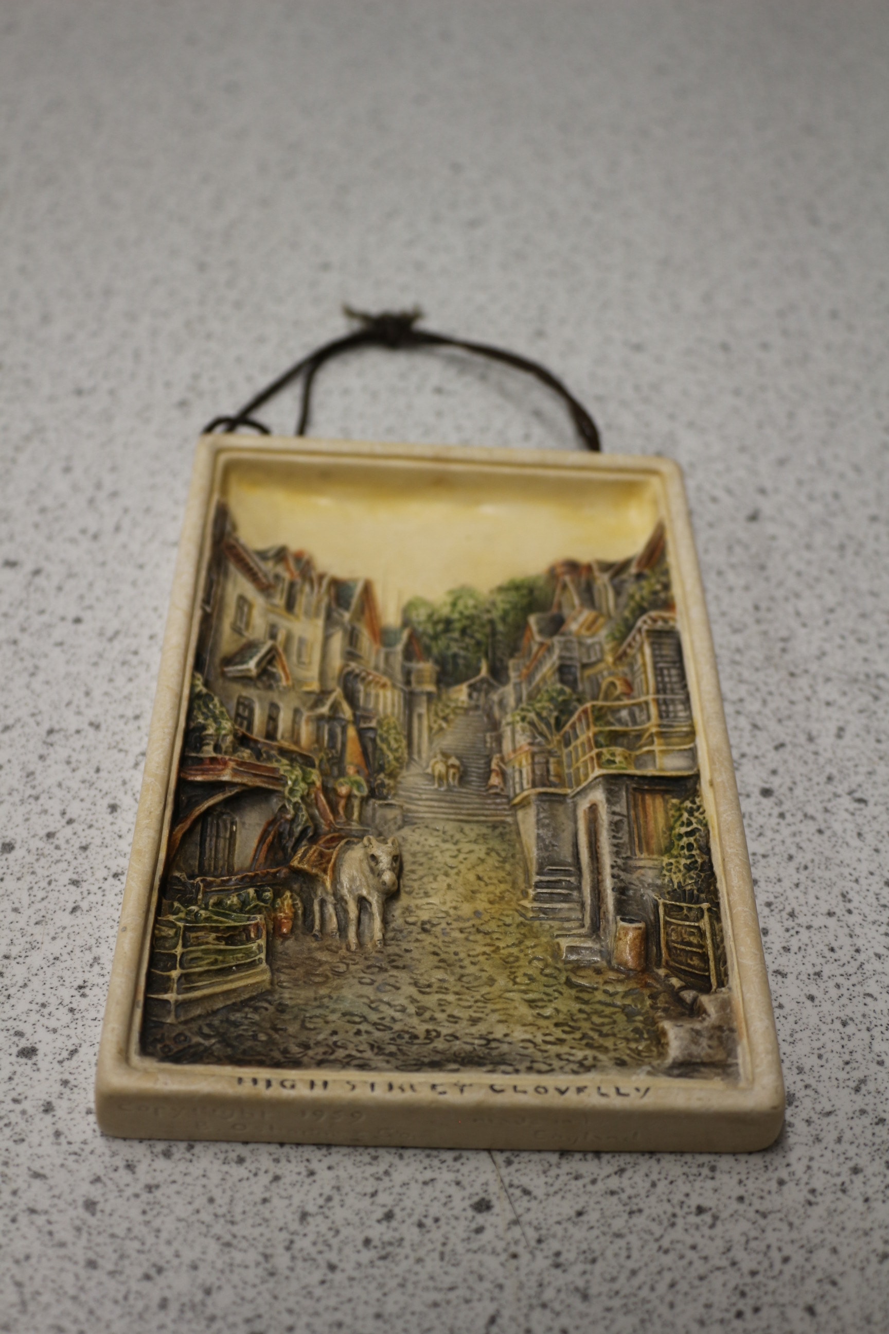An Osborne Ivorex relief wall plaque depicting ‘High Street Clovelly’. This hand-painted rectangular plaque features a three-dimensional scene of a European-style cobblestone street lined with buildings and figures, with the inscription “HIGH STREET CLOVELLY 1979” on the front. The reverse is marked “W. IVOR”, “OSBORNE & CO. LTD.”, “MADE & HAND-PAINTED BY HAND”, and “ENGLAND”, along with a handwritten “£7.50” price sticker. A dark cord is attached at the top for hanging. The plaque is dated 1979 and is likely made of a cast resin or composition material, commonly known as Ivorex or chalkware. 16.5x11cm