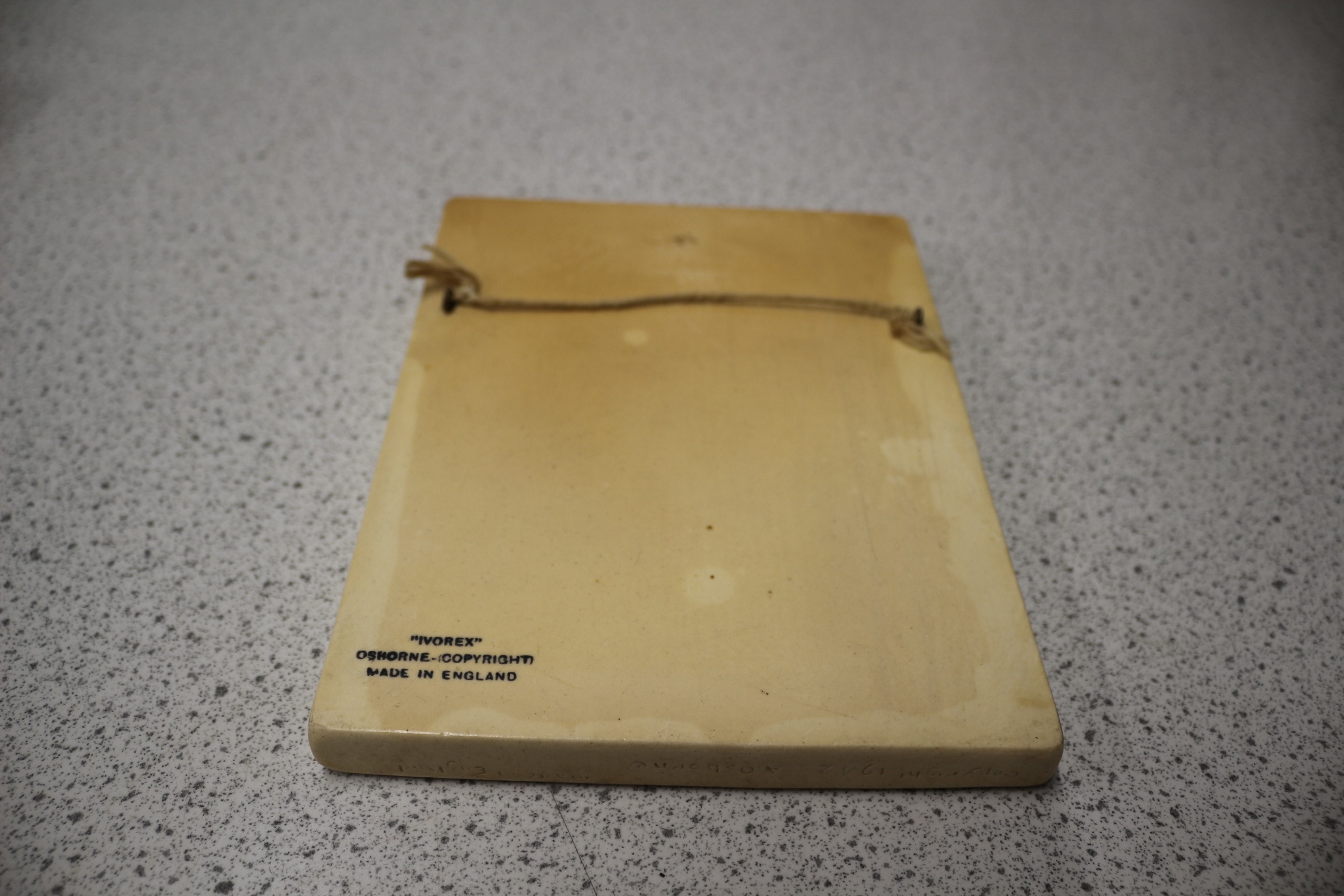 An Ivorex Osborne bas-relief wall plaque, depicting ‘The Weavers Canterbury’ as inscribed on the front. The rectangular plaque is crafted from an off-white molded composition material, identified as ‘Ivorex’ on the reverse. It features a three-dimensional scene of a picturesque European canal or river lined with half-timbered buildings, with a small boat containing a single figure in the foreground. Hand-painted details enhance the relief. The reverse is marked “OSBORNE-COPYRIGHT” and “MADE IN ENGLAND”, and includes a simple string for hanging. 20x15cm