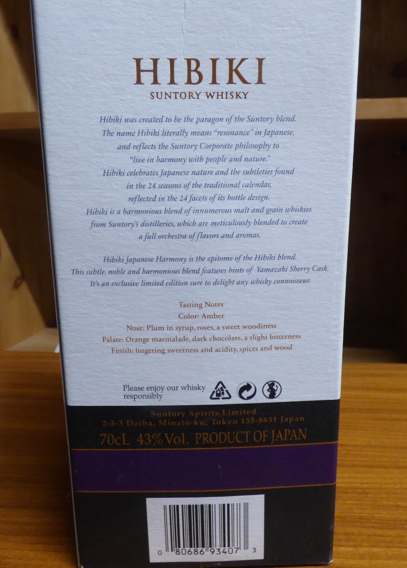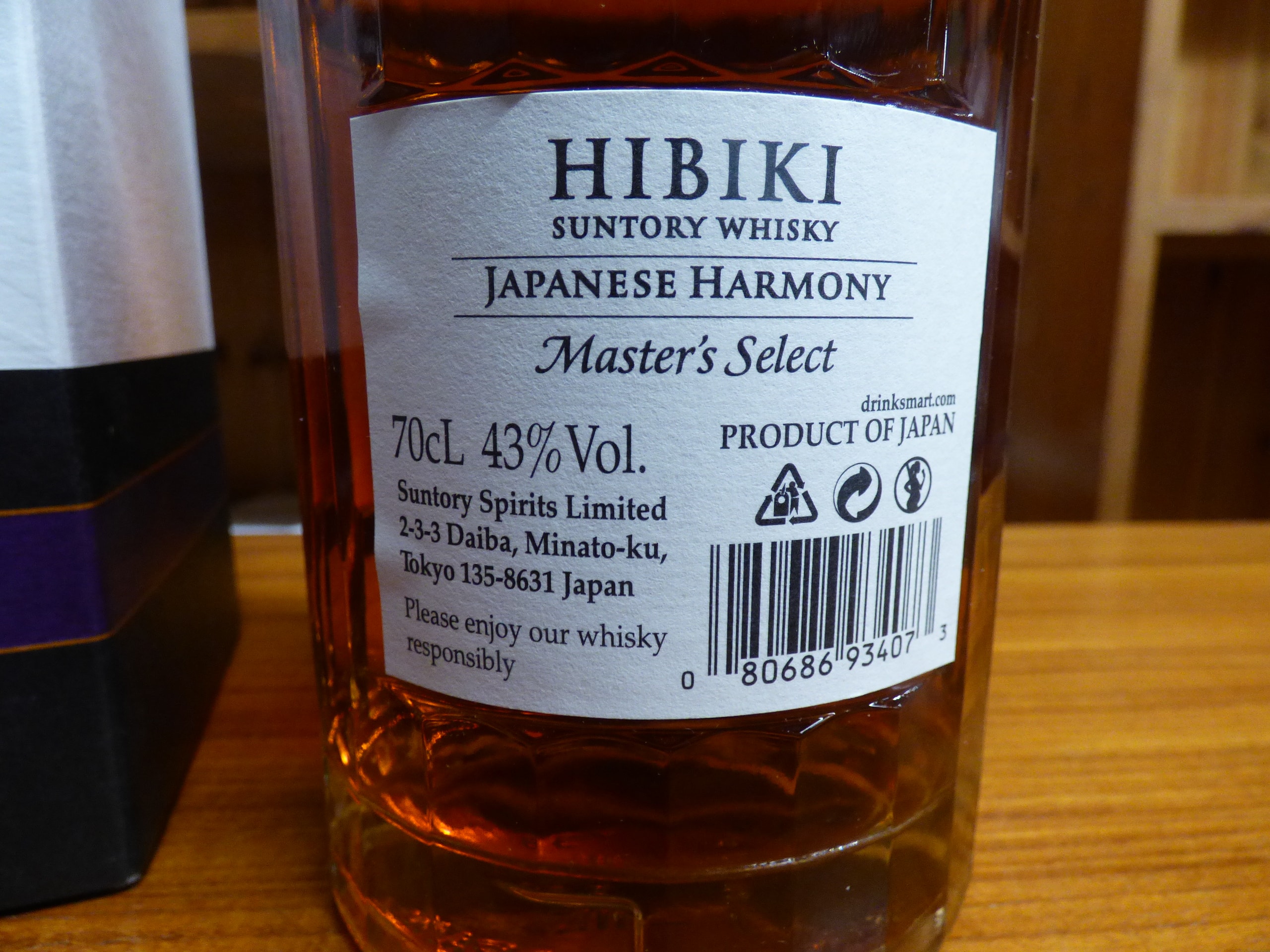 A contemporary Japanese whisky, identified as Suntory Hibiki Japanese Harmony Master’s Select. The glass bottle contains an amber-colored liquid and features paper labels prominently displaying the Japanese character 響 (Hibiki). The labels also state “HIBIKI SUNTORY WHISKY JAPANESE HARMONY Master’s Select, ” “70cL 43%Vol., ” and “PRODUCT OF JAPAN, ” with manufacturer details for Suntory Spirits Limited. The accompanying cardboard retail presentation box mirrors the bottle’s labeling, providing additional context including tasting notes and an explanation of the brand name.