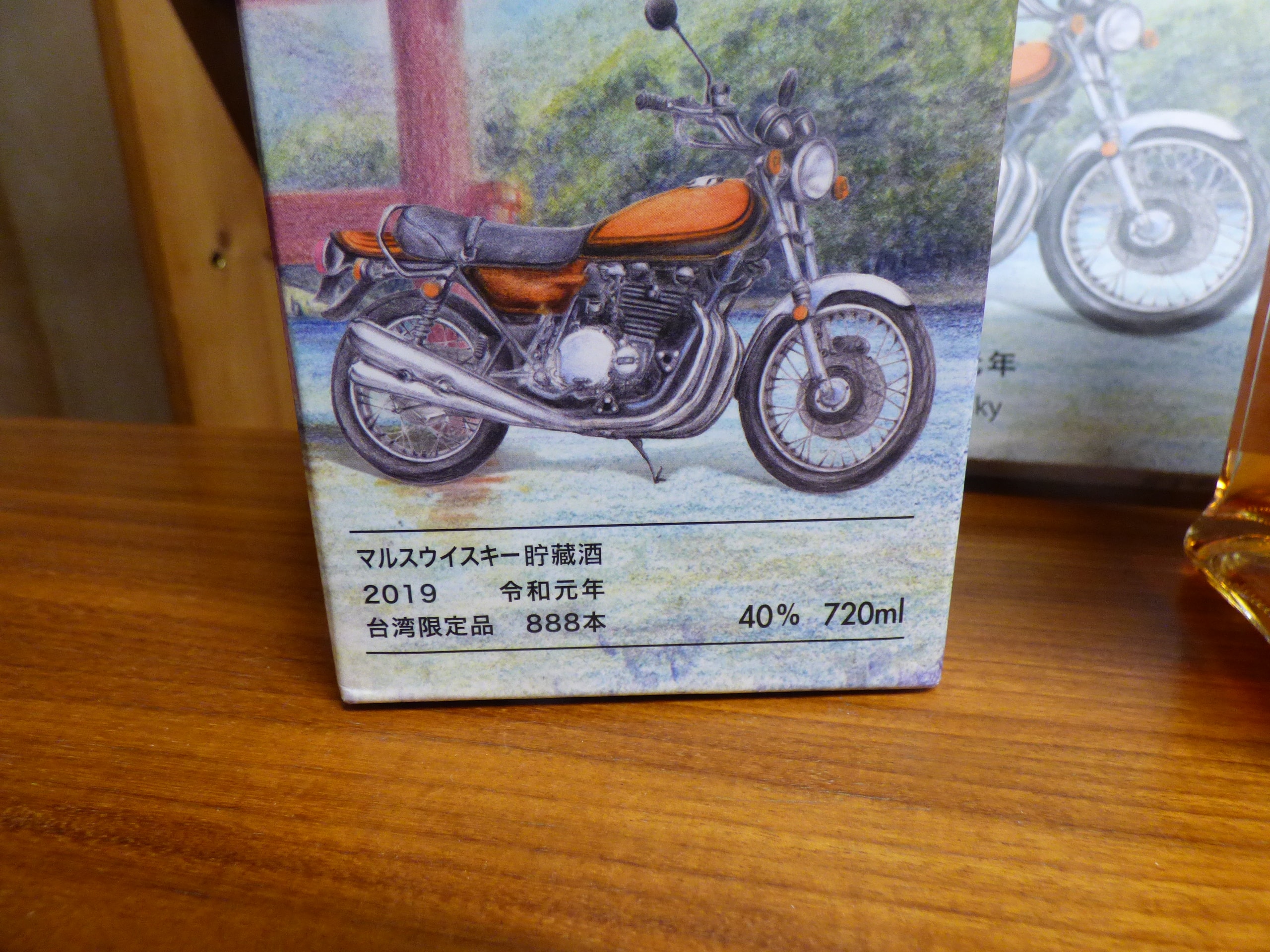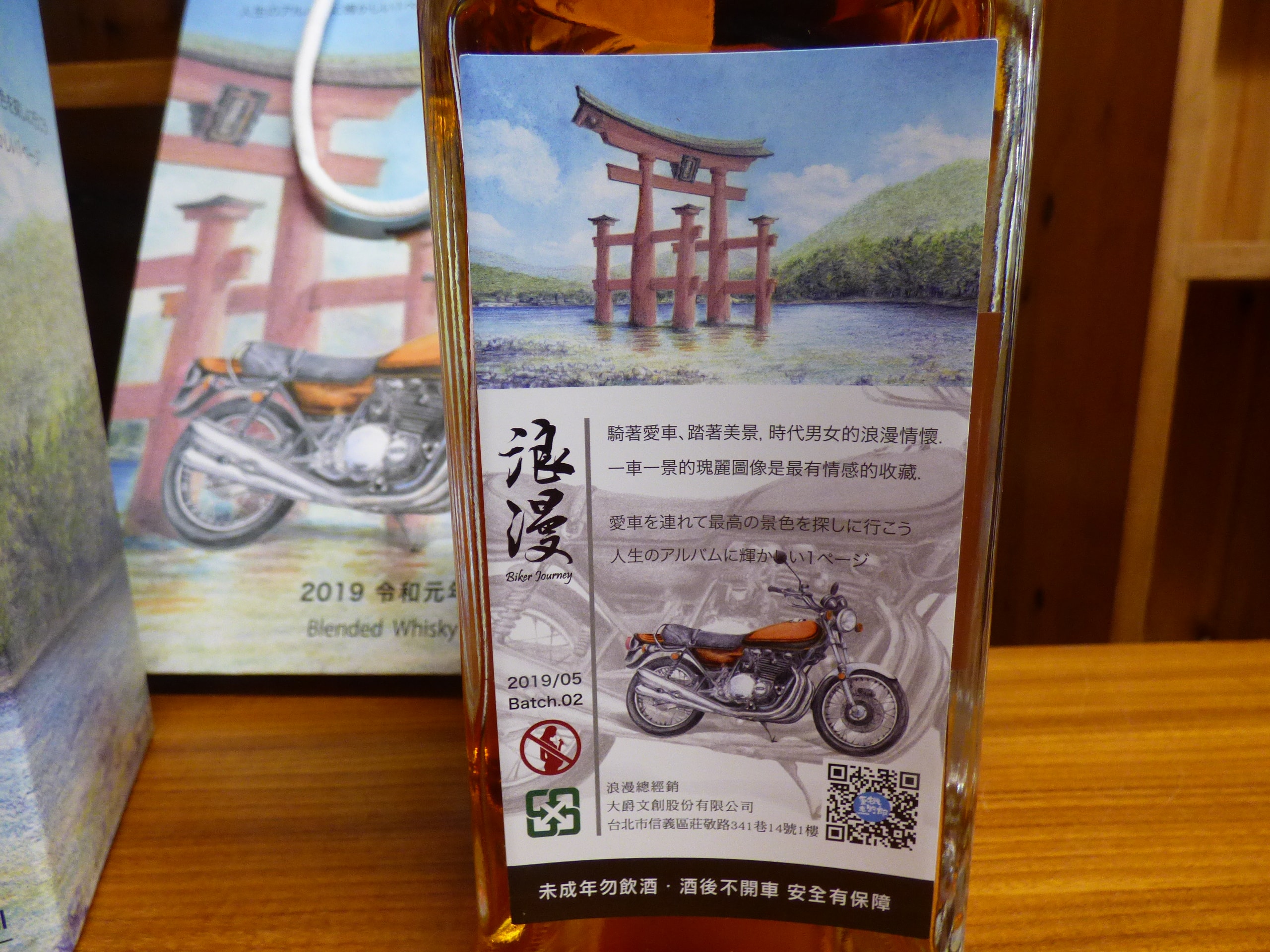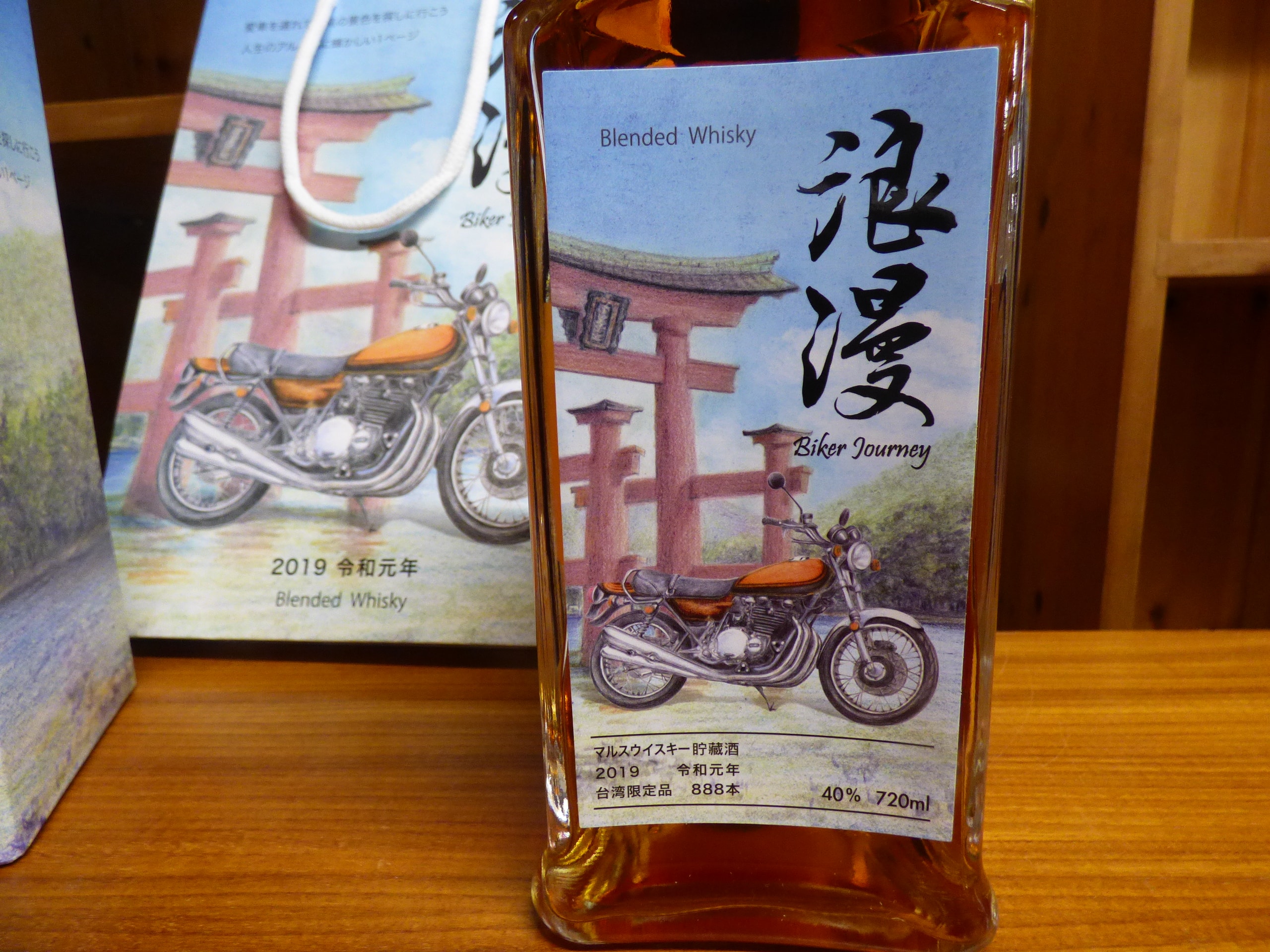 A Mars Kura Whisky Biker Journey 2019 Batch 02, Taiwan Limited Edition, comprising a 720ml glass bottle of Mars Blended Whisky, its matching cardboard retail box, and a paper gift bag. The amber-colored whisky bottle is front-labeled “Blended Whisky” and prominently features the Japanese calligraphy “浪漫” (Roman, meaning Romance or Romantic) along with “Biker Journey, ” below an illustration of a vintage motorcycle and a torii gate. The packaging indicates dating to “2019 令和元年” (2019, the first year of the Reiwa era), specifies it as a “台湾限定品” (Taiwan Limited Edition) of “888本” (888 bottles), and has an alcohol content of 40% by volume. The rear label further identifies the producer as “本坊酒造株式会社” (Honbo Shuzo Co., Ltd.) and specifies malt and grain as raw materials. The rear label also notes “Batch.02”.
