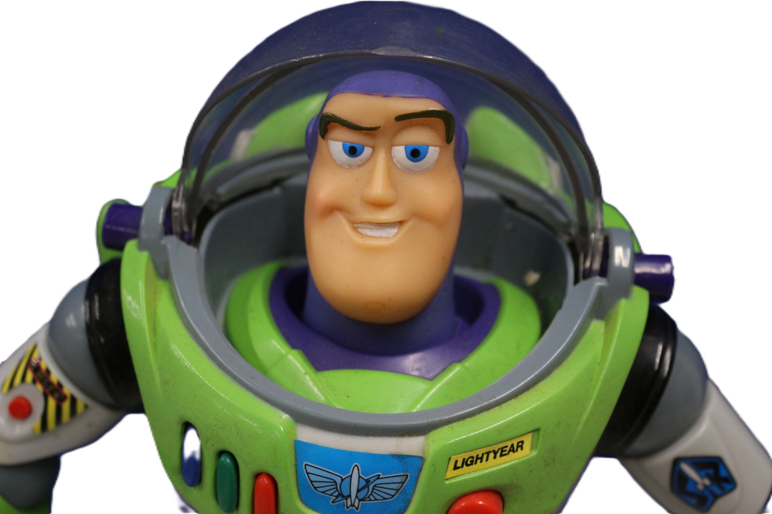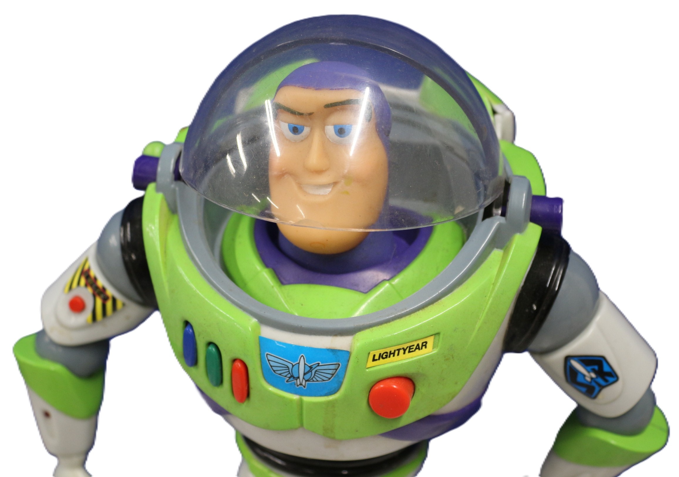 An articulated Buzz Lightyear action figure from Disney Pixar’s Toy Story, crafted from molded plastic. The figure features his iconic green, white, and purple space suit with a clear dome helmet. Visible markings include “LIGHTYEAR” on a chest label, a stylized winged emblem, and “© DISNEY PIXAR” molded into the back. 30cm
