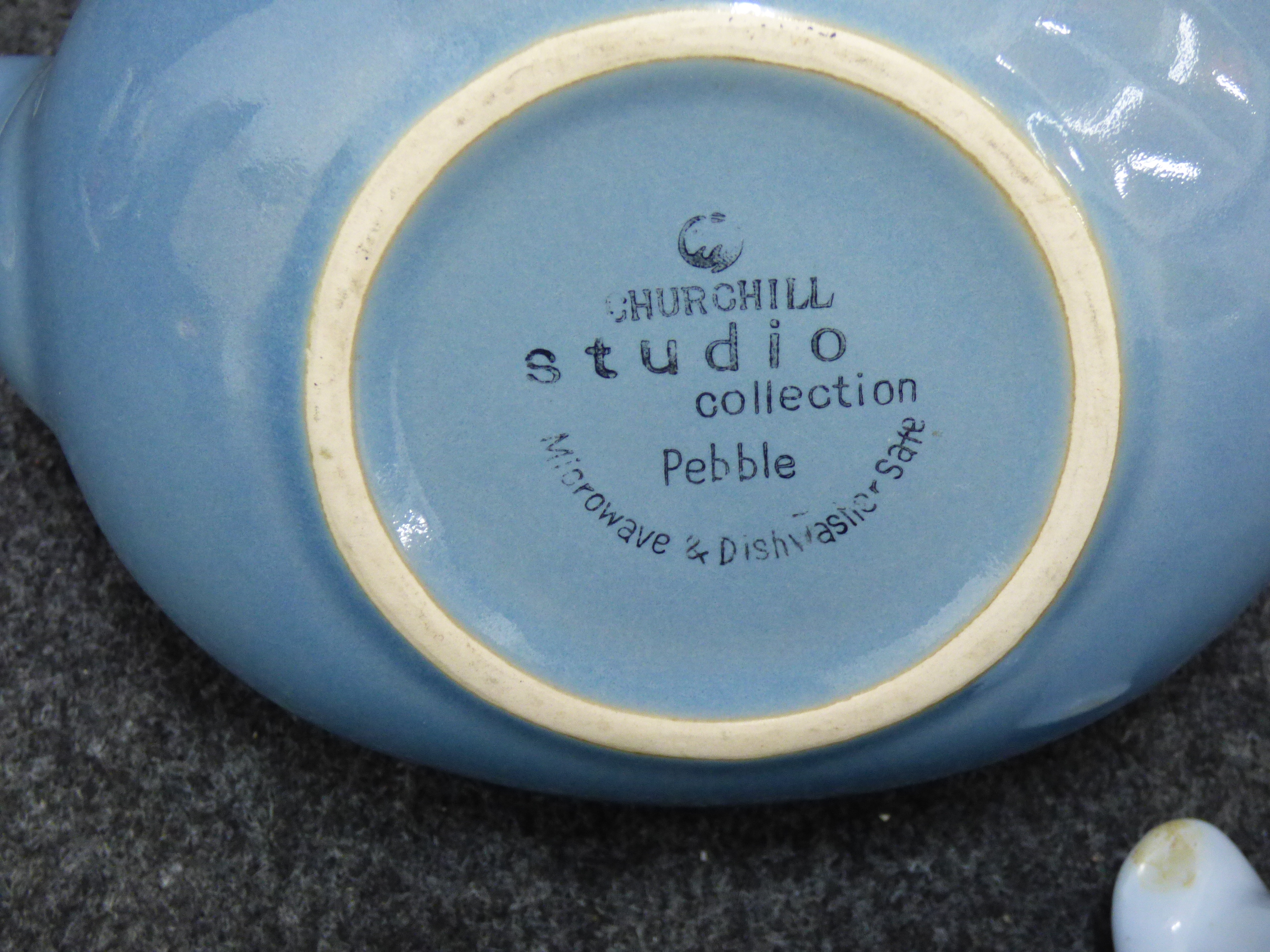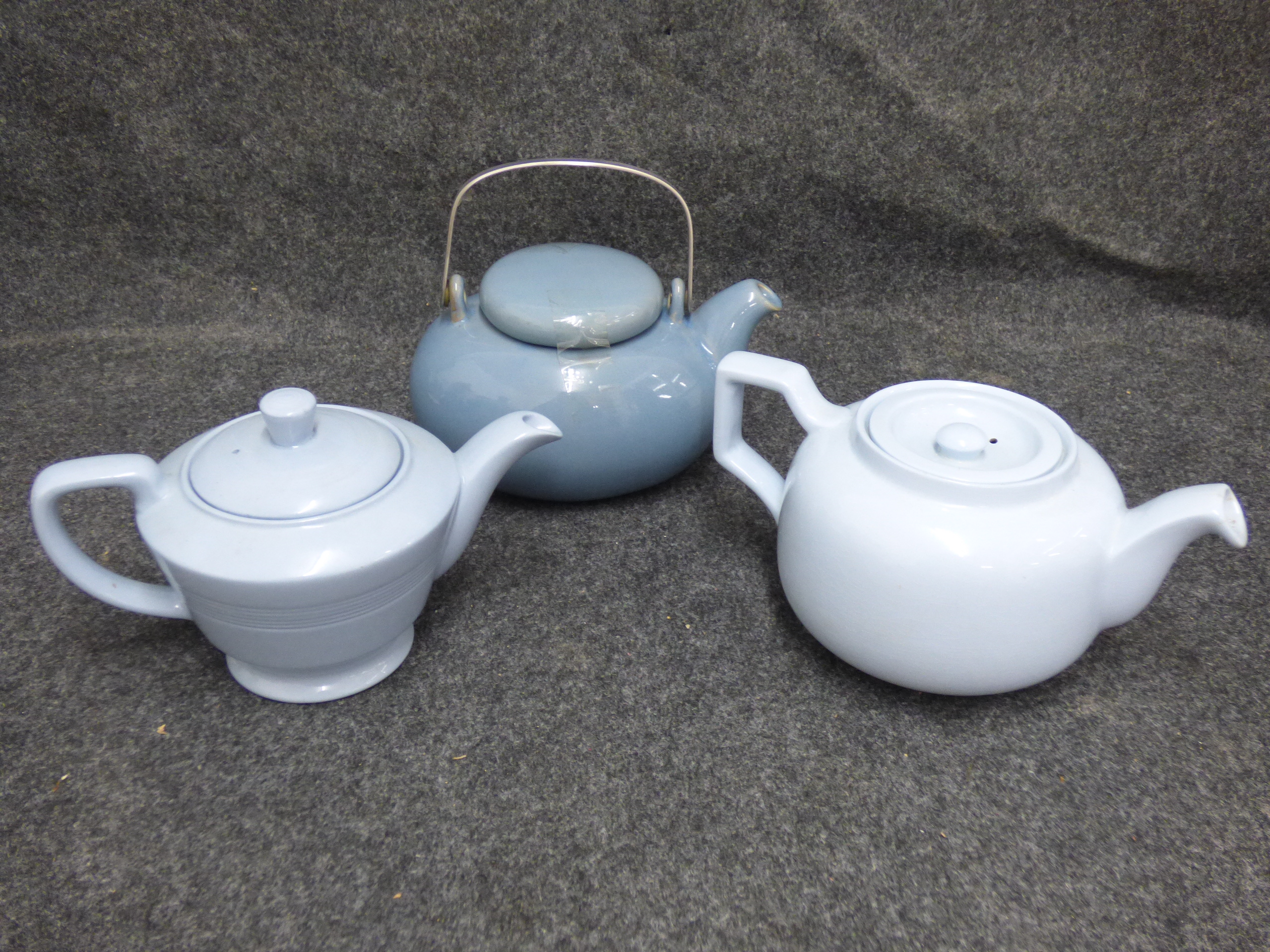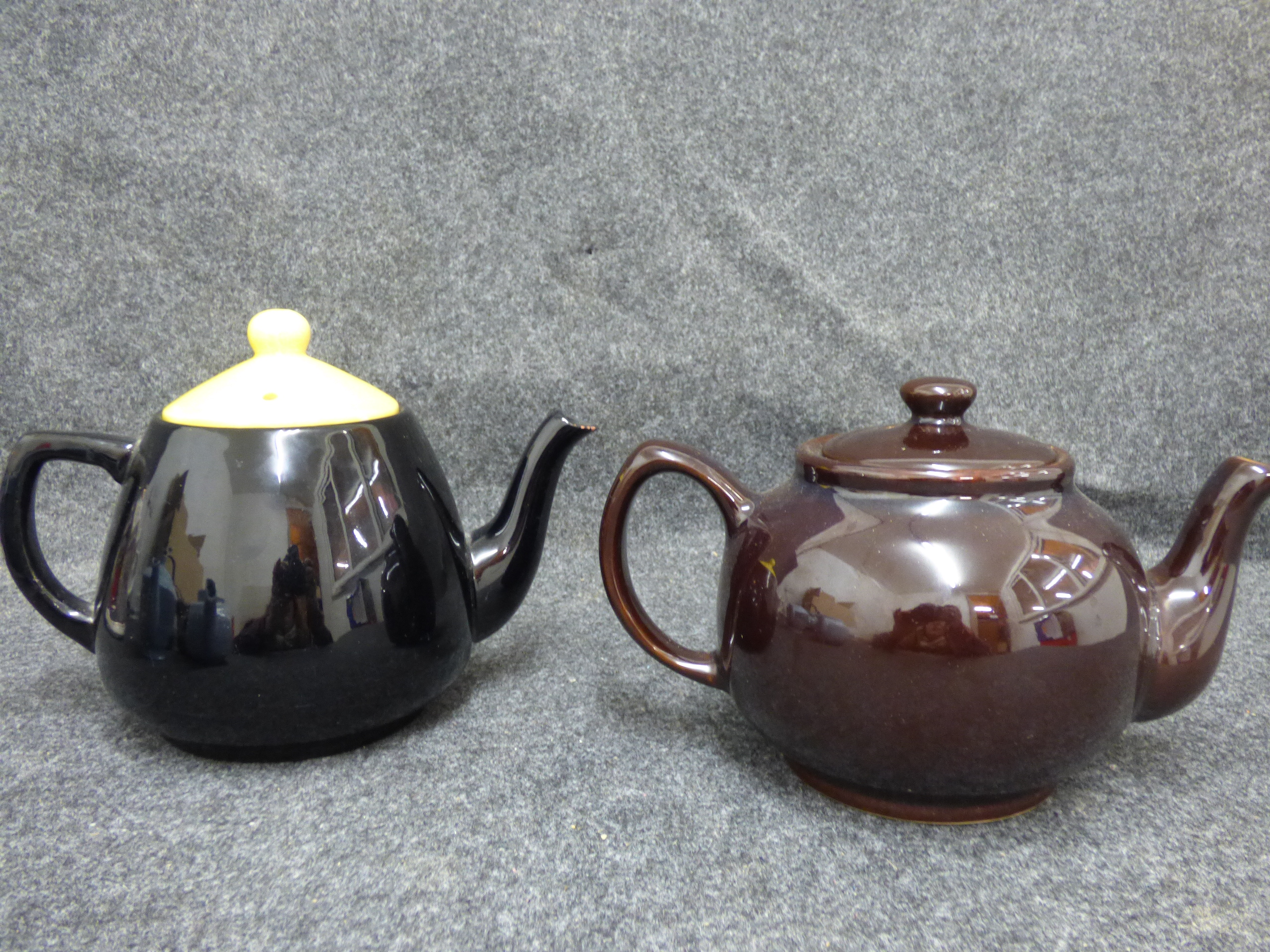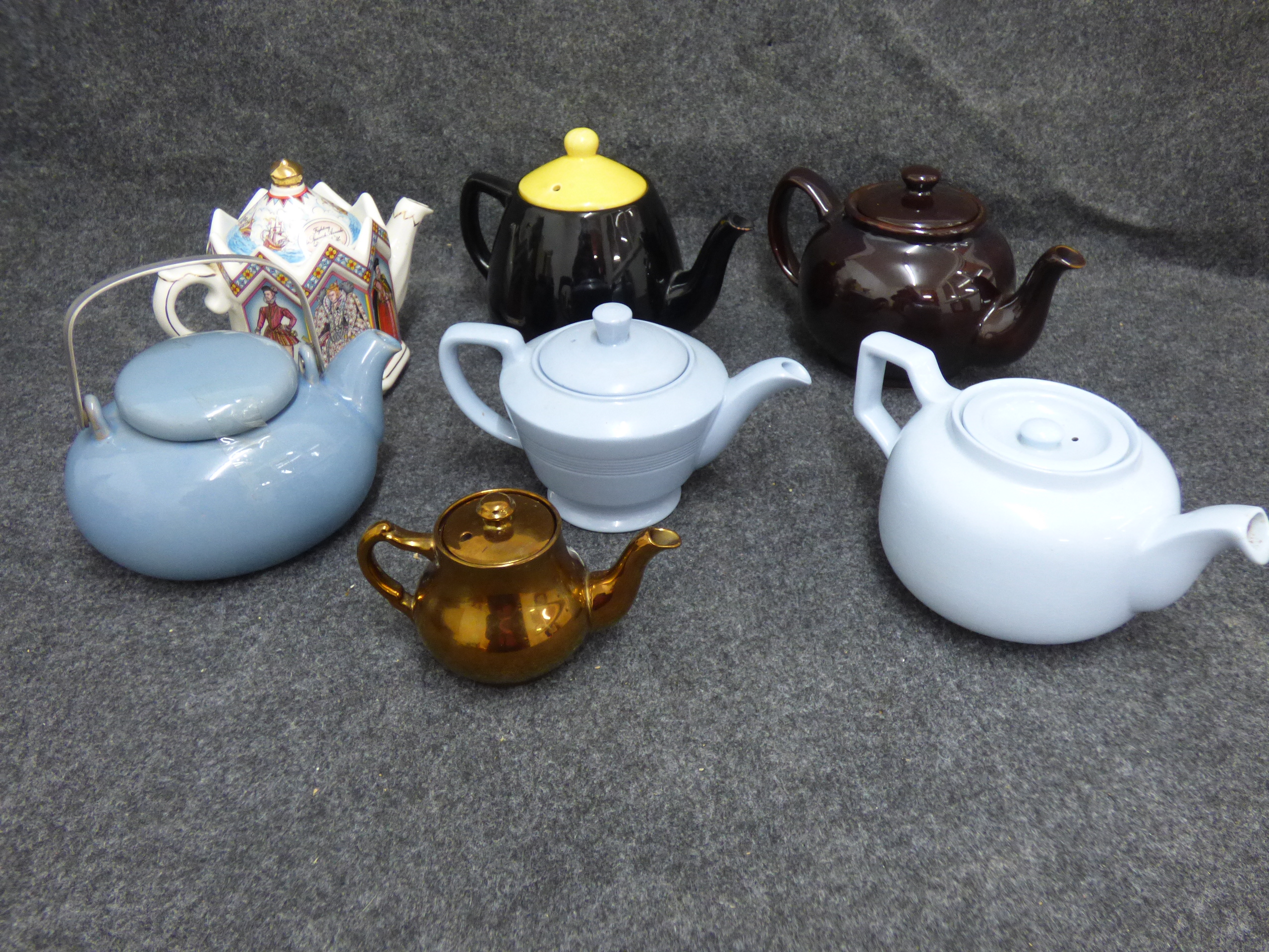 A collection of several ceramic teapots in various colours and styles featuring makers such as Price and Kensington, Johnson Bros, Churchill, Woods Ware, Sadler, and G.W.S. Ltd.