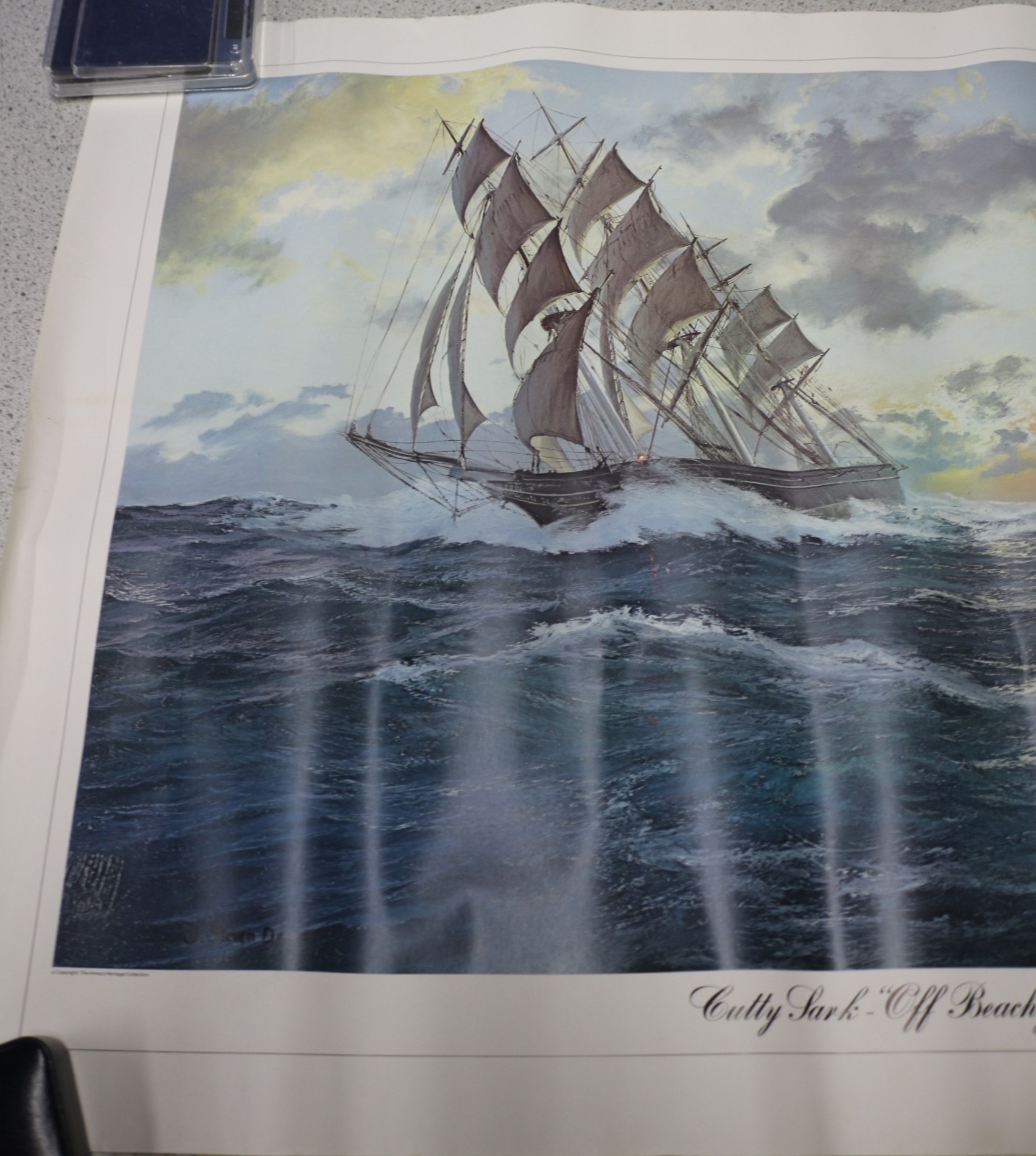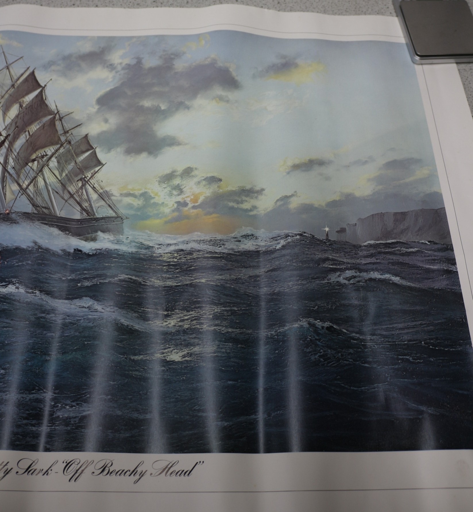 A large format colour print on paper titled ‘The Cutty Sark off Beachy Head’ by John Steven Dews (b. 1949). The print depicts a realistic marine scene of the multi-masted sailing ship “Cutty Sark” navigating turbulent waters near a cliff-lined coast with a visible lighthouse. The print is further titled “Cutty Sark – ‘Off Beachy Head'” in elegant script at the bottom centre. Faint and partially obscured copyright information is visible in the lower left corner, along with what appears to be an indistinct artist’s signature within the image area. 87×62.5cm