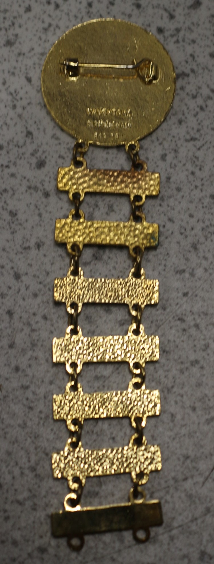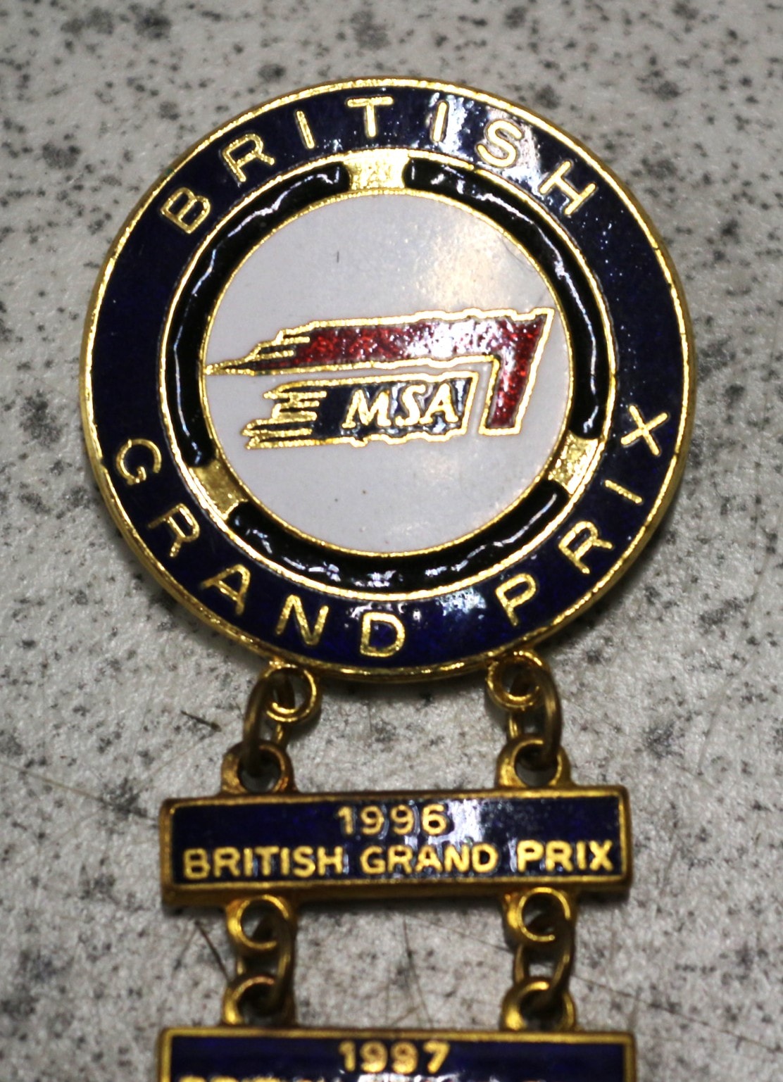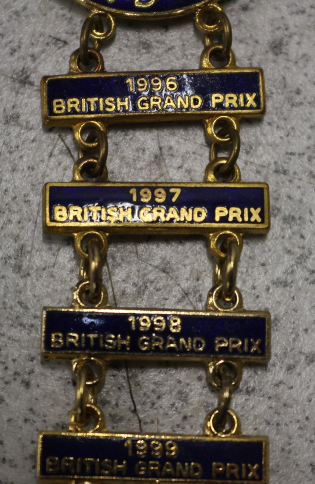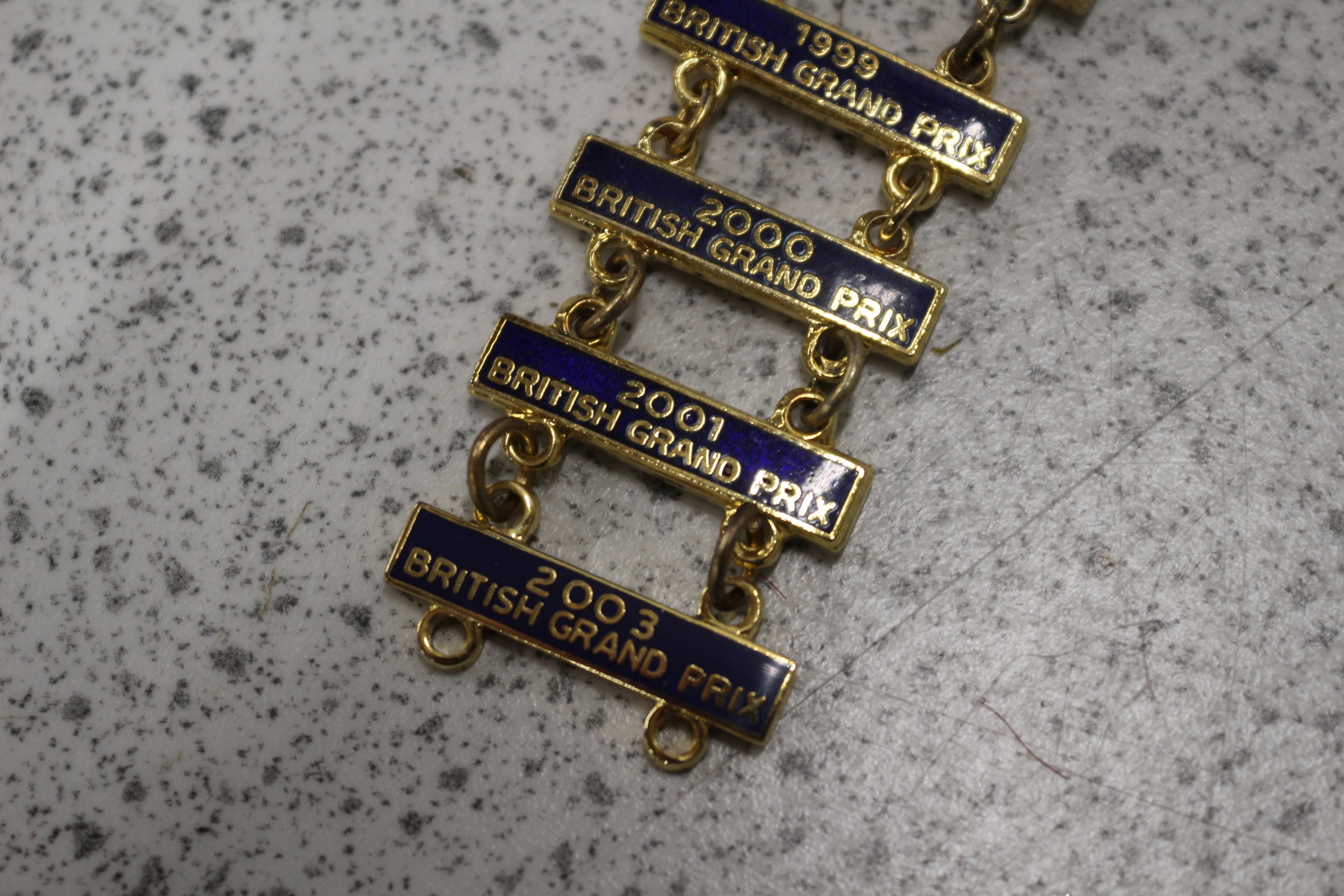 A commemorative British Grand Prix year bar badge, comprising a central circular medallion with a series of seven rectangular year bars attached below. The badge is constructed from gold-tone metal with dark blue and white enamel inlay. The main circular badge is inscribed “BRITISH GRAND PRIX” around its perimeter and features a central logo depicting a stylized racing element identifying “MSA” and a numeral. Each subsequent rectangular bar, linked by small rings, is inscribed with a specific year followed by “BRITISH GRAND PRIX, ” with visible dates ranging from 1996 to 2001, and a partially visible 2003. The reverse of the top medallion is marked “MADE IN ENGLAND” and “MOTOR SPORTS ASSN. LTD., ” and features a standard safety pin clasp.