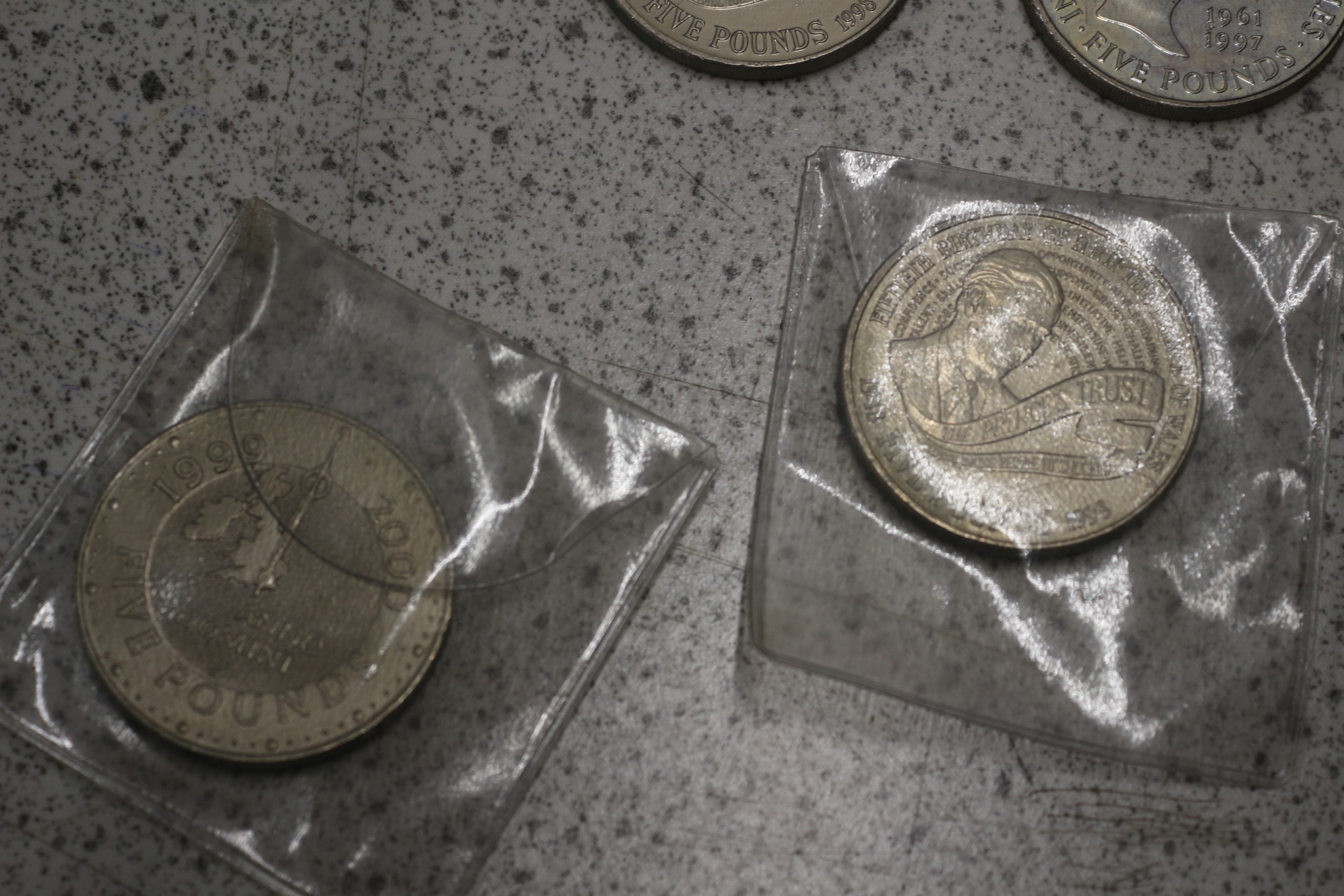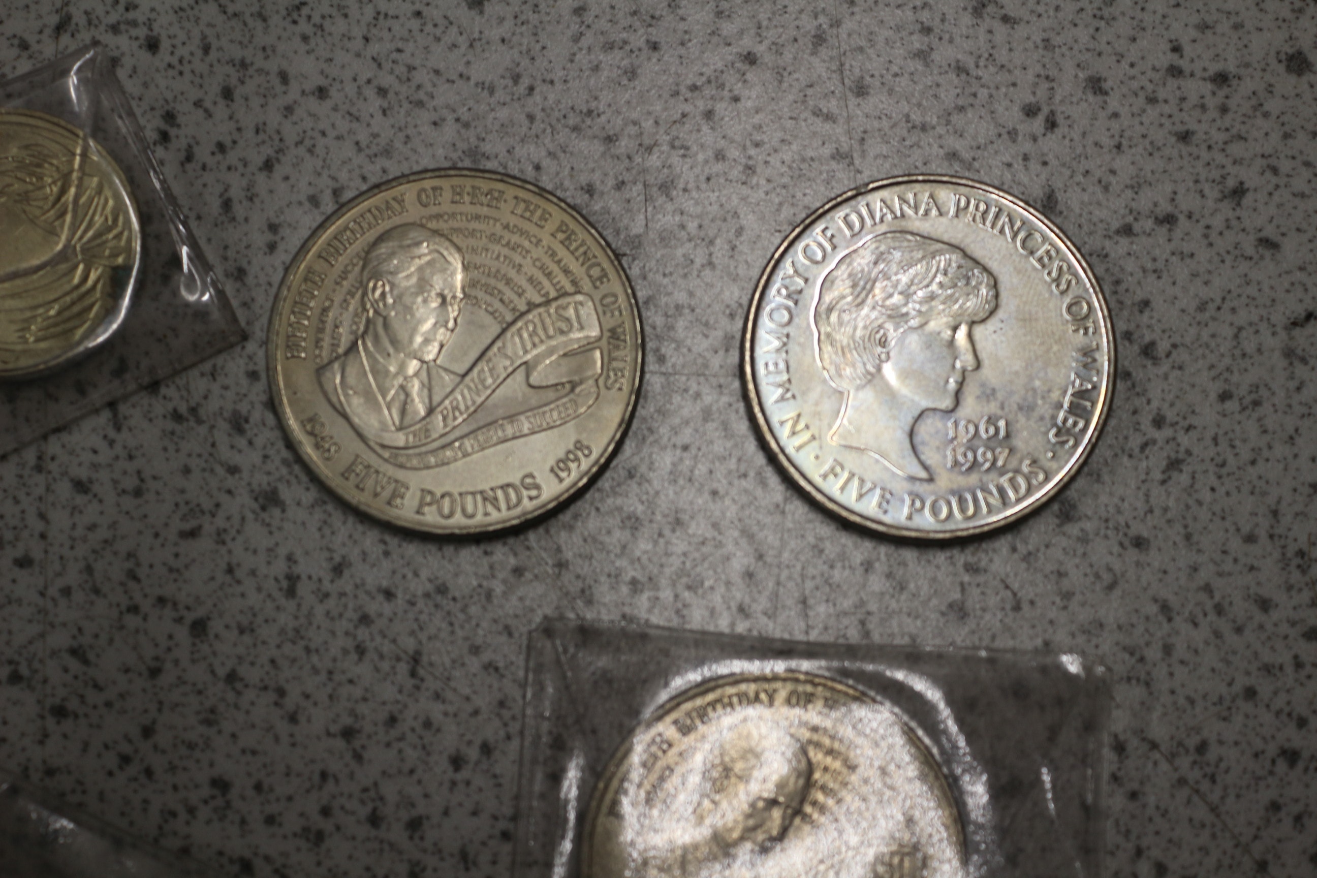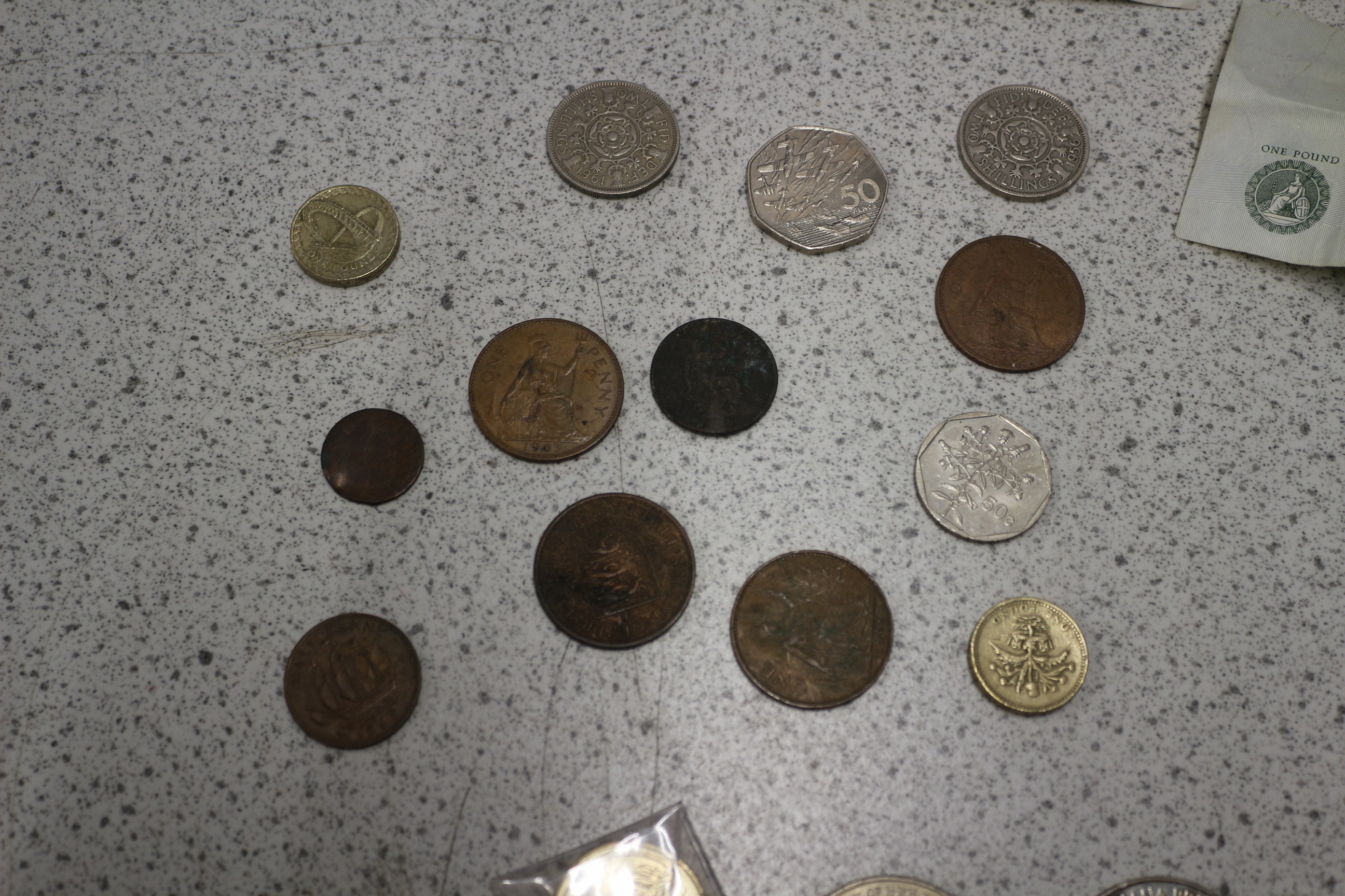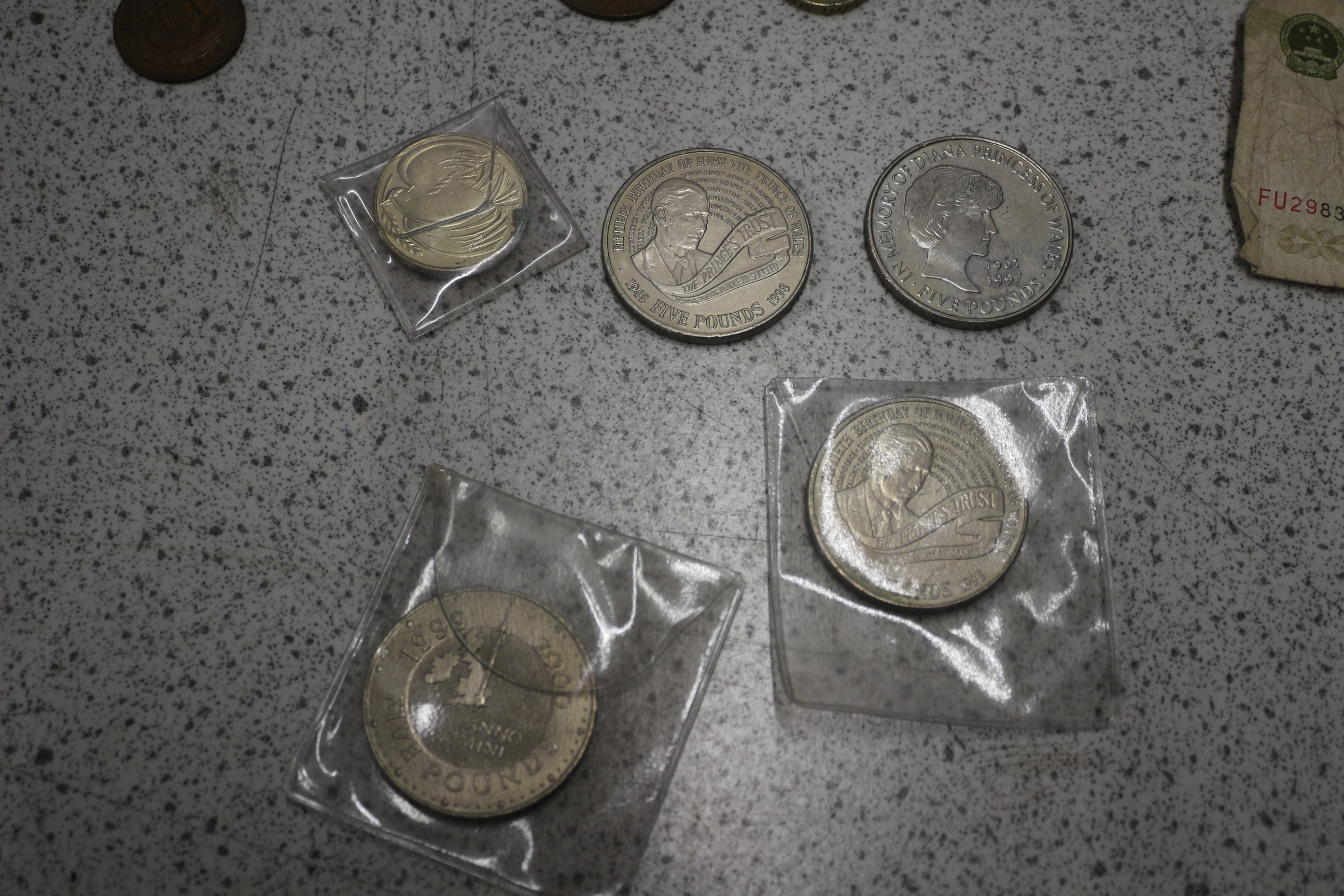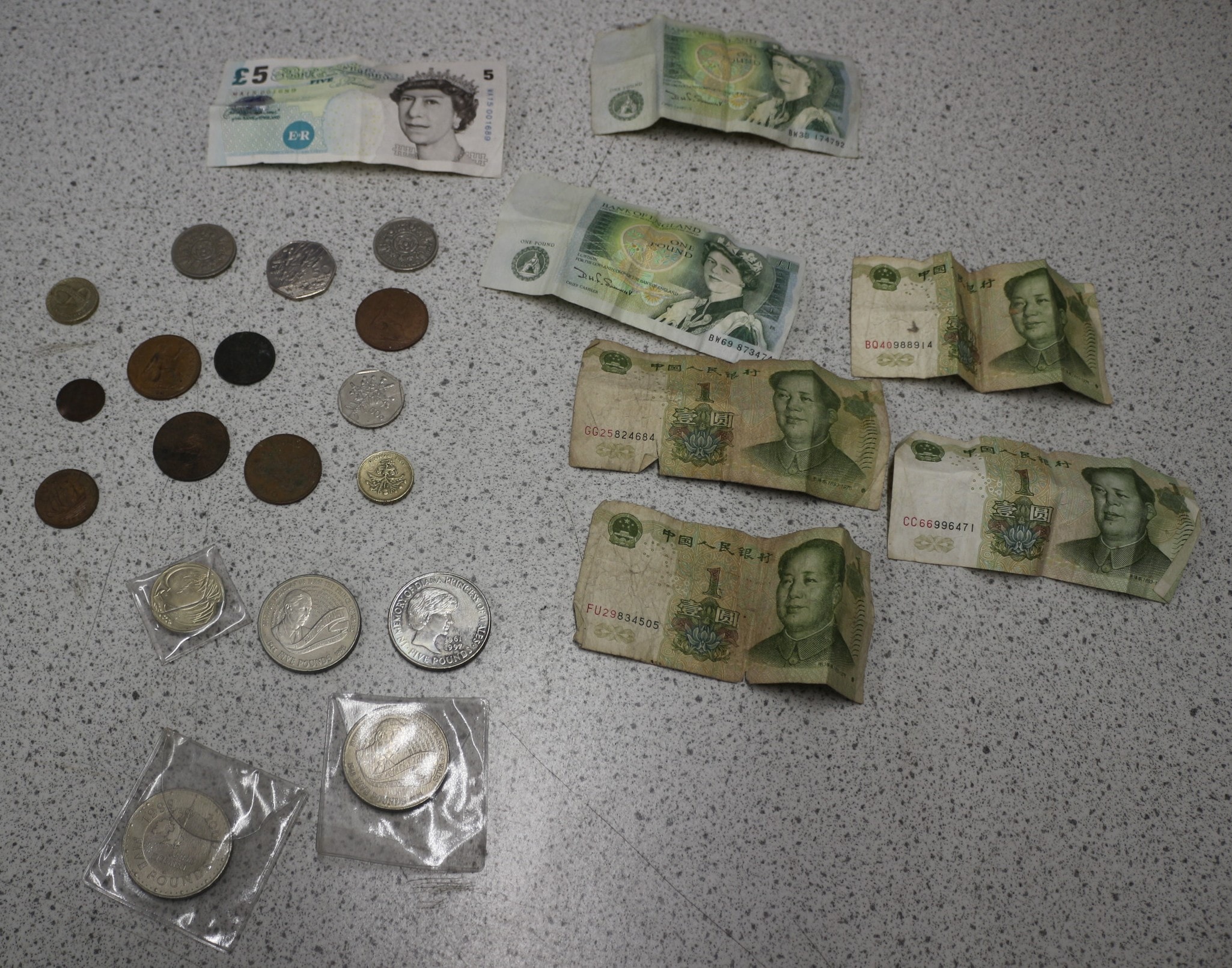 This collection comprises a group of international banknotes and coinage. The banknotes include one modern British £5 note and two £1 notes, both featuring Queen Elizabeth II. Also present is a group of Chinese 1 Yuan notes, marked “中国人民银行” (People’s Bank of China) and “壹圆” (one yuan), depicting Mao Zedong. The coinage is diverse, featuring a group of various British issues from different periods, including shillings, pence, and a 50-pence piece. Additionally, there are two modern commemorative silver-toned £5 coins, dated 1997 (“Memory of Diana Princess of Wales”) and 1998 (“The Prince’s Trust”), with some still sealed in protective plastic. The lot also includes a group of multiple older, worn, primarily copper-toned coins of indeterminate origin. The materials consist of paper for the banknotes and various metals for the coins.