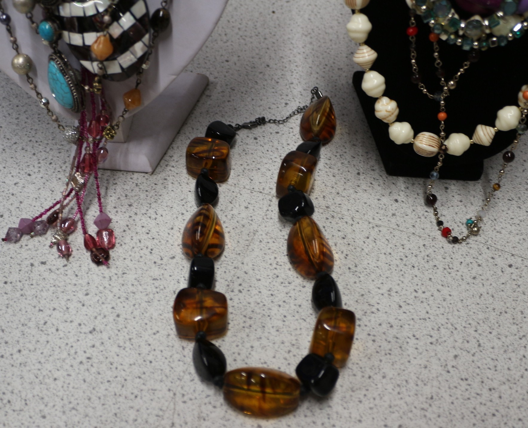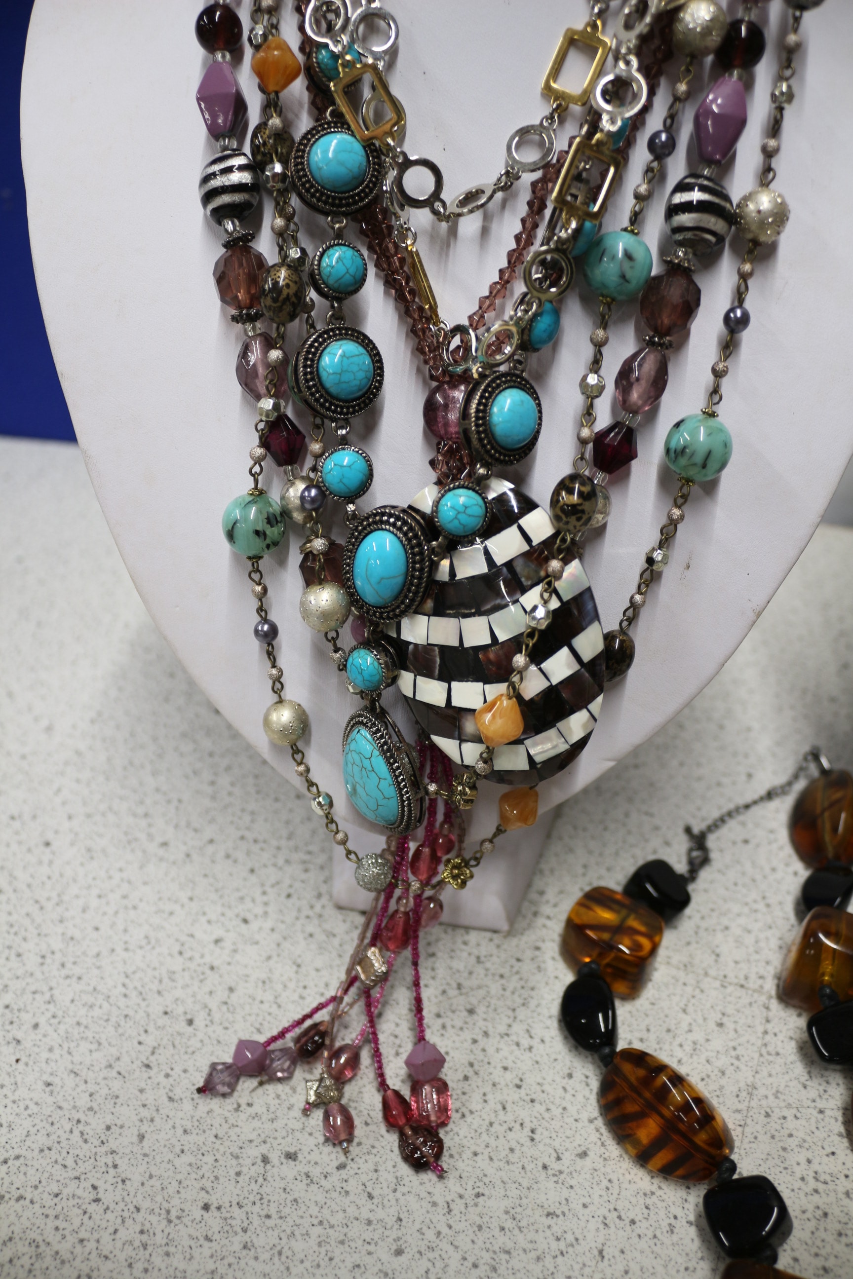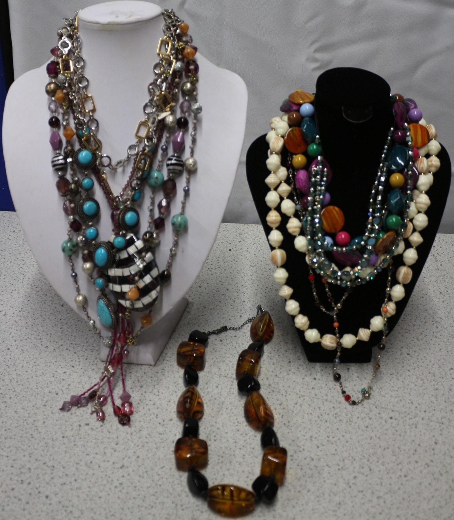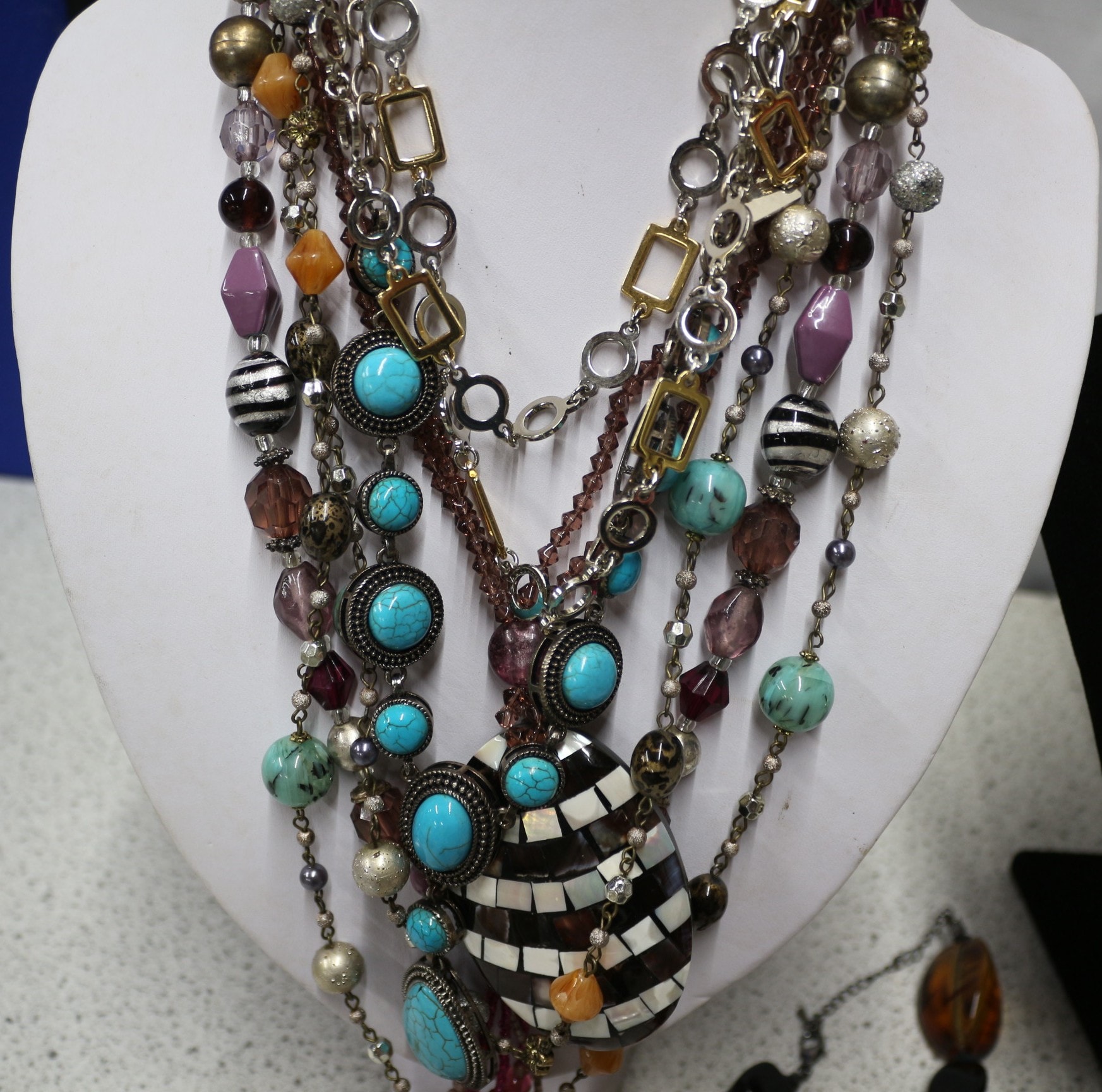 This lot comprises approximately 10+ assorted necklaces. The group displayed on the white mannequin features chunky, layered designs, each exhibiting an eclectic style. No discernible manufacturer’s marks or text are visible on any of the items.