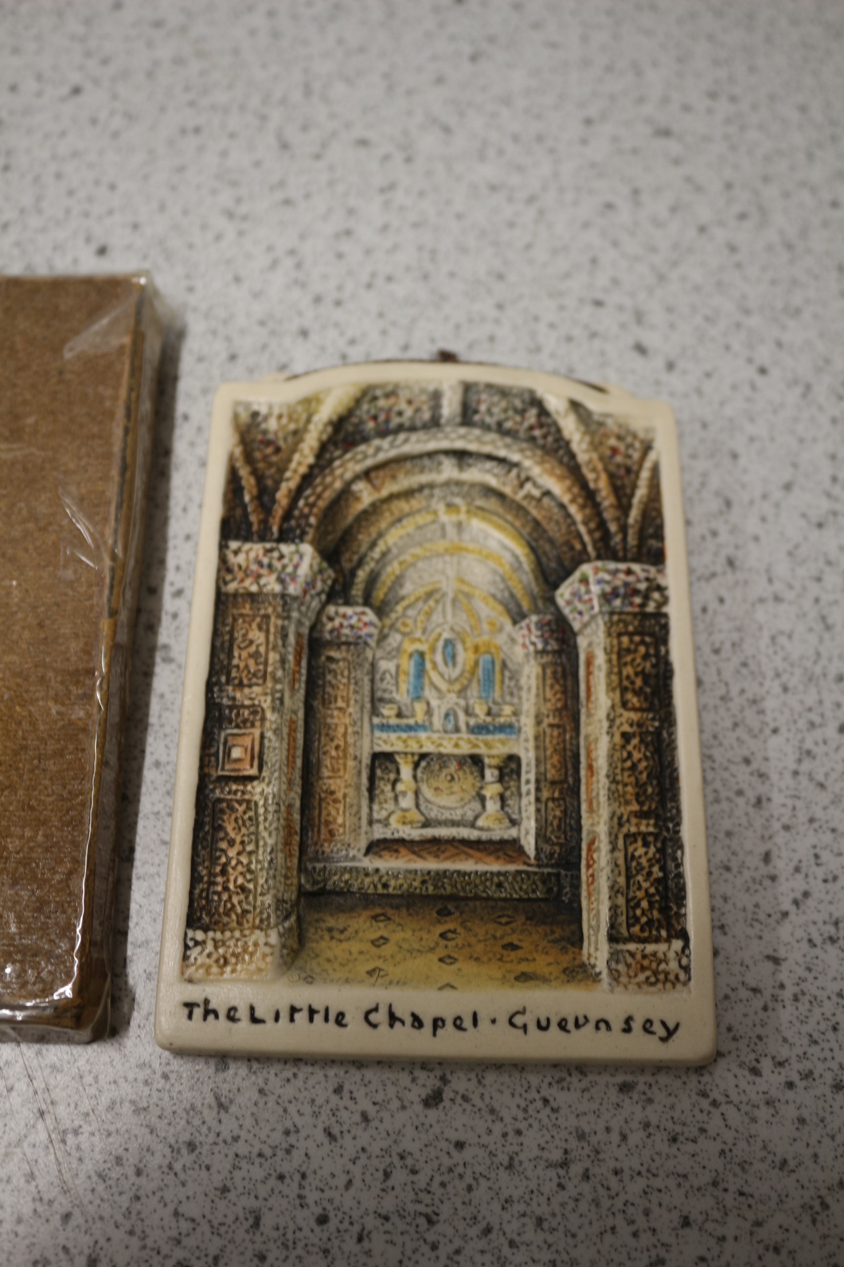 A rectangular decorative wall plaque, likely crafted from a ceramic-like material such as plaster or resin, featuring a detailed, hand-painted relief sculpture. The artwork depicts the ornate interior of a chapel, characterized by architectural arches, columns, and an intricate altar, executed in a rustic or folk art style. Inscribed on the lower front in black script is “The Little Chapel · Guernsey”. A small string loop is affixed to the top for hanging. The plaque is accompanied by its plain brown cardboard packaging, which is factory-sealed in clear plastic film. 12.5cm
